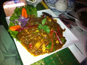 Over the past few years, I was fortunate enough to befriend Jas, the rambunctious, kind, incredibly sweet and jolly owner, for whom Jitlada is a family-run labor of love. Her brother is the main cook, and other family work as hosts and wait staff. The menu is daunting, with hundreds of dishes sprawling over multiple laminated pages (one LA blogger’s quest to try them all here), but over the past few years, we had figured out our version of “the usual.” Since it would be a long time before I’d set foot again in this Hollywood neighborhood of low-slung buildings, 99-cent stores, and broken pavements, I ordered the whole gamut of favorites. To start, we had the crying tiger pork, steamed clams (which come in a phenomenal spicy soup), and fried papaya salad.