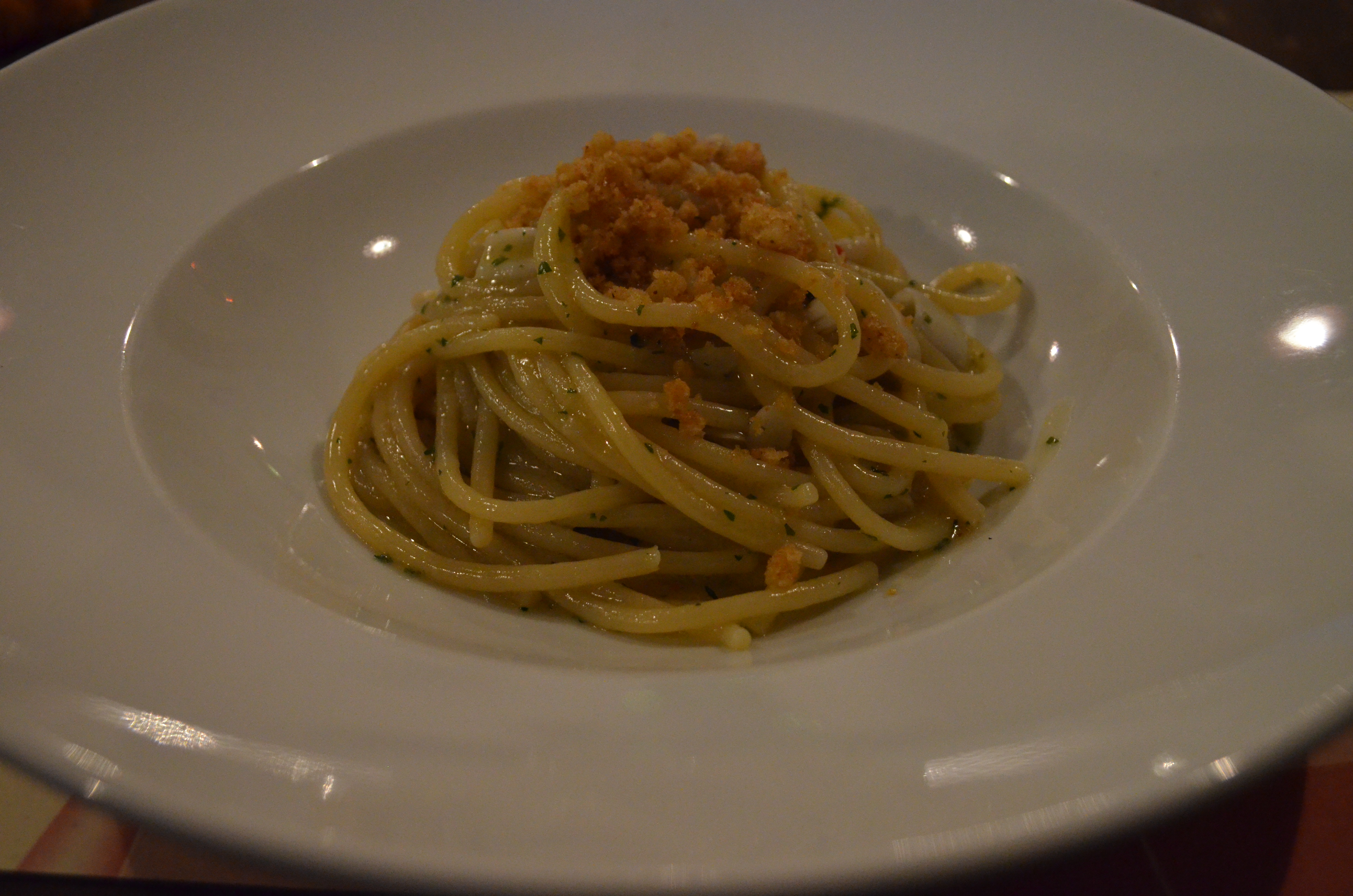 For the secondi, I ordered what seemed to the house special pasta, a spaghettoni al dente with calamaretti, salted anchovy syrup, garlic, and grano duro (del Salento del Comm. Benedetto Cavalieri, whatever that means):