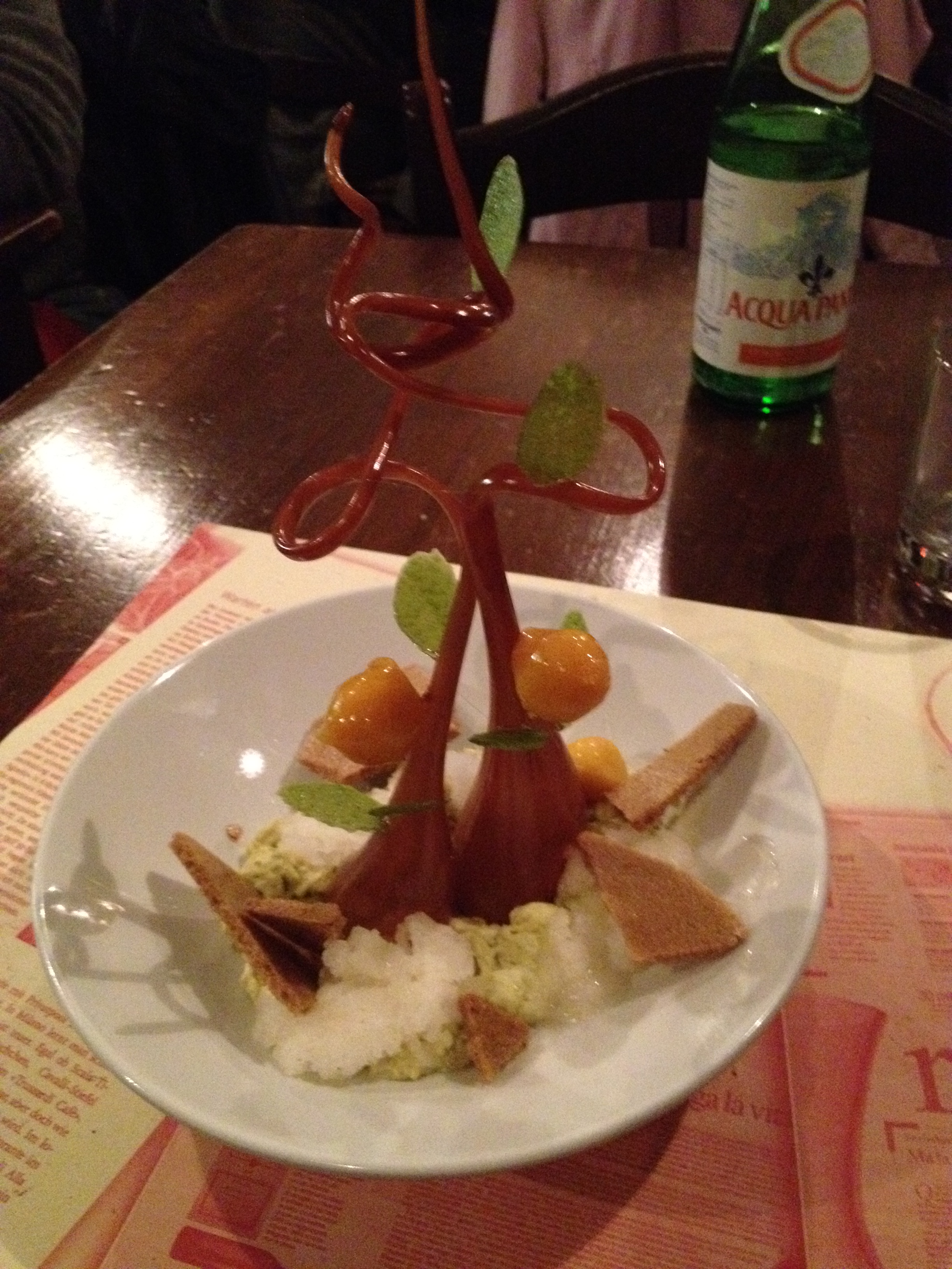 For dessert, I wasn’t really sure what I ordered, but what came was a tree shaped out of caramel, rooted in a bed of orange sorbet and espresso meringue: