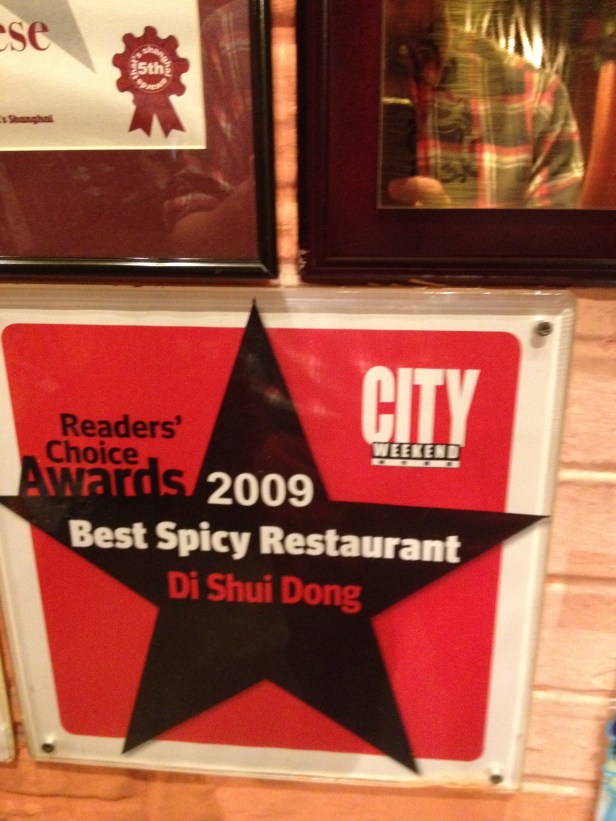 Shanghai spicy-food restaurant Di Shui Dong specializes in flavor-heavy Hunan food. The joint also doubles as an expat attraction, perhaps in part because the menu is a voluminous photo album full of peppers, cilantro, and chili oil (and therefore easy to order from), but also because it gets some good press in Shanghai’s foreigner lifestyle magazines. None of which really matters so long as the food is tasty.