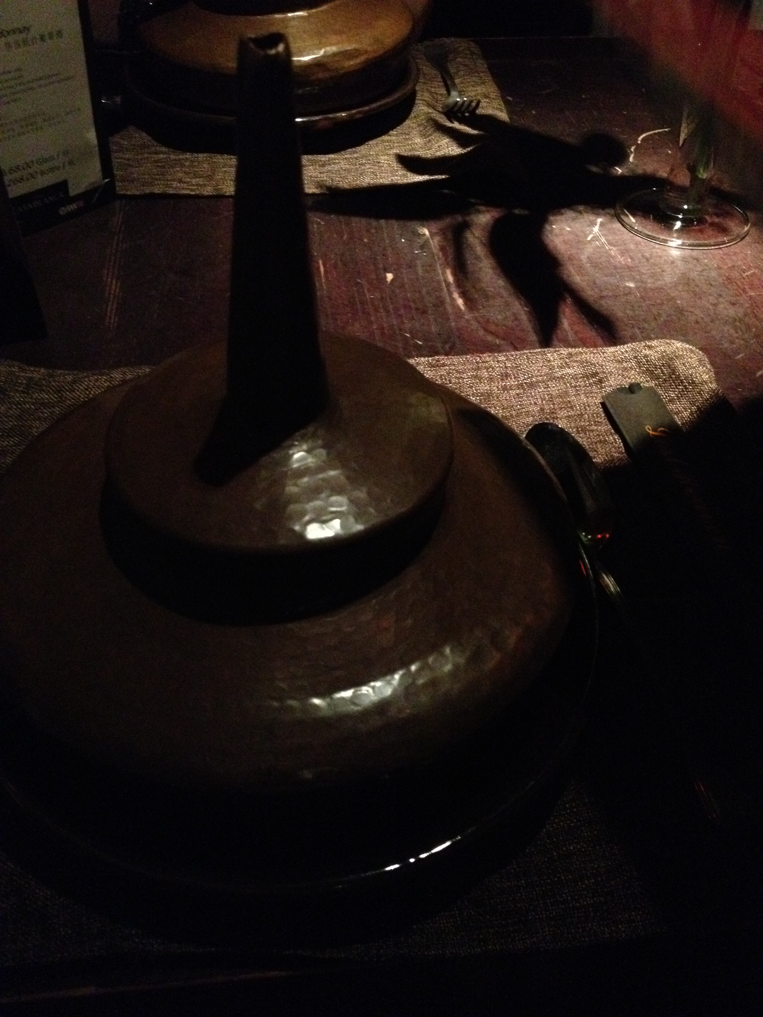 Perhaps for that reason, the downstairs bar is a very cozy place to get a drink, boasting a short list of interesting cocktails.  The upstairs dining area is not much brighter, other than lights centered on the middle of the dining tables, meant to illuminate your food.