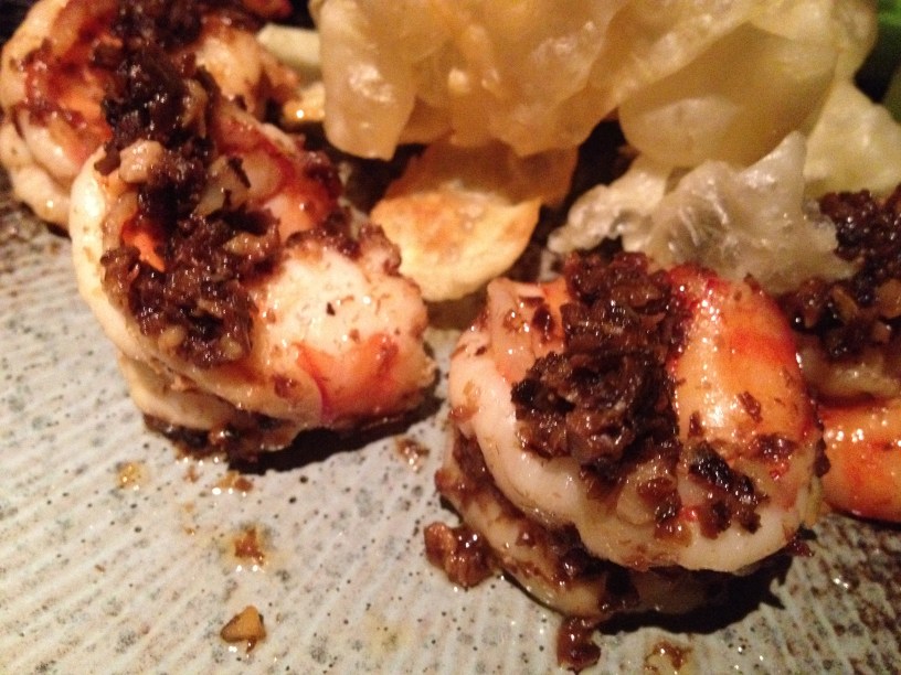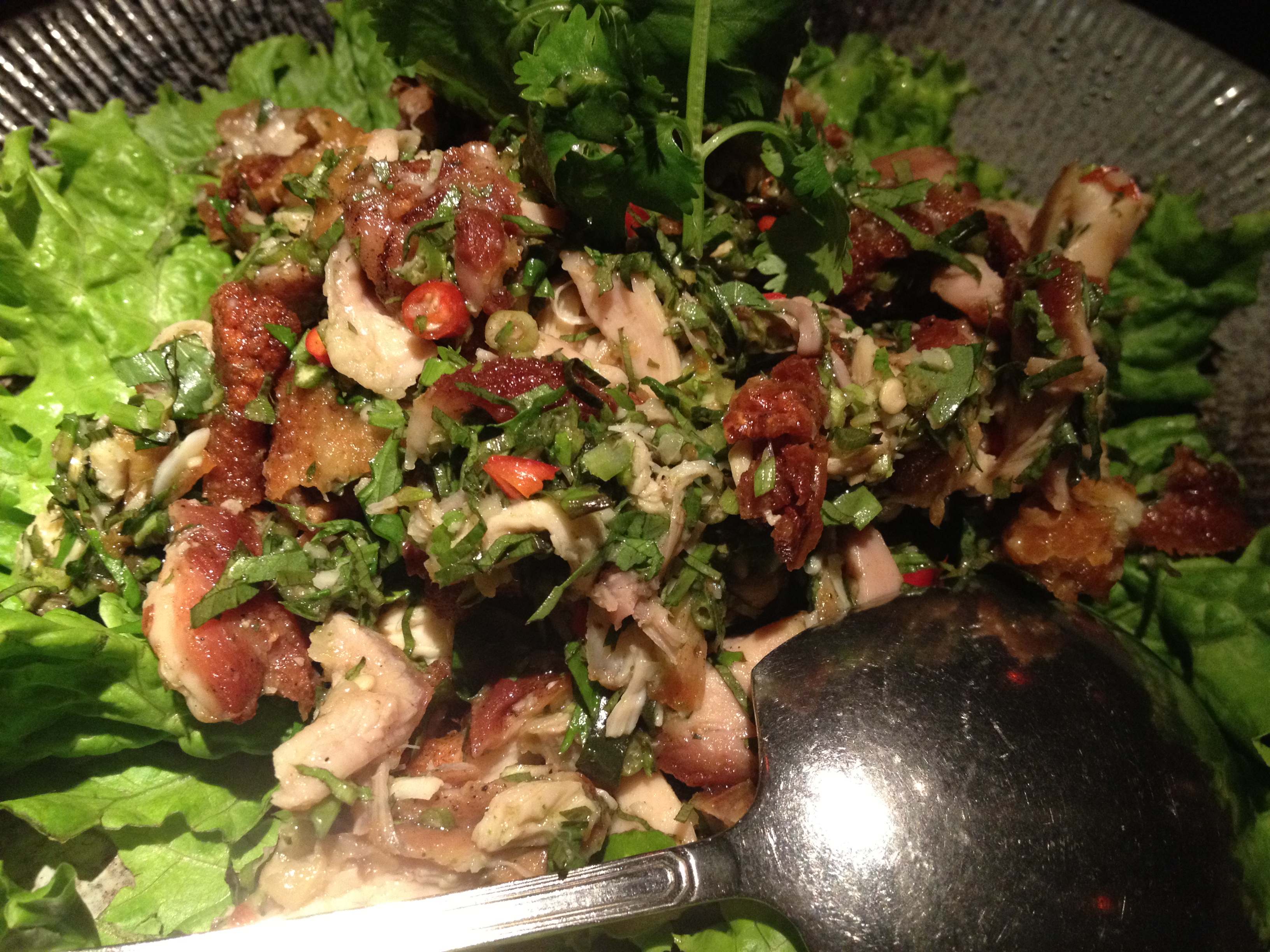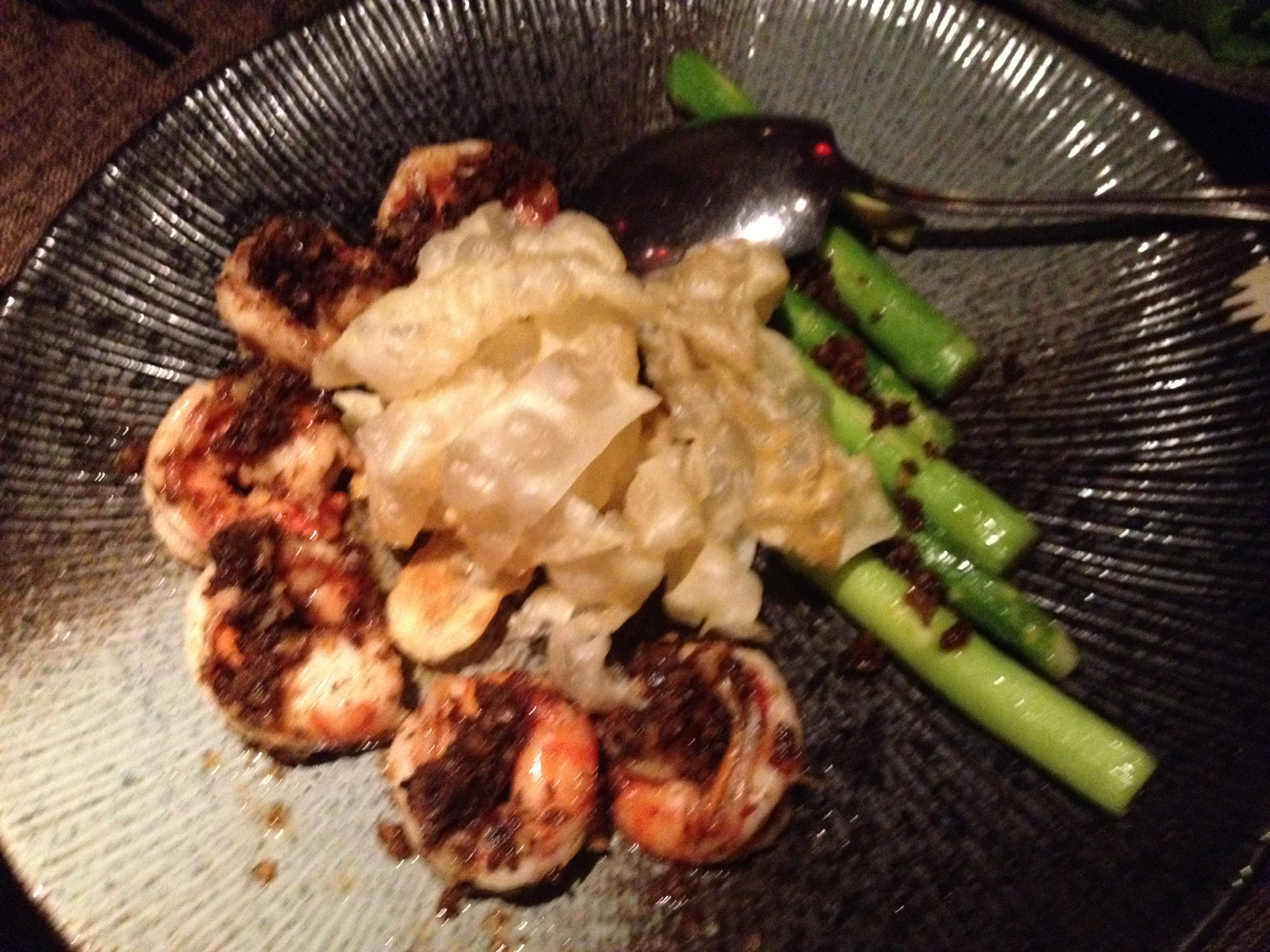 Personally, once the food arrives, and as long as it delivers on some sort of promise, I tend to forget about whatever ambivalent feelings I might have had about the mood lighting.  Since we were ordering for four, it gave us a bit more license to try a broader selection of dishes than when I’d gone to the Bund location with Myra.  There, we’d been taken a bit unawares by the persistence of cilantro in almost all the dishes we ordered, been served at a sofa-and-coffeetable set-up on the first floor lounge (and not the boisterous main dining room on the second floor), been attended to by a first-time waiter who had been visibly nervous, bringing us our neighbors’ dishes (and vice versa) and forgetting our order of pork ribs.  And still, despite my mild headache from the cilantro and poor service, our meal had been tasty.