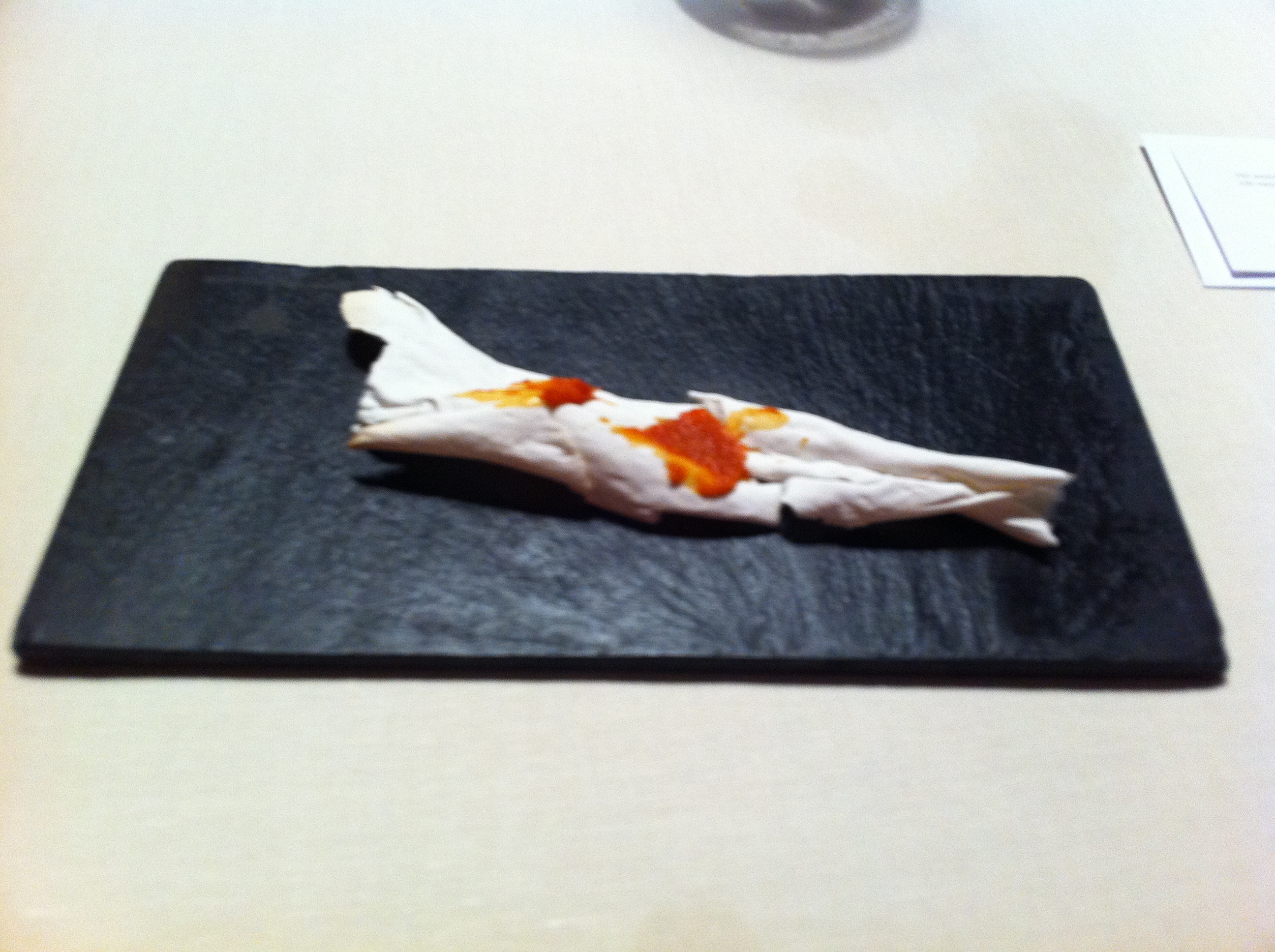 The meal started slow, with small, subtle glimpses at an impending departure from the norm. I don’t remember much of the first two dishes, only being intrigued by Mugaritz’s first sensual vagaries. While the first two were plays on water, transporting different textures and flavors – and the next one was also meant as an amusing head-scratcher, resembling a curled strip of birch bark, or a sunbleached bone. This was a weird place that Mugaritz was taking me.