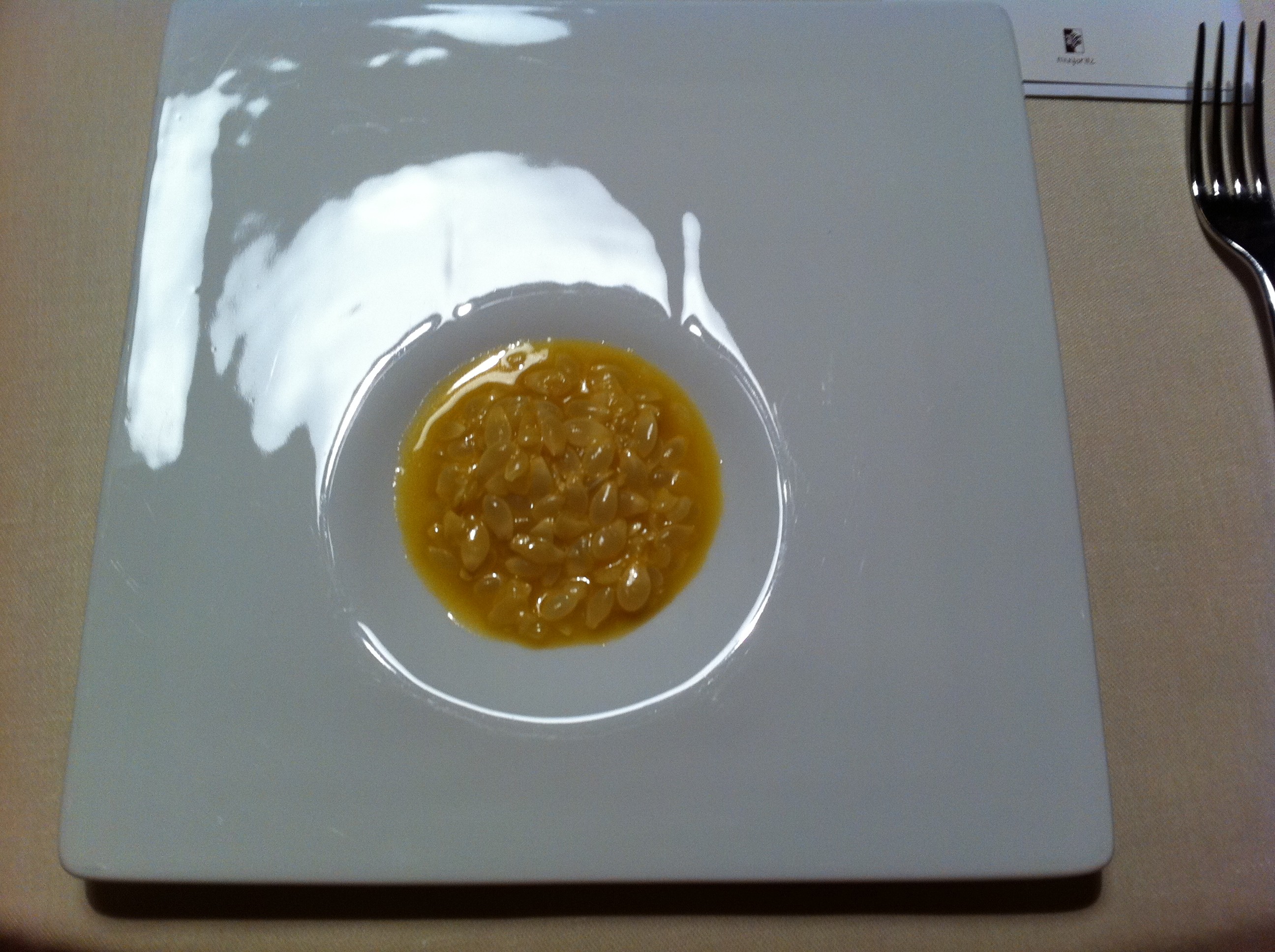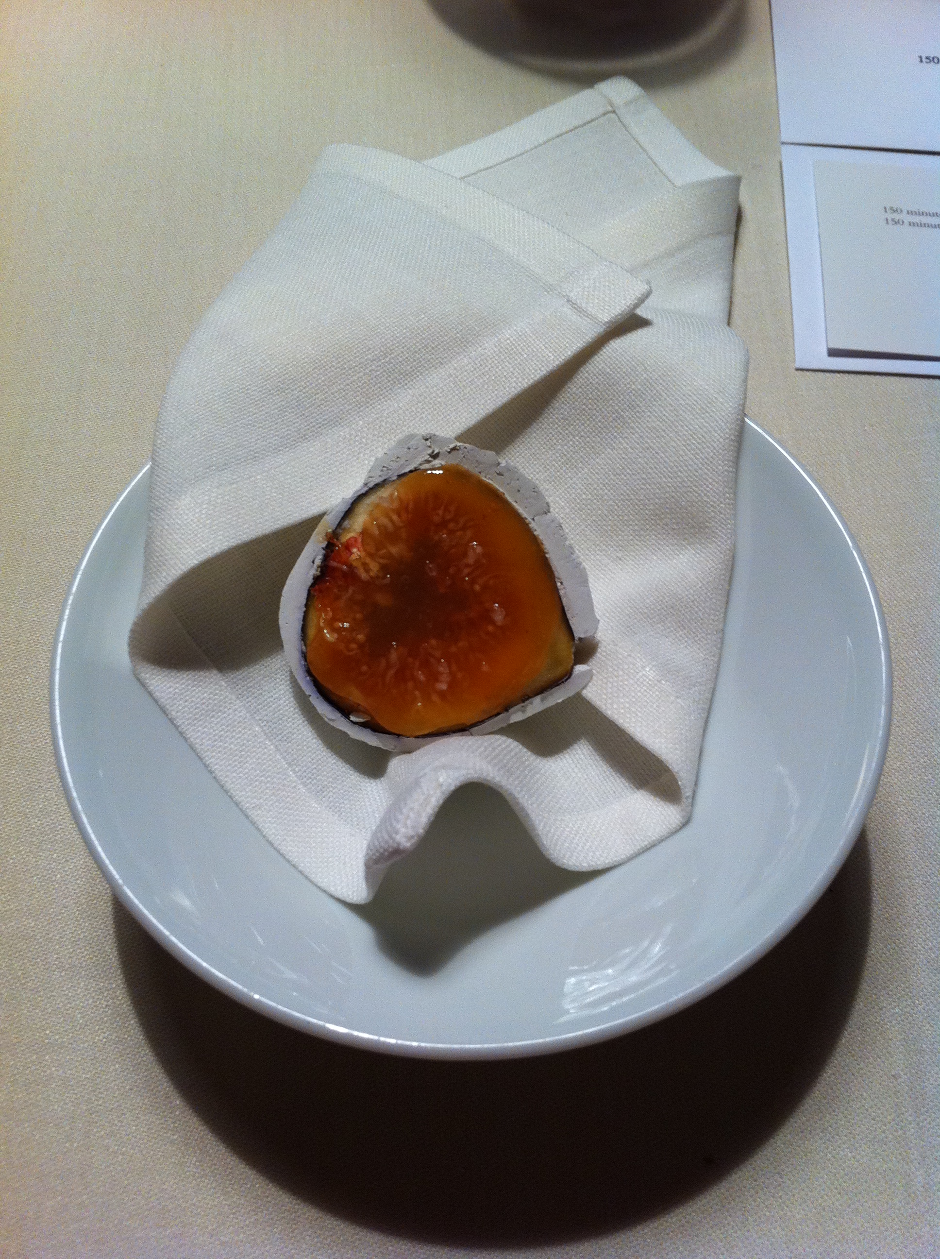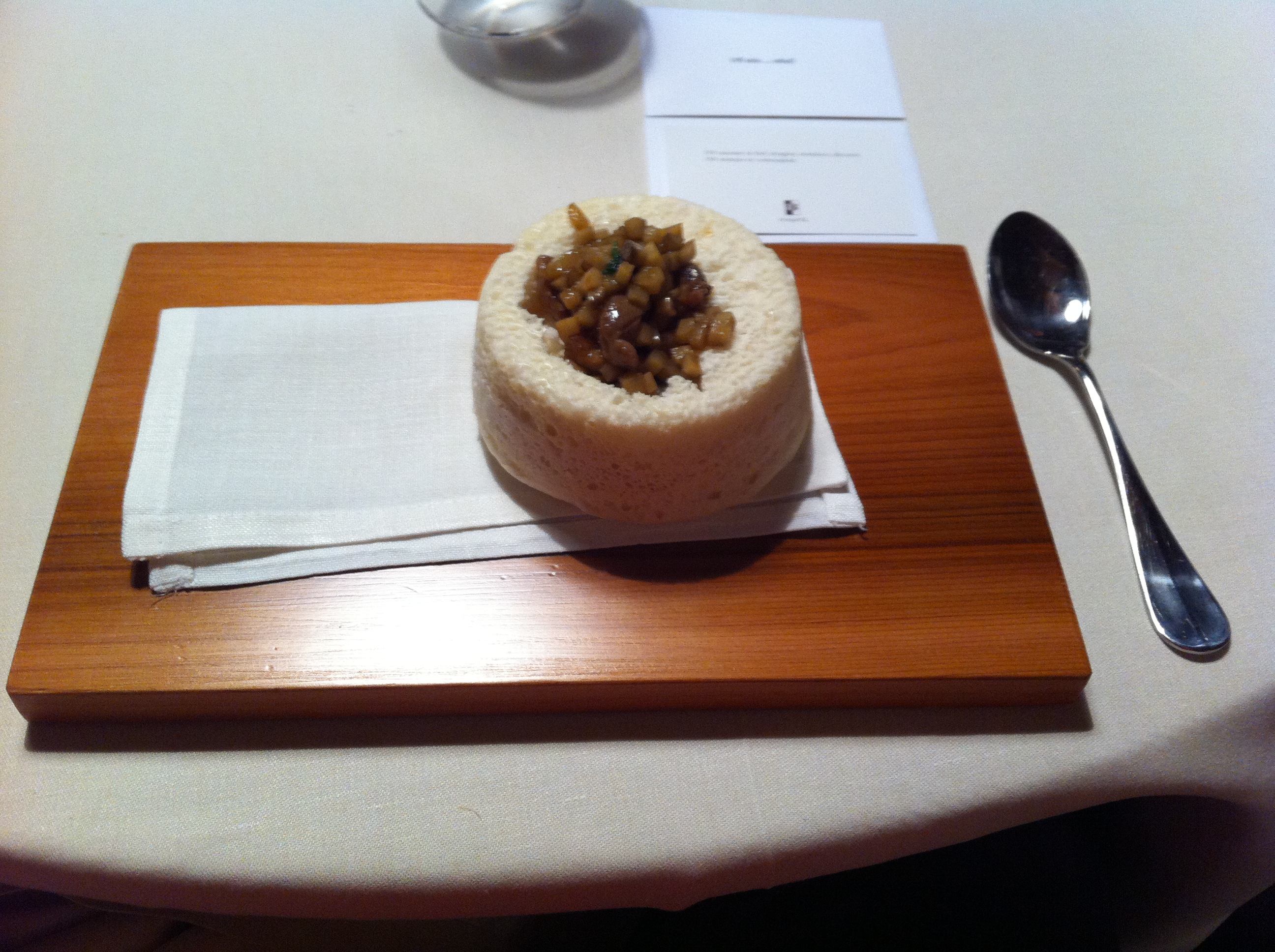 The last savory dishes were almost too much – we hadn’t properly paced ourselves for the marathon of courses, and if the portions had been any bigger, we would have been in trouble. The steak practically melted in your mouth, and the steak emulsion, essentially a dollop of butter made from the steak drippings, literally melted – four bites of beef doubly packed with umami. Aesthetically, the millet leaves were a clever way of weaving the local ecosystem into the meal – definitely not the only local aspect of the dinner, but still a notable one: the leaf shapes were cast from autumn leaf-fall from the trees growing near the restaurant. The story, as told by a chef who came by our table, was a nice way to bring us back from our lengthy, borderline absurdist meal, to try and ground us again in our surroundings, and also to quietly remind us about the autumn season and about the connection the chefs had chosen to make between the food and its environment, not just the immediate but also the regional. Iberian ham is a prized product of Spanish culinary tradition, and in all of its incarnations that I’ve had, one of the most potently delicious meats I’ve tasted.