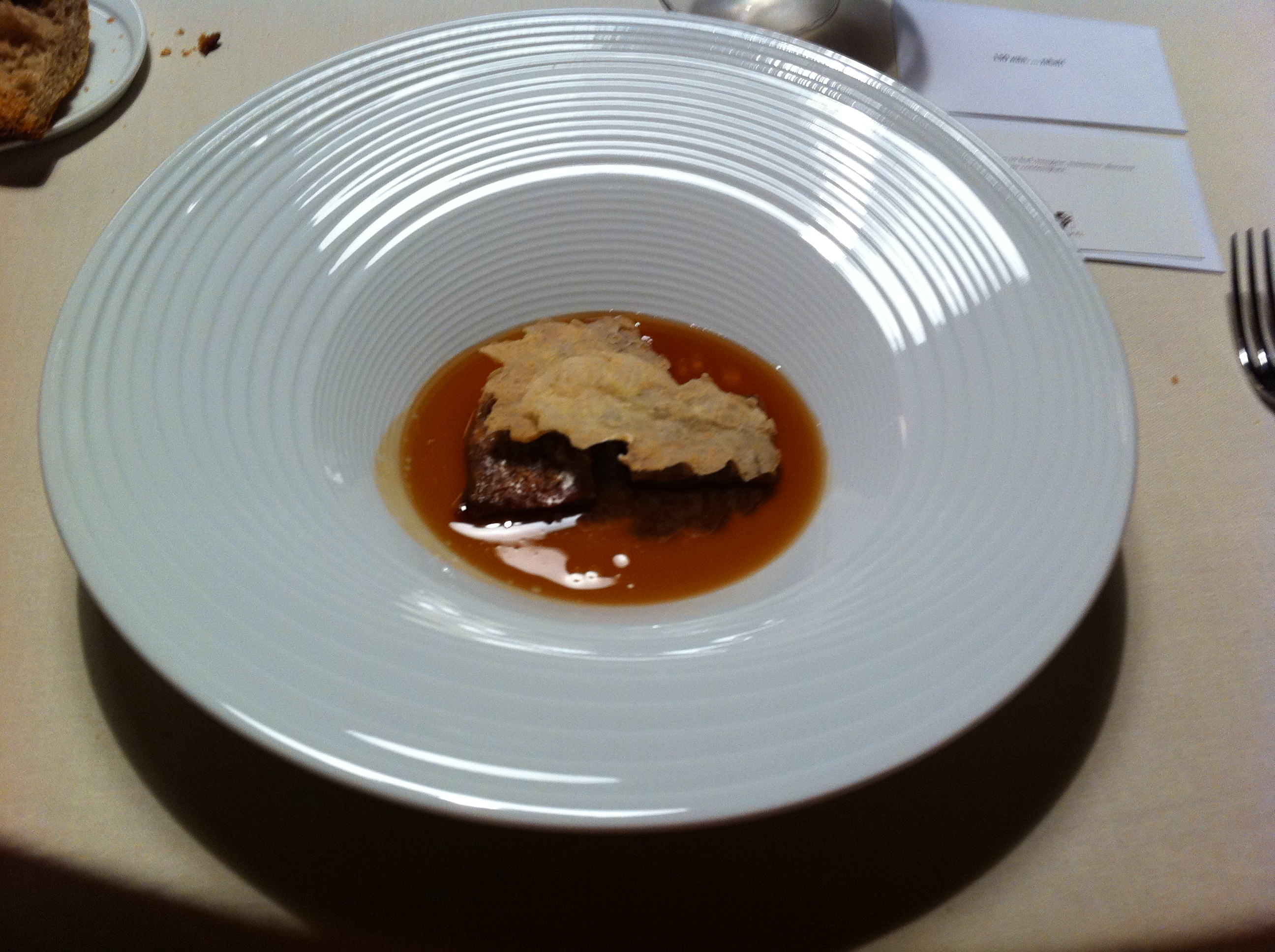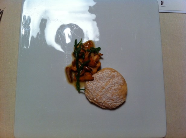 The next dishes were richer, some a bit larger in portion as well. The cheese, although visually the main attraction, I liked better as a sort of dressing, its gooey innards mixed with the mushrooms. The bonito belly was phenomenal, the first time I remember eating that particular cut (although Arzak would serve it to us again the next night), or bonito for that matter. I later found on Wikipedia that the Pacific version of bonito (also known as the skipjack tuna, and to the Japanese as katsuo) is a central component of dashi. Given my love of miso soup, no wonder I liked the flavor.