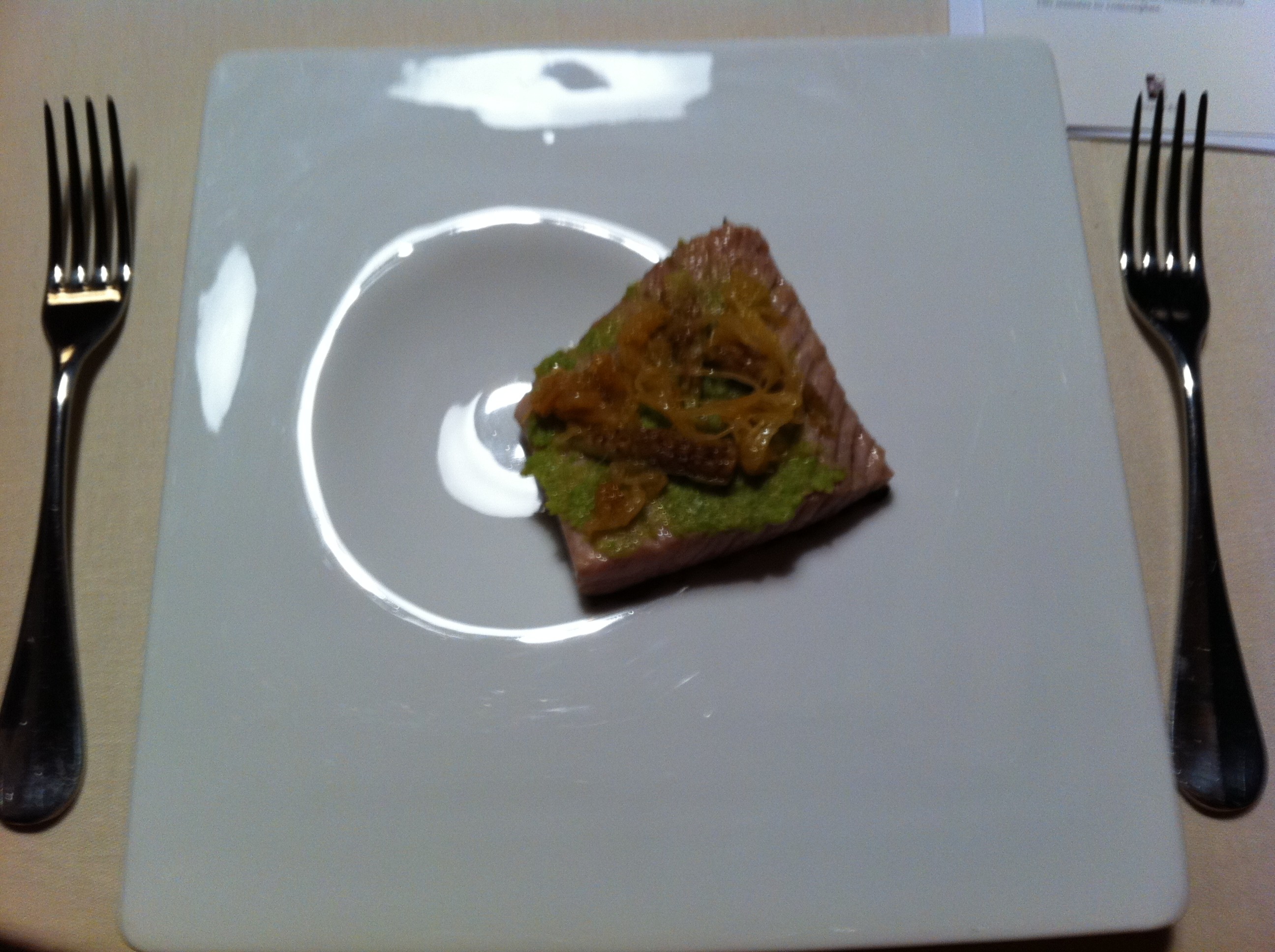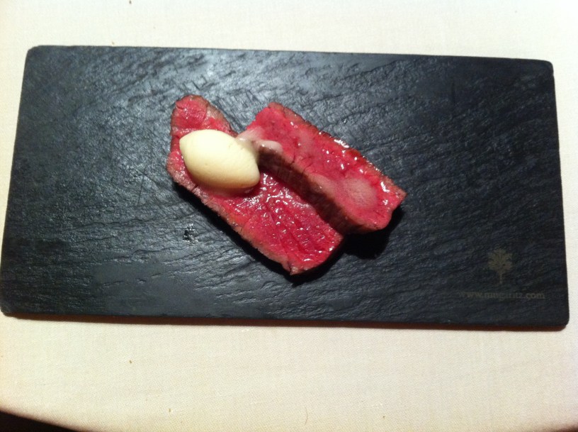 Before the tongue dish, the host (a supremely nice man named Jose Ramon, or Joserra, for short) came to introduce the dish, that we were to guess what meat the dish was made of – I vaguely recall him hinting that it was a big farm animal. The servers who came by after we’d finished the dish to ask us that same question were surprised when I guessed beef tongue. Whether Jose Ramon’s hint was planned or not, it was a neat interaction coupled with a savory, crunchy dish that was fun to eat – a game that made the dish more interesting, and also a tongue-in-cheek play (pun intended) on most eaters’ fear of not knowing what is in their food.