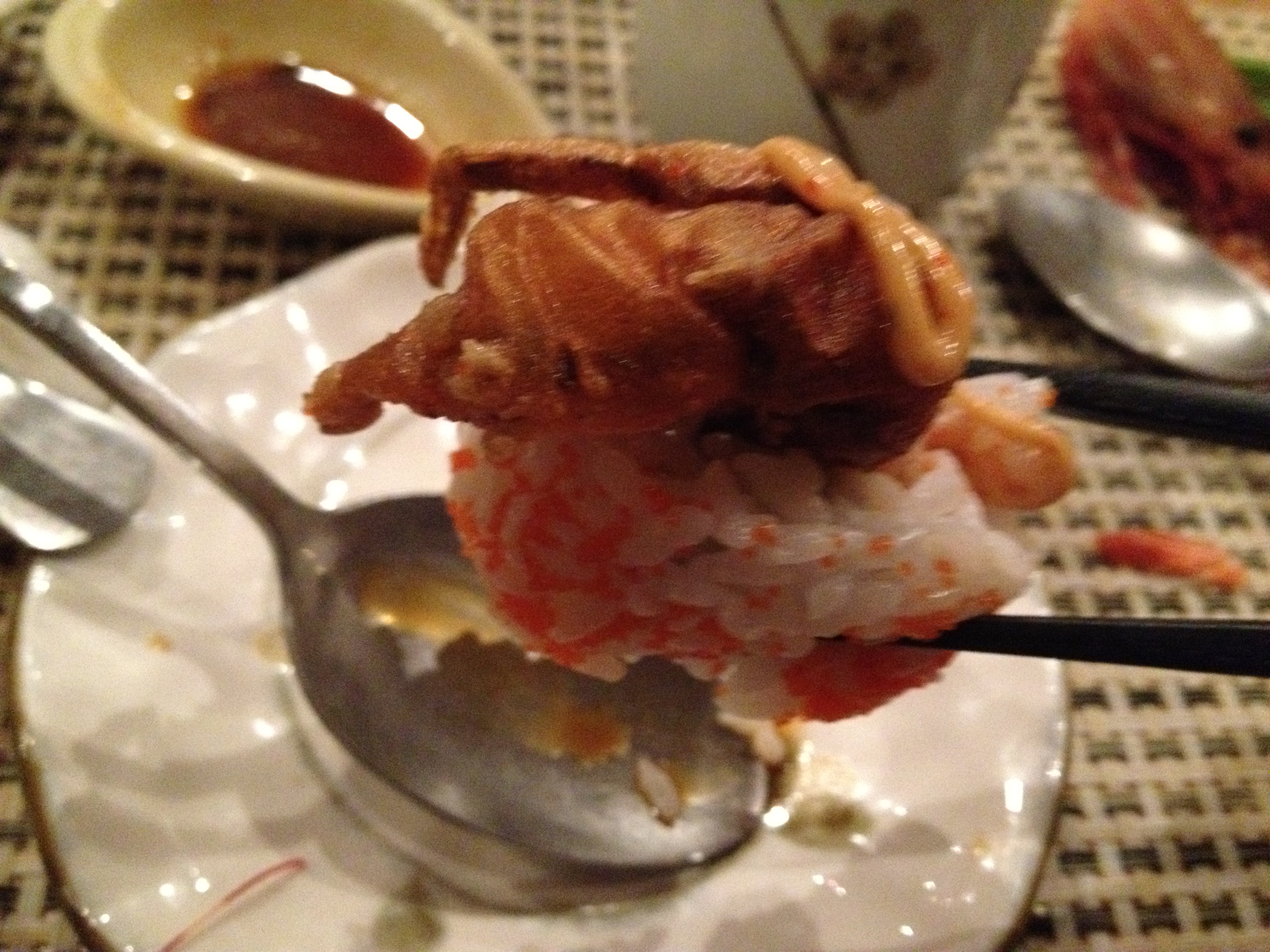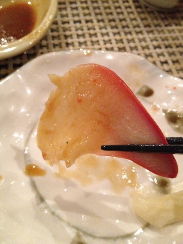 Although the sashimi platter’s quantity didn’t quite warrant its price, its individual components were really good, the head-on shrimp, the clam, and the salmon (not picture) in particular. I checked with the two others who had already eaten the shrimp whether they’d gone for the delicious brain juice, which is something I’d usually do, but this being China, I wanted to make sure. They both gestured tellingly at their already emptied shrimp heads, and I didn’t want to be the odd (shrimp head) man out, you know?