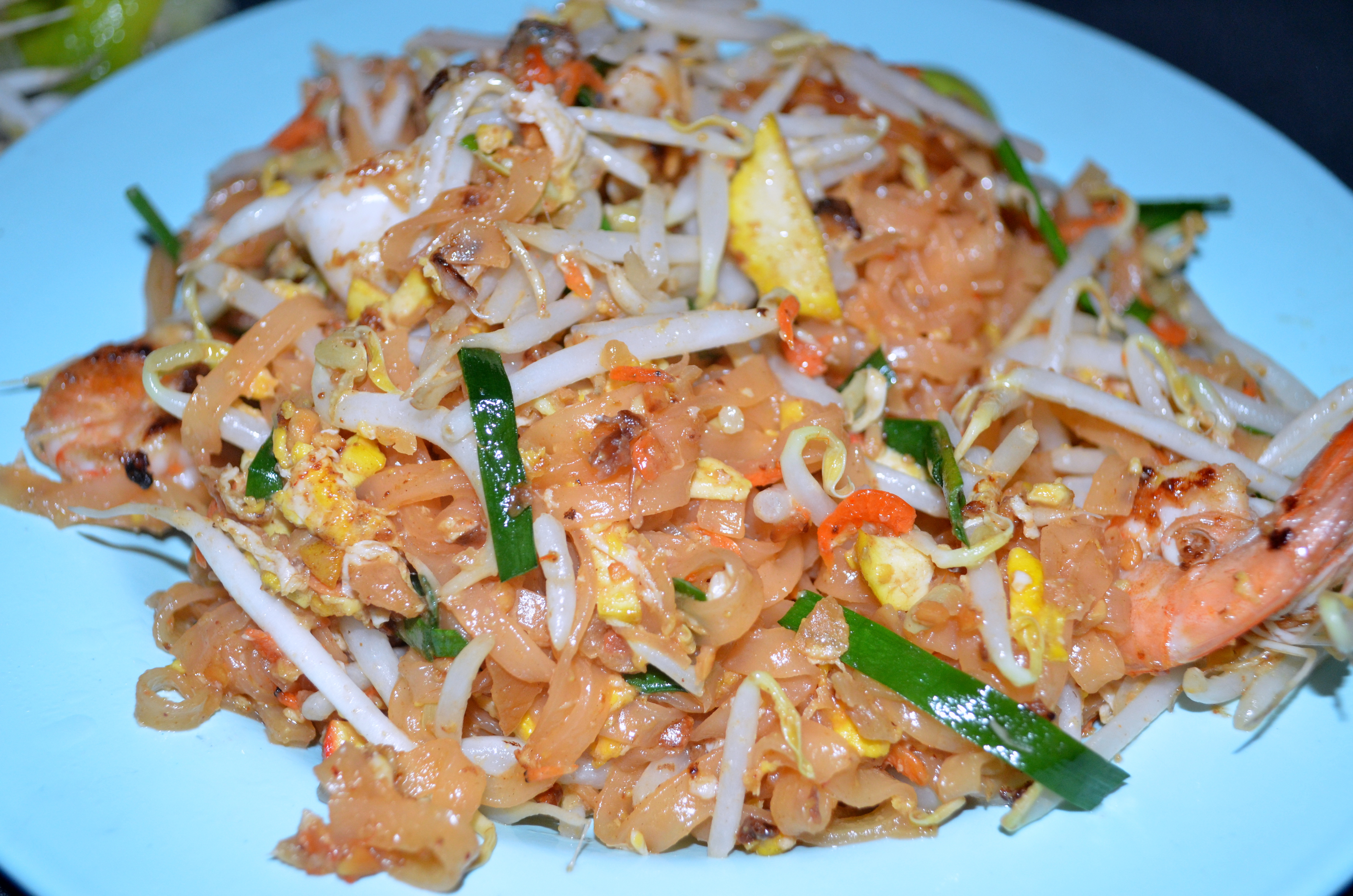 There’s something uniquely great about Thai street food, made with unpretentious means (often on the border between simplicity and ambiguous sanitation), quaffed down by the side of the road in whatever weather comes your way, cars and scooters and pedestrians streaming by your plastic chair beside a fold-out table. Here we were in Bangkok, having just taken an hour-long water taxi ride up and down the Chao Praya River, now having wandered along Thanon Charoen Krung south of the Taksin BTS station, and stumbled upon a busy pad thai stall right next to a noodle stand.