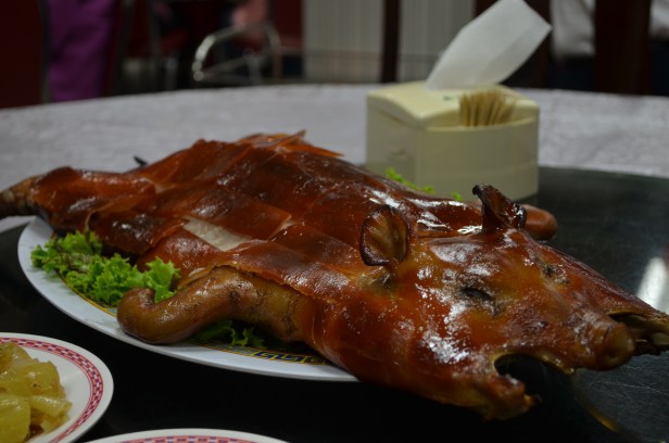 So you eat the skin first as you would with Peking duck, wrapped in a small tortilla and with cucumbers, green onion, and hoisin sauce.  Except that we didn’t know that, so spent about 15 minutes trying to ask the waitress how to eat the pig, eventually ending up a pair of scissors for an idiotic attempt to carve up the meat before the boss came by and we in our one moment of clarity realized he probably spoke Chinese, so we were finally told how the whole thing works.