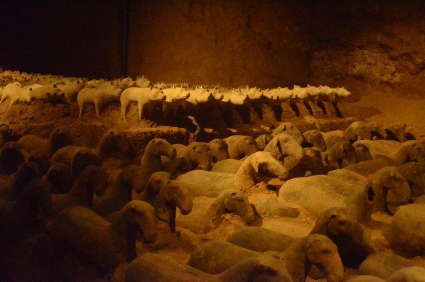 The last thing we saw was the mausoleum grounds of the fourth Han emperor (Han Yang Ling mausoleum), not that far from Qin Shi Huang’s burial grounds. Apparently, emperors began designing their burial sites in their pre-teen years – how weird that would be, how ubiquitous the presense of death and how incessant the pursuit of immortality. But I suppose it’s one way to keep your ambitions lofty, eh? Han Yang Ling is one of the best-preserved imperial tombs and, unlike that of Qin Shi Huang, whose post-mortem army was life-size and constructed to scale, the Han emperor used much smaller, doll-like figurines, but replicated the entirety of his court, from soldiers and livestock to eunuchs and concubines, offering a broad glimpse into imperial life in its many forms.