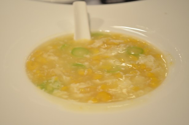 Next we had individual bowls of soup – mine was crab meat with minced shrimp balls and black truffle, and Mahdi had the sweet corn broth: