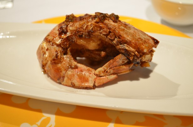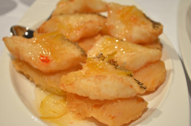 Then, live king prawns sauteed in soy sauce (ahem, premium light soy sauce, sorry), pan-fried cod filet with pomelo honey sauce, and crispy bean curd: