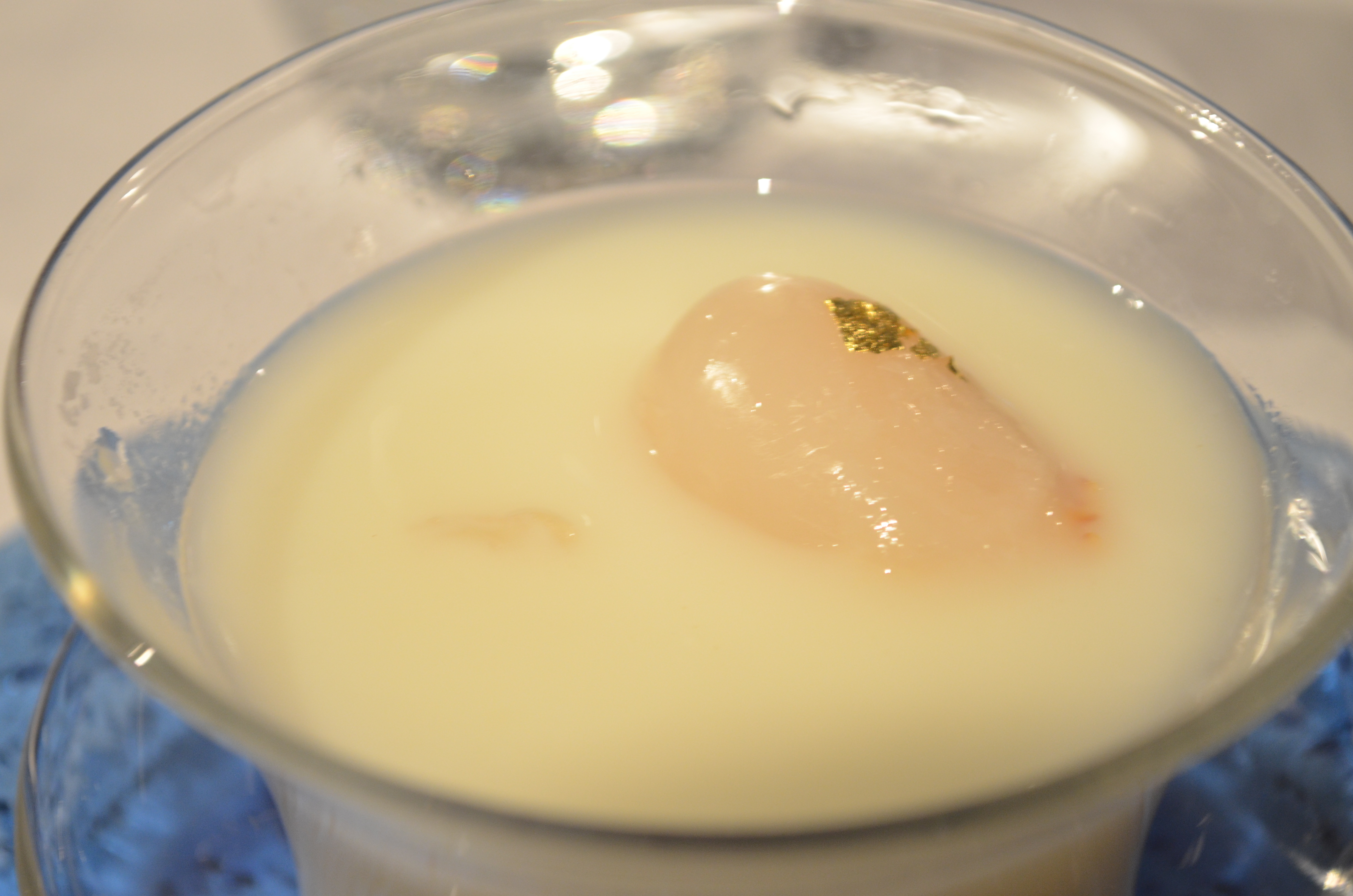 The desserts were cleverly executed, although taste-wise nothing supremely innovative. I had the chilled champagne jelly and mango pudding with pomelo and sago in coconut juice (sounds complicated, and the layering was visually enticing), and Mahdi the double-boiled Hokkaido milk with lychee purée: