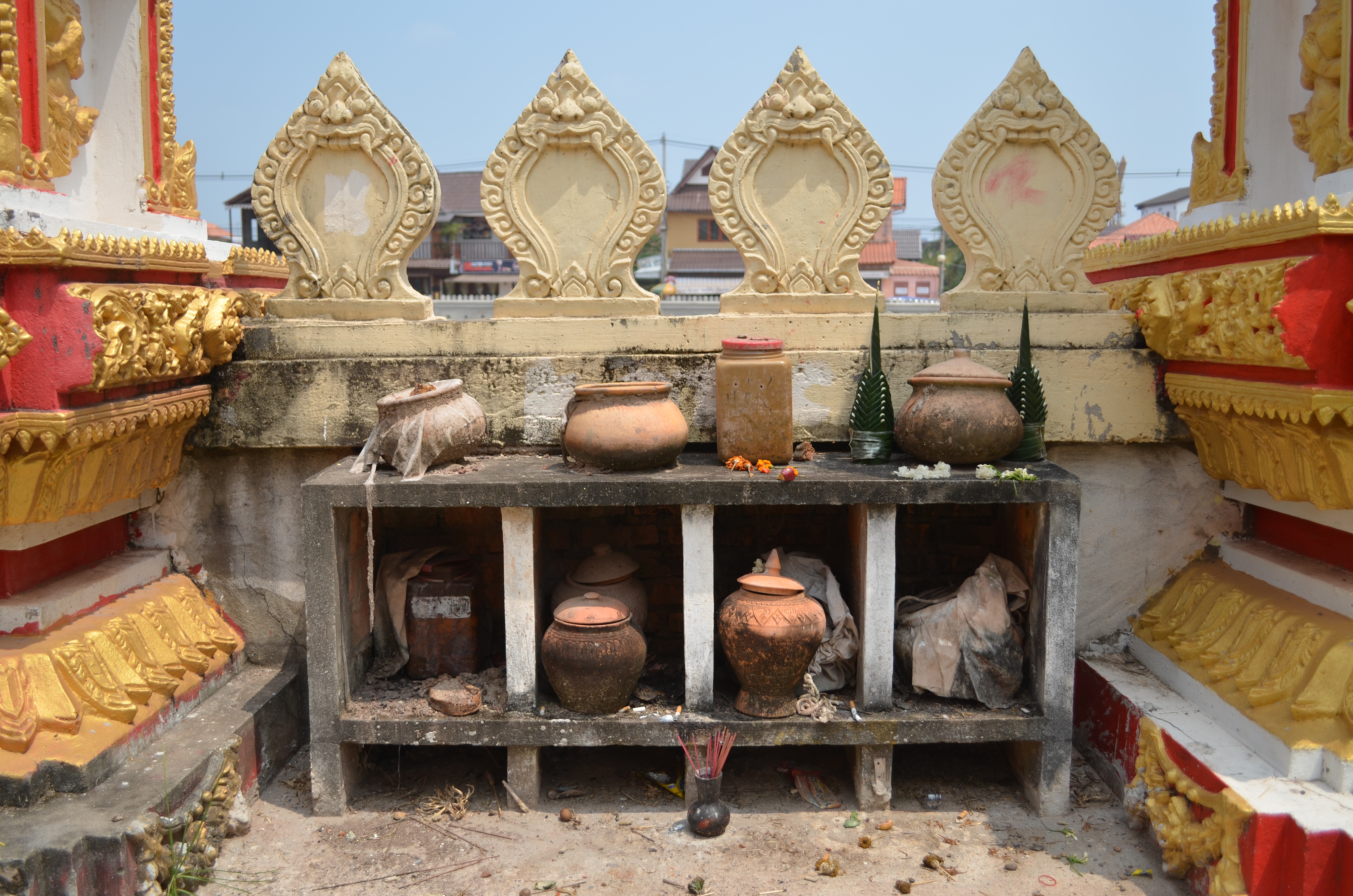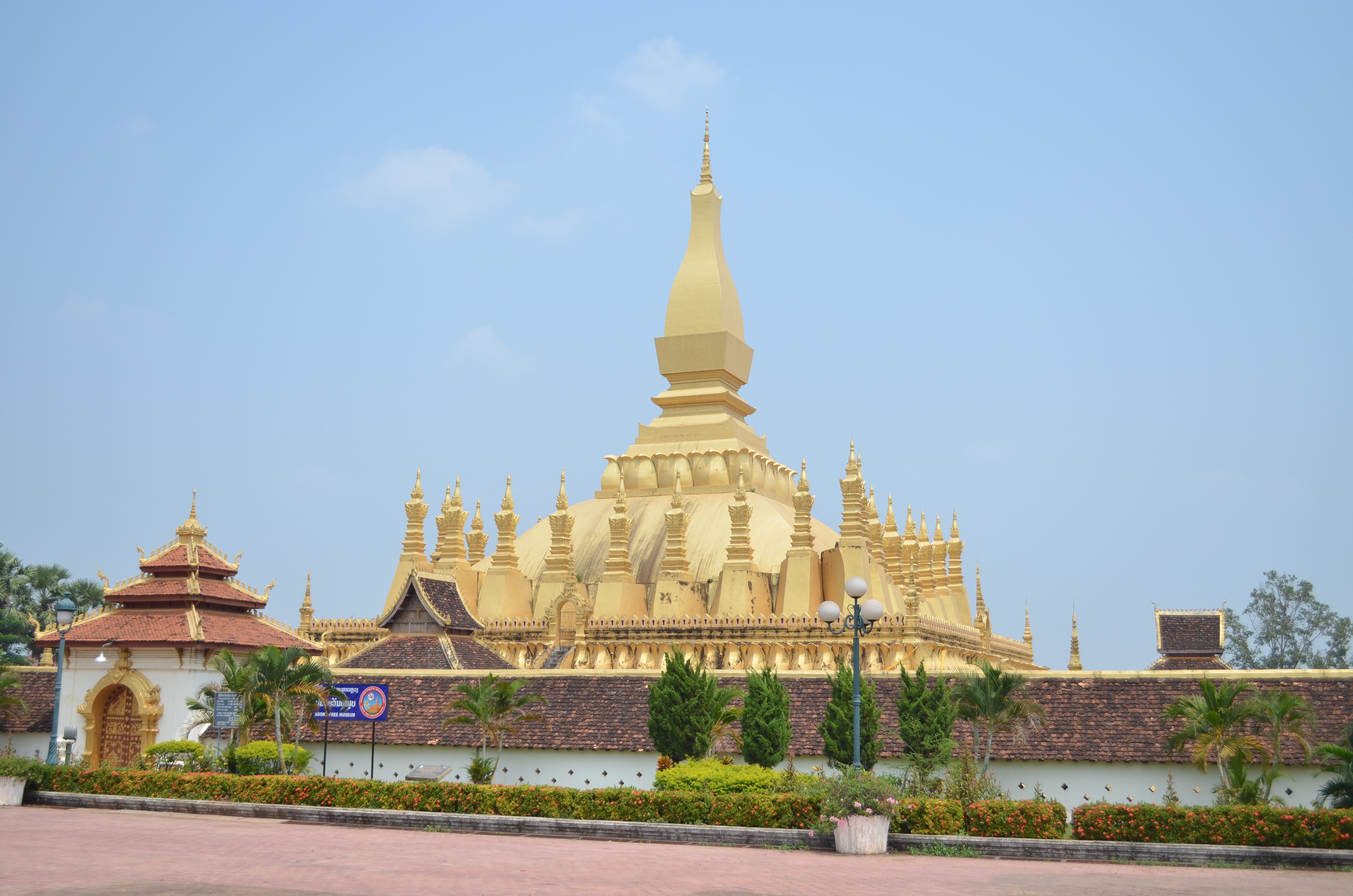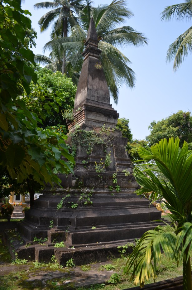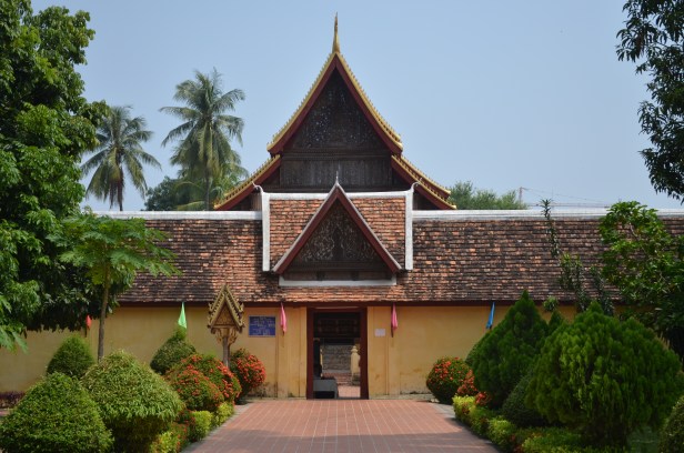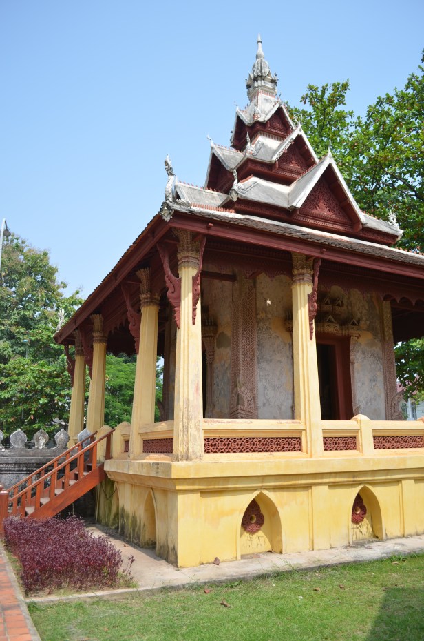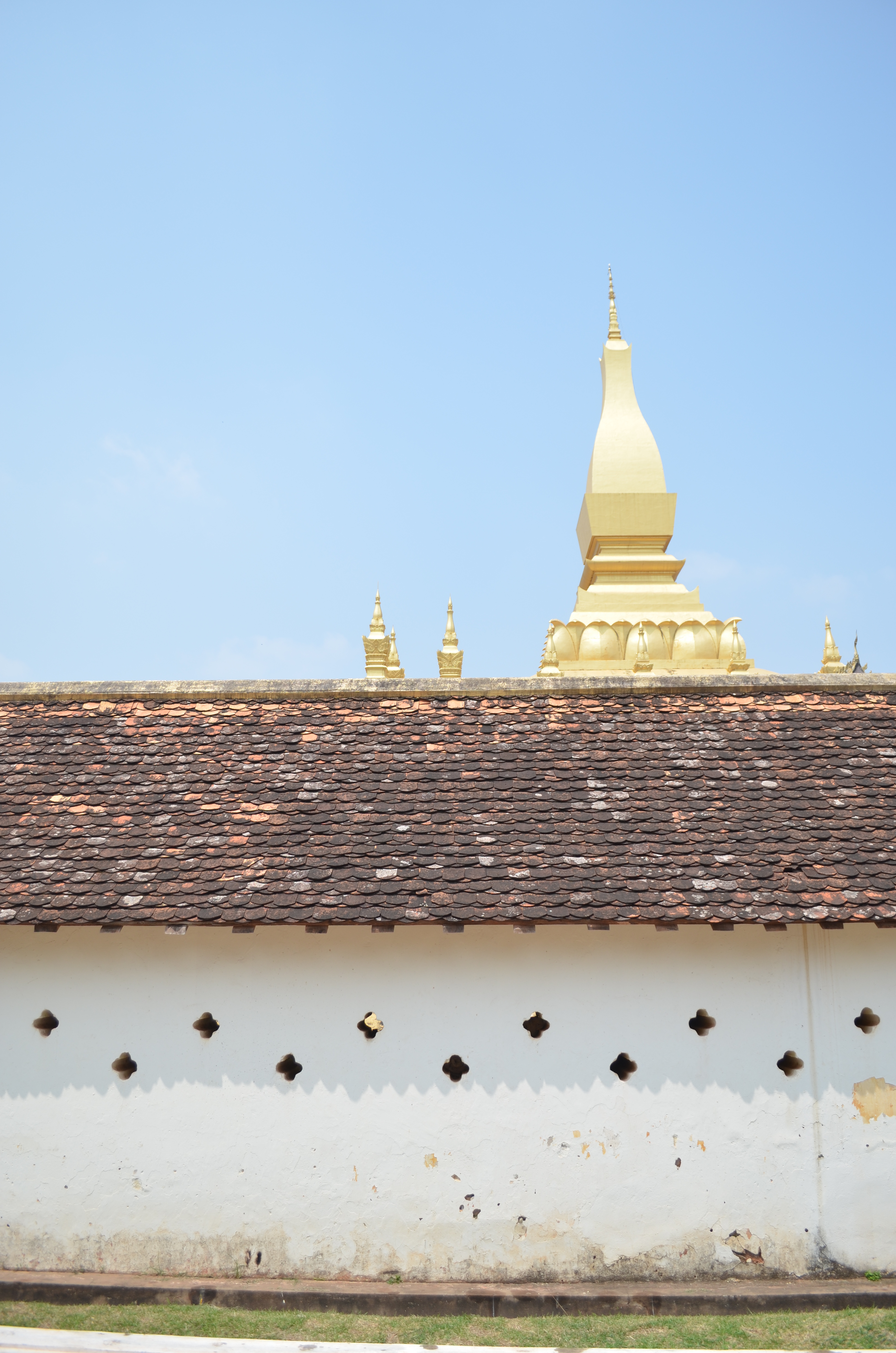 In the afternoon, we took a short tuk-tuk ride to the Golden Stupa (Pha That Luang), Vientiane’s other main Buddhist site. The stupa is fabled to be located on the site of a third-century Indic temple, and whose original construction was ordered by the Lao King who moved the kingdom’s capital from Luang Prabang to Vientiane. The main temple’s style contrasts sharply with that of Sisaket’s. The stupa’s current incarnaton is much more recently built, as the site has been damaged or destroyed many times over the last two centuries during regional and colonial conflict. Its golden silhouette dominates the landscape around it – its shimmering pyramidal center rising up into the sky.