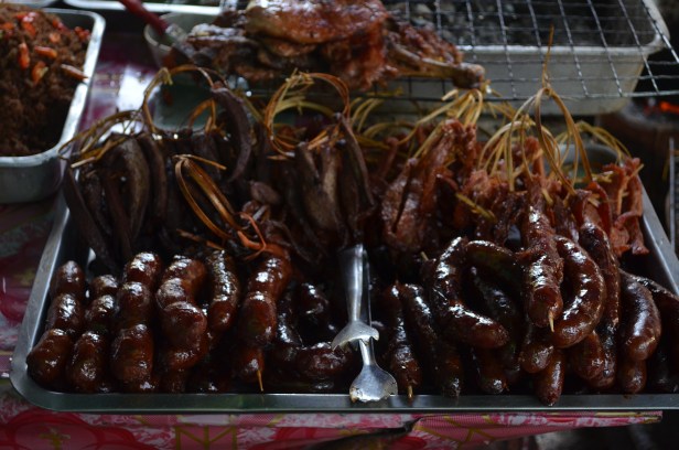 We took a stroll one day from our hotel near the river through the heart of Vientiane. After stopping by the Presidential Palace and Wat Sisaket, we ambled towards one of the most prominent relics of the country’s French colonial history, the towering Arc de Triomphe, or the Patuxay. Along the way, we saw a few stalls selling a variety of things we didn’t recognize, meats and sausages and curries and things in covered pots. We hadn’t heard much about Laos’ street food, or rather only that the streets weren’t busy enough and the city not populated enough to sustain the same vibrant street food culture as its Southeast Asian neighbor countries. That isn’t to say that the sights didn’t inspire hunger.