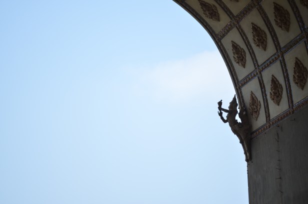 Though not as massive as other notable war monuments or memorial structures, Patuxay is nevertheless imposing, especially given the flatness of Vientiane. At Patuxay’s base are a few unremarkable convenience stores, so if you wanted you can lounge for a bit in its shadows, sipping on a cold bottle of Pepsi, before taking the few flights of stairs up (past two floors of souvenir shops) to the rooftop (which has another souvenir shop). The nice part about the souvenir shops is that nobody really bothers you to buy anything.