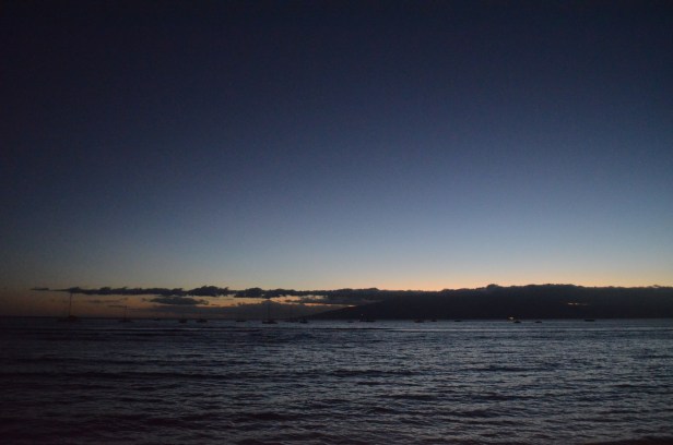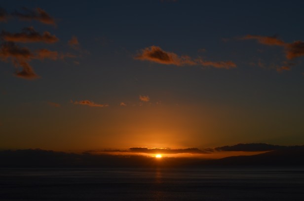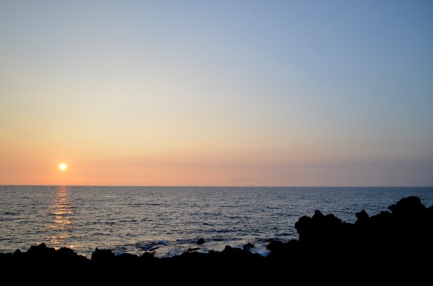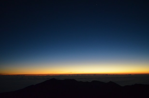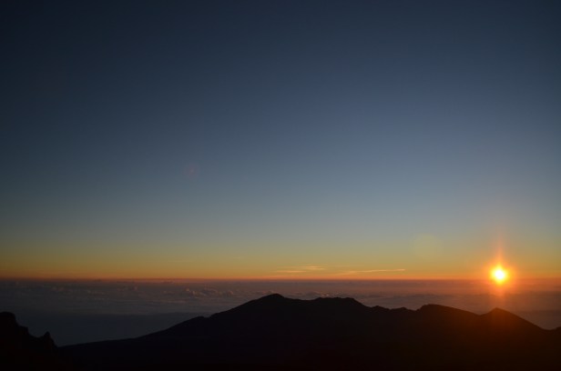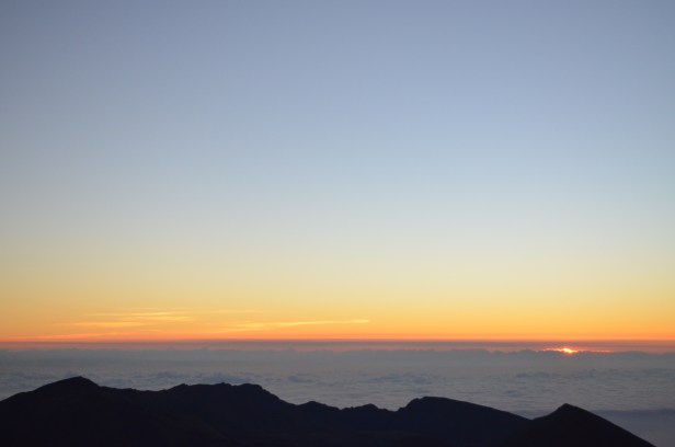 What a concept, to hit the road at three in the morning, peacoats and coffee in tow, to head up the slender road that slithers in brisk 180-degree turns along the pitch black darkness off the mountainside. In about 37 miles, the road took us from sea level to about 10,000 feet – our rental Mustang sharing the lanes with a slew of Jeeps, hatchbacks, and the occasional white tour company van. We stopped at the summit of Haleakala, House of the Sun, parking below an observatory a few hundred meters past the more popular Visitors Center. After a brief shivering nap, we walked up to join the small crowd huddled together, looking up at the still-dark Haleakala sky dotted with stars, out over the silhouette of jagged volcanic peaks, and down from our height at the distant expanse of clouds that were brightening with yellow, orange, lavender.