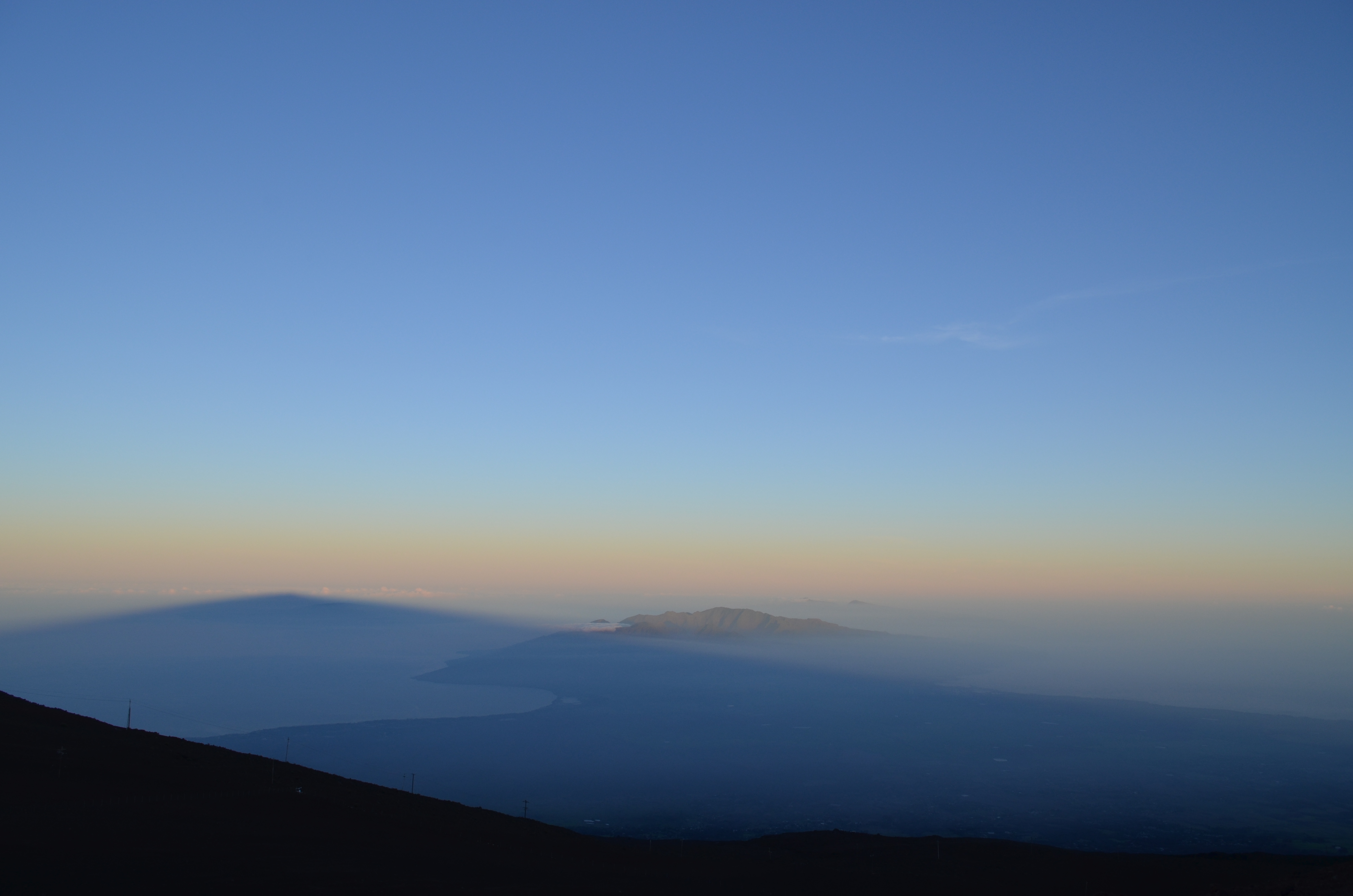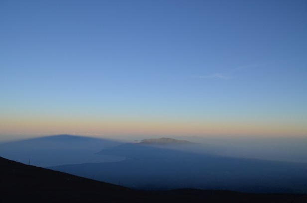 On the way back down the mountain, we caught a glimpse of the western valley and the shadow of Haleakala over land and water: