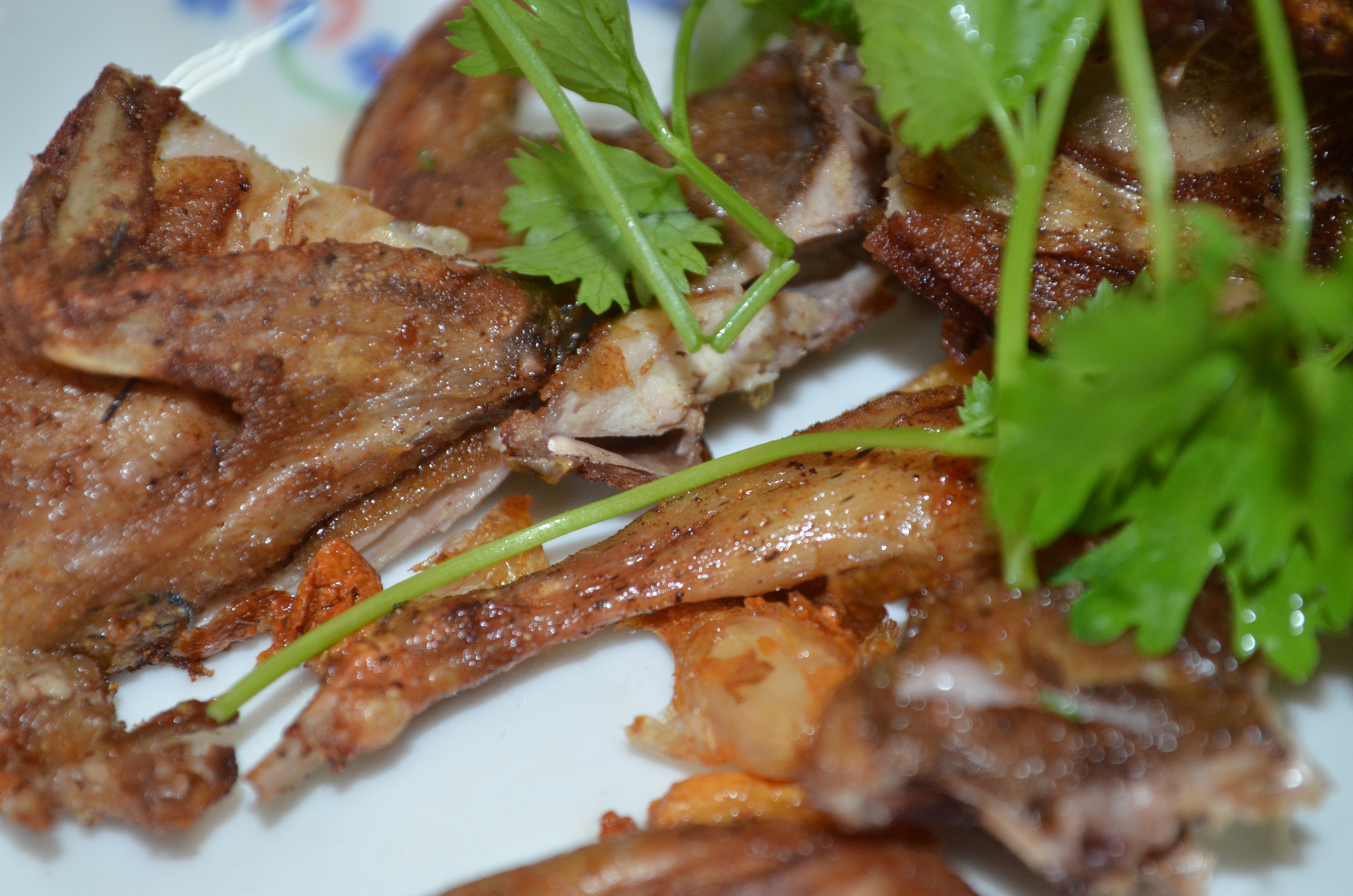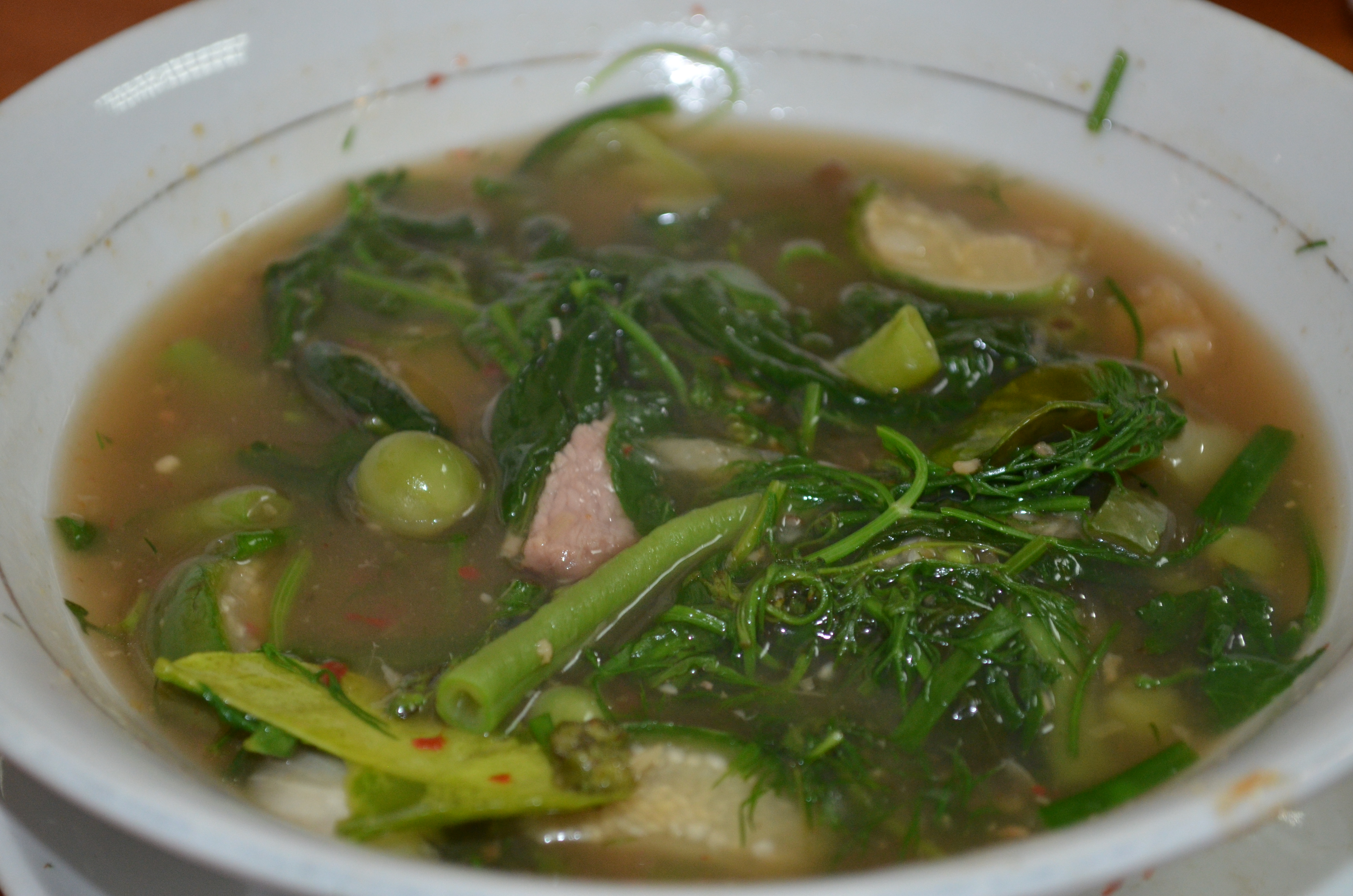 The first place, Nangkhambang, we went for lunch after a busy morning walking the city. We had to double back on the street until we finally saw the nondescript sign and the plain table settings. There were a handful of customers, couples and businessfolks, and a menu that seemed absent of gimmicks. Some tables were just recently cleared out, and there were plates full of herbs and cabbage, freshly washed. We had fried ribs with garlic, roast quail, fried rice with sausages, and beef soup, with a side of a Lao staple, sticky rice.