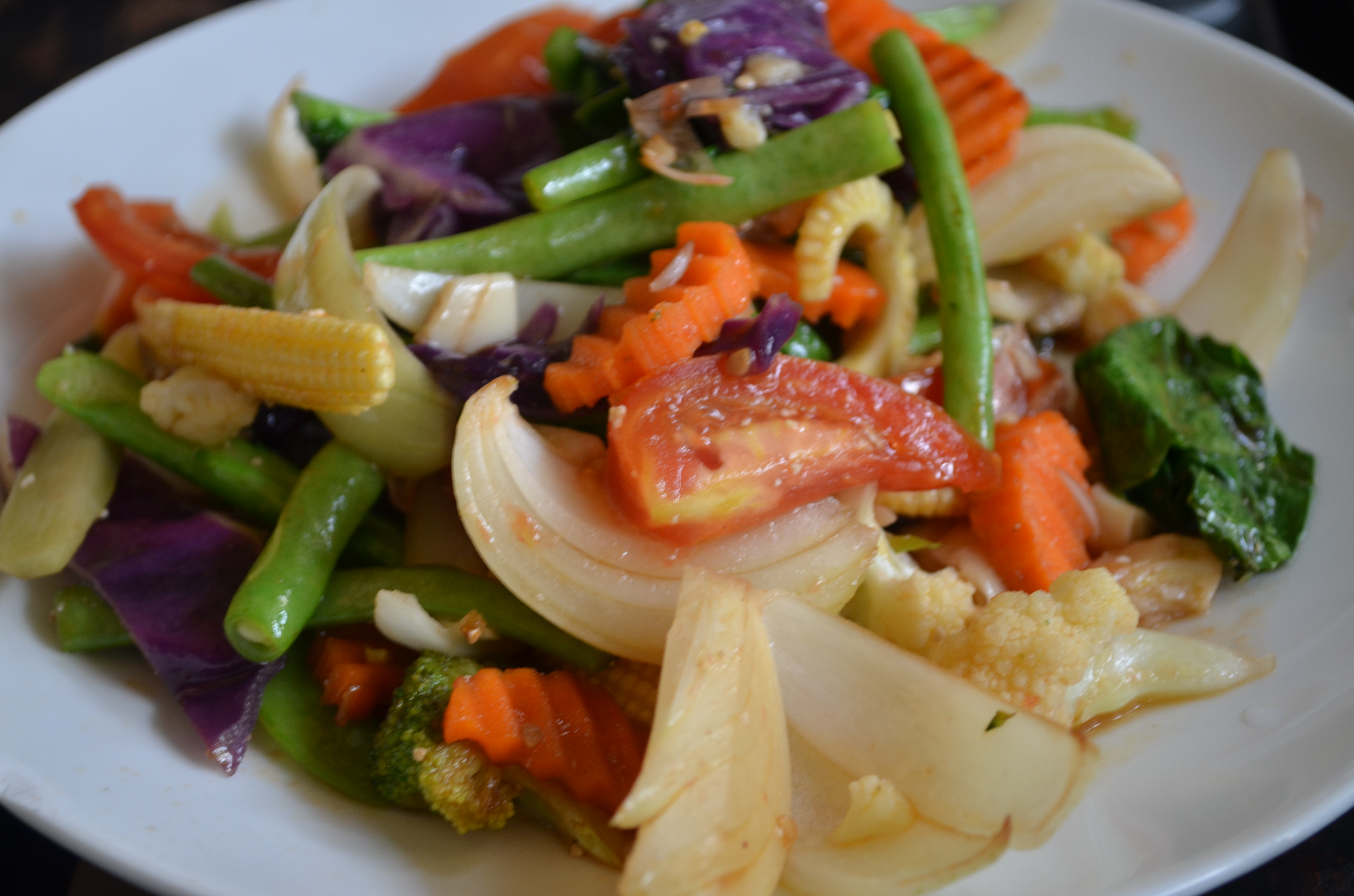 The restaurant is relatively open air, with a fleet of electric fans hanging from the ceiling and a lazy cat who slept somewhere near the entrance. We ordered a variety of things to round out our final meal: beef laap, mixed sauteed veggies, fried fish with lemon sauce, and for dessert, mango black sticky rice: