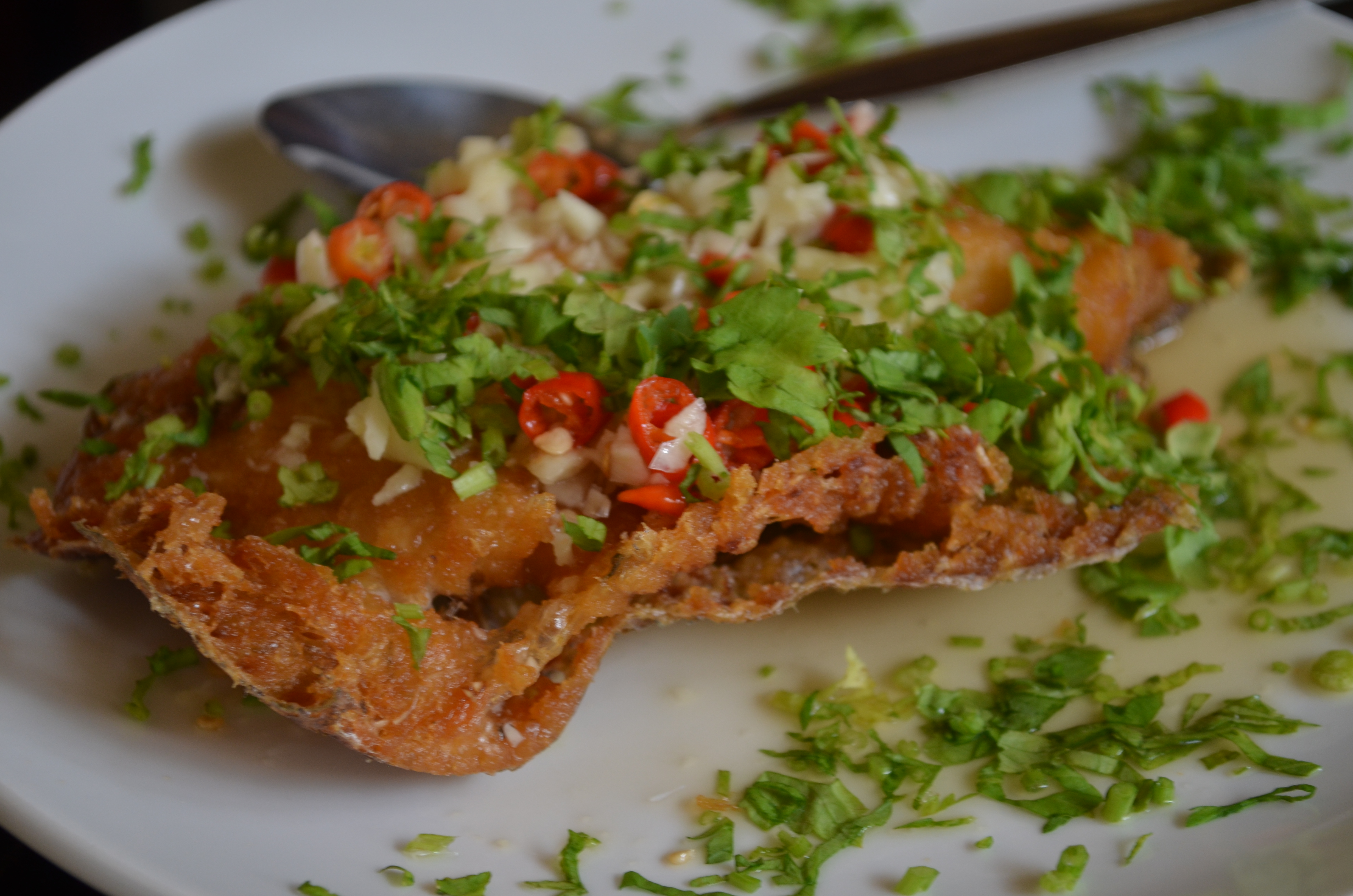The fish was amazingly fresh, light and flaky, fried to a perfect crisp around the edges and topped with a simple, tangy mix of herbs, garlic, lemon juice, and chilis.