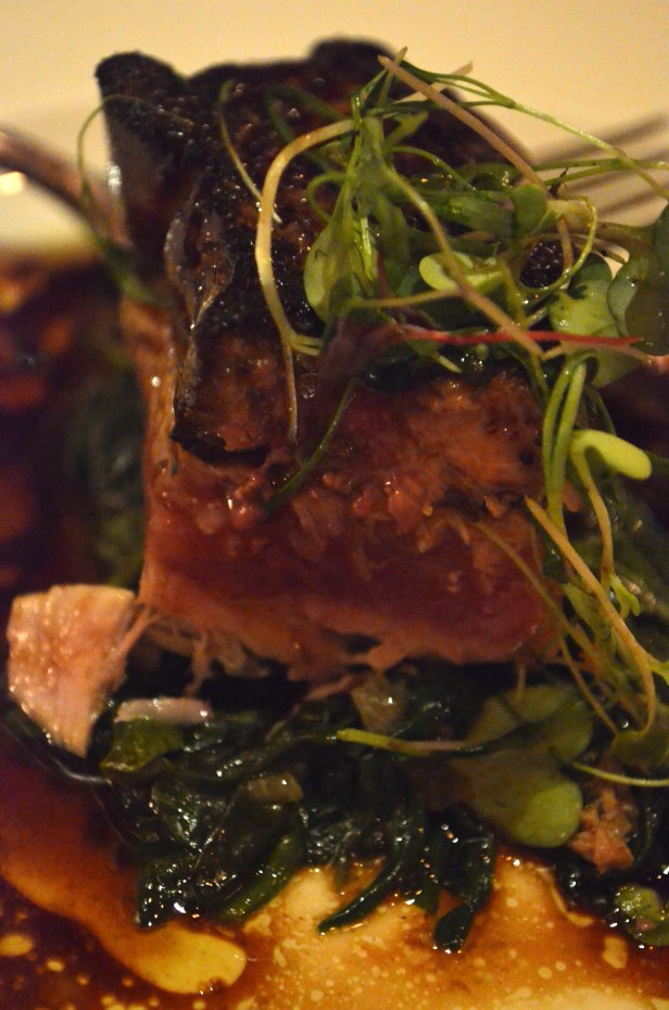 Our next appetizers were the ahi poke and golden / red beet salad (with toasted dalmatia fig and goat cheese crostini). The poke was very straightforward, no gimmicks in the presentation, but with incredibly fresh ingredients (avocados, scallions, cucumbers, seaweed) and seasoning (chili oil, lime, and tamari-ginger dressing) that brought out the buttery-ness of the ahi and avocado. The beet salad, while less remarkable, was nonetheless tasty, diced small and a decent topping for a bite of the crostini.