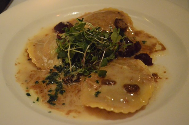 For our mains, I ordered the seafood special of the day, a generous filet of opakapaka (pink snapper) with macadamia nut crust on a bed of artichoke risotto. Myra got two appetizers as her main: the sweet kula corn soup and wagyu beef ravioli.