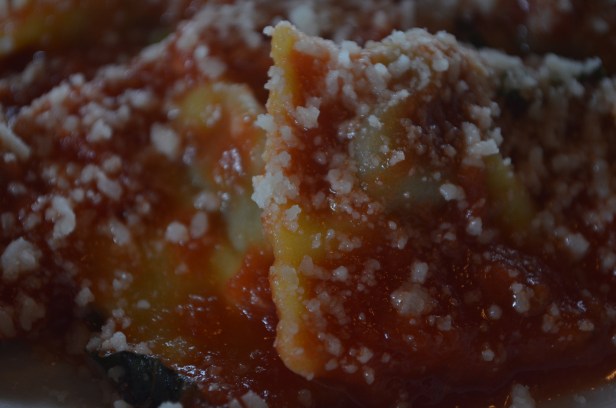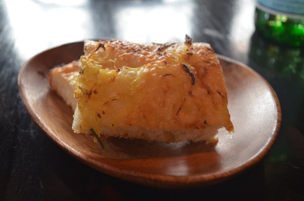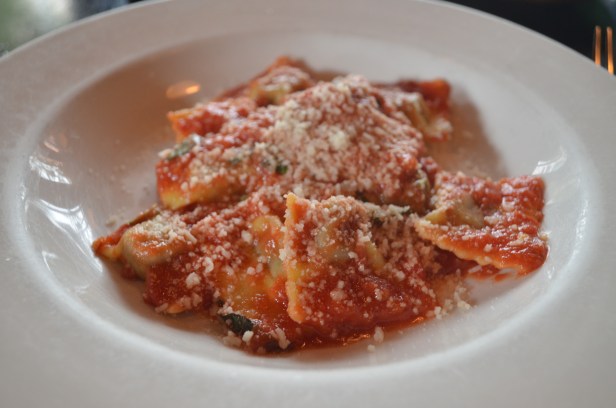 The lunch menu was very slim, just one or two single-column pages, if I remember correctly, and the decor somewhat nondescript in a trattoria way, halfway between speakeasy and steakhouse. The waiter, although not particularly warm in the mama-hostess sort of joviality that I love, was nevertheless unobtrusive and exceedingly polite, and helped me settle on a simple lunch of Grandmother’s Ravioli (a chef’s-special-recipe sort of simple fare dish, with multi-meat stuffing), a side of brussel sprouts (with pancetta, obviously), and for dessert a scoop of black mission fig sorbetto (oh, and a few slices of butternut squash focaccia to start).