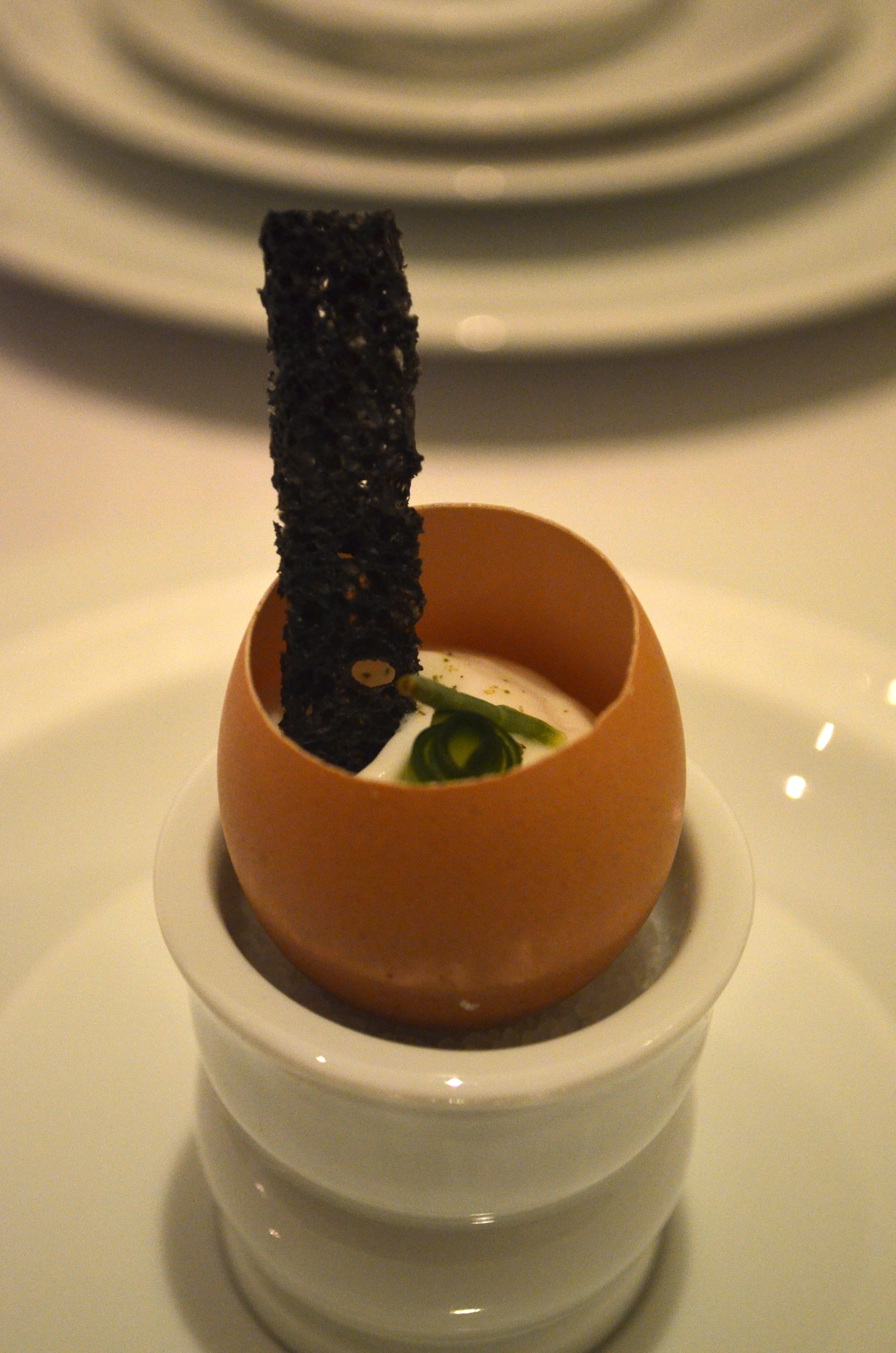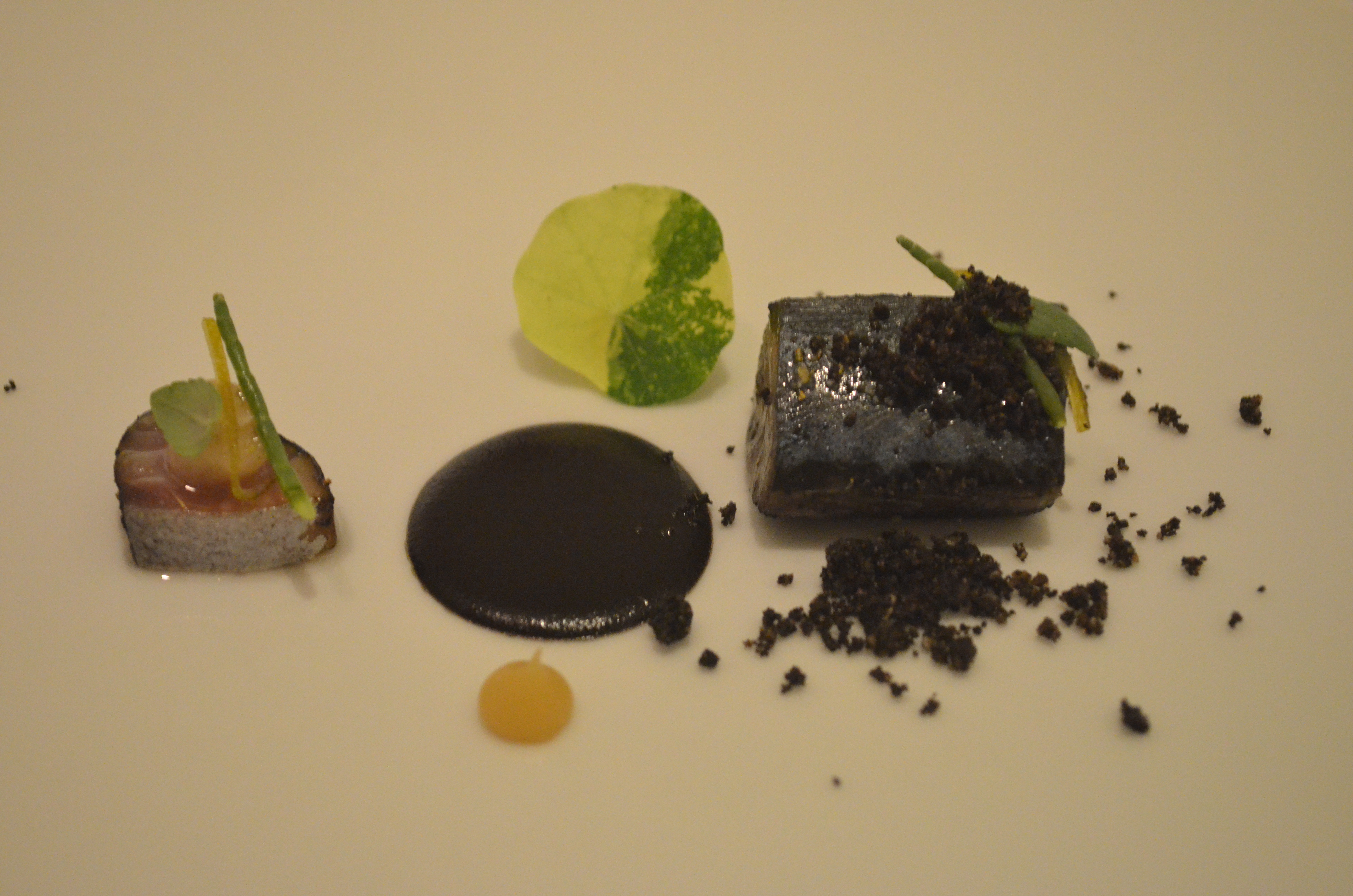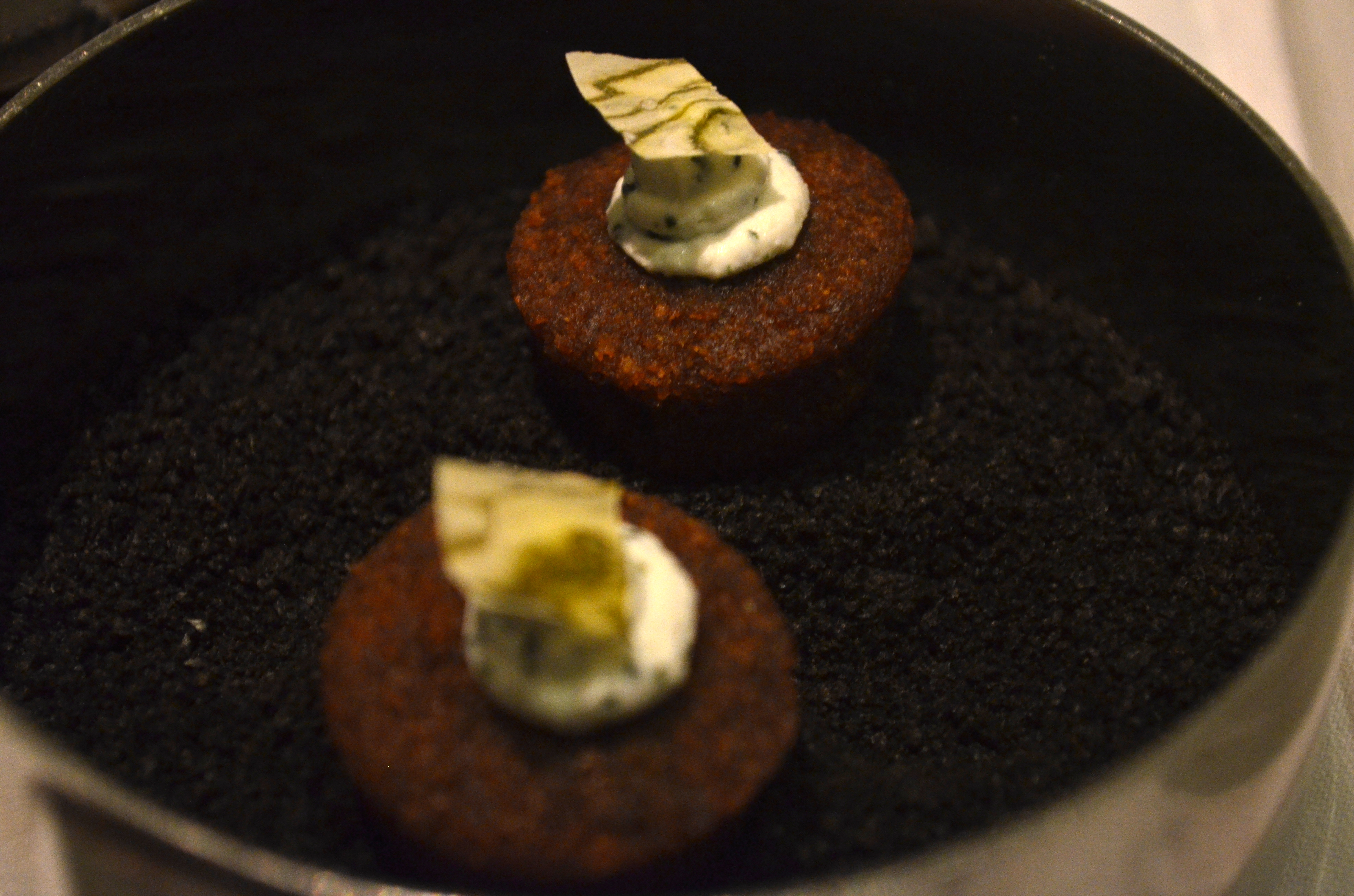 One of the amuse-bouche, really just a morsel of (potato) cracker, was filled with a rich Mornay sauce (think Béchamel on crack) with an overwhelming cheesiness. and the cupcake-like snack was interesting in terms of presentation, with a soft cake set atop a bed of dark powder so that when you pick each one up, it took some of the seasoning powder with it, and as you place it in your mouth the bottom, with the powder, is the first thing that hits your tongue. A good idea that I hadn’t seen often before, albeit probably pretty narrow in practicality.