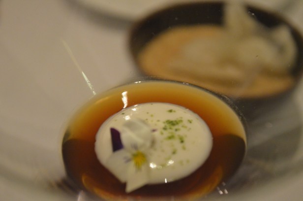 Corton’s mandarin mochi was one of my favorite creations of the week in New York – compact and unassuming, it was like a cold battery shock of citrus unleashed, flooding your senses with the tartness and tang of intensified mandarin just on the cusp of too much before fading. Next came Japanese mackerel, a fish whose grilled odor is the only real downside to Japanese izakayas – but again, Corton’s version was clean and simple in flavor, without that typical oddness, like sardines. It was paired with a small cup of milky broth (asparagus velouté?) with a gelee’d bottom – I’m going to refrain from making a fruit-at-the-bottom yogurt comparison, even though this sentence already crossed the line.
