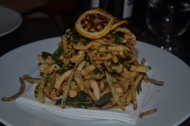 I’m a bit of a sucker for the texture mix of fresh raw fish sprinkled with flakes of sea salt – or rather, flakes of sea salt on almost anything, really. And while the picture above only shows the mushrooms on top, the polenta below was an amazingly creamy underbelly, a savory rich pudding. While the calamari itself didn’t particularly stand out, fried herbs and especially slices of lemon are slowly climbing my list of cravings.