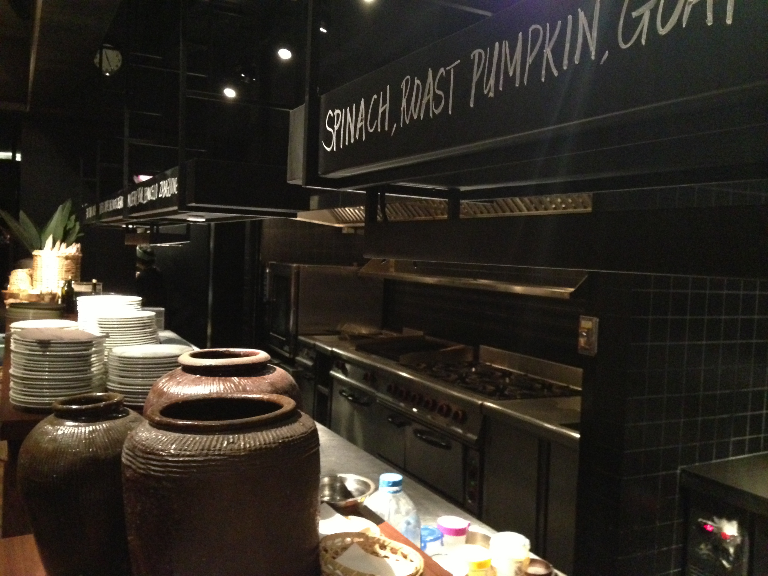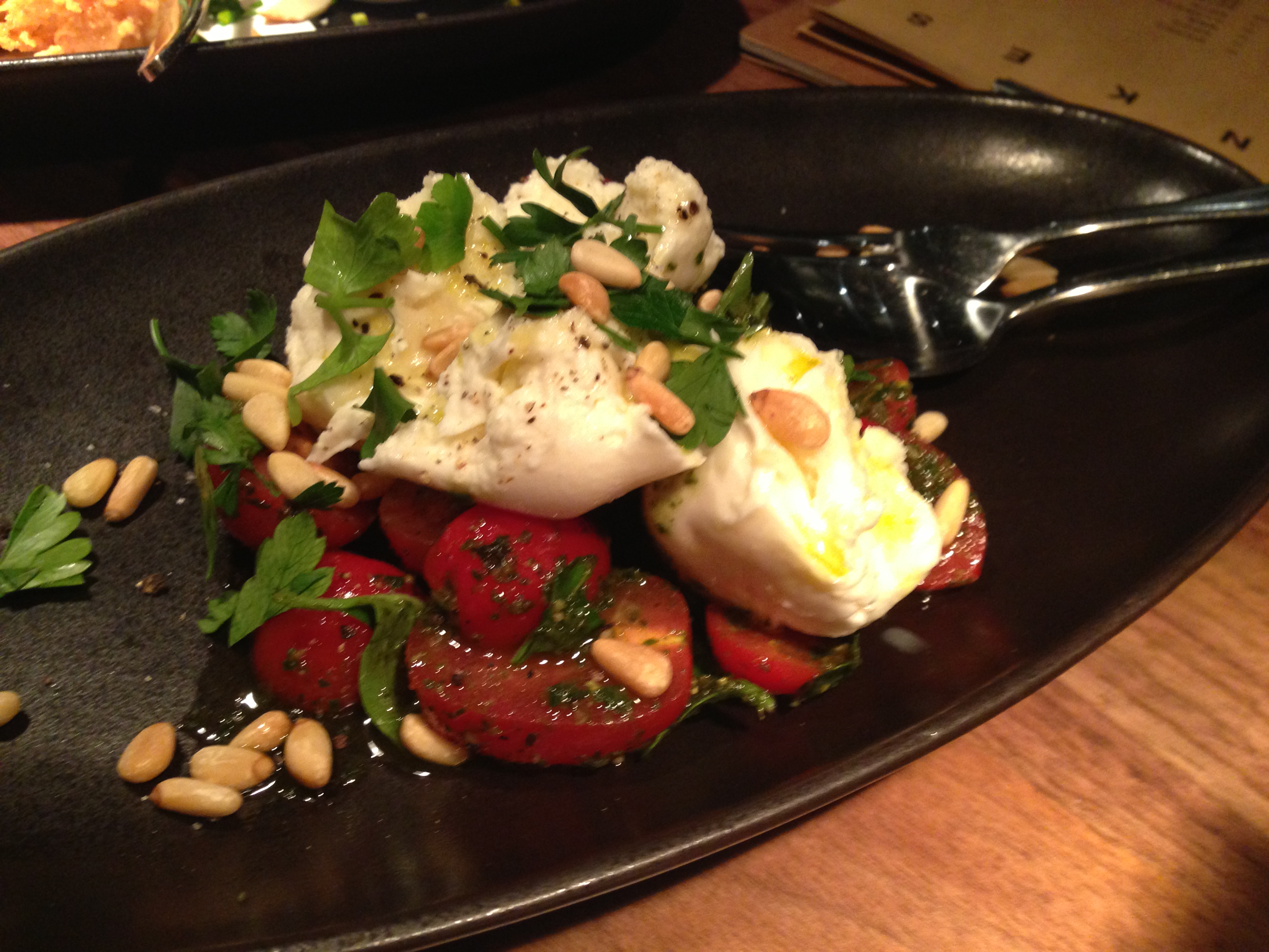 Our friend Fanny was back in town from Hong Kong, so a small group of us gathered for a relatively late dinner. We started with a few things to share – grilled king prawns (with apple and fennel salad), fried calamari with pistachio, a caprese salad of sorts (with pine nuts), and a cheese platter (taleggio, asiago, and gorgonzola, with walnuts and dried figs). The prawns were quite plump and tasty, with a good dose of smokiness to contrast the thin, very tart slices of apple in the salad. The calamari was passable, appropriately crispy but the squid itself was too thin and flavorless to notice.