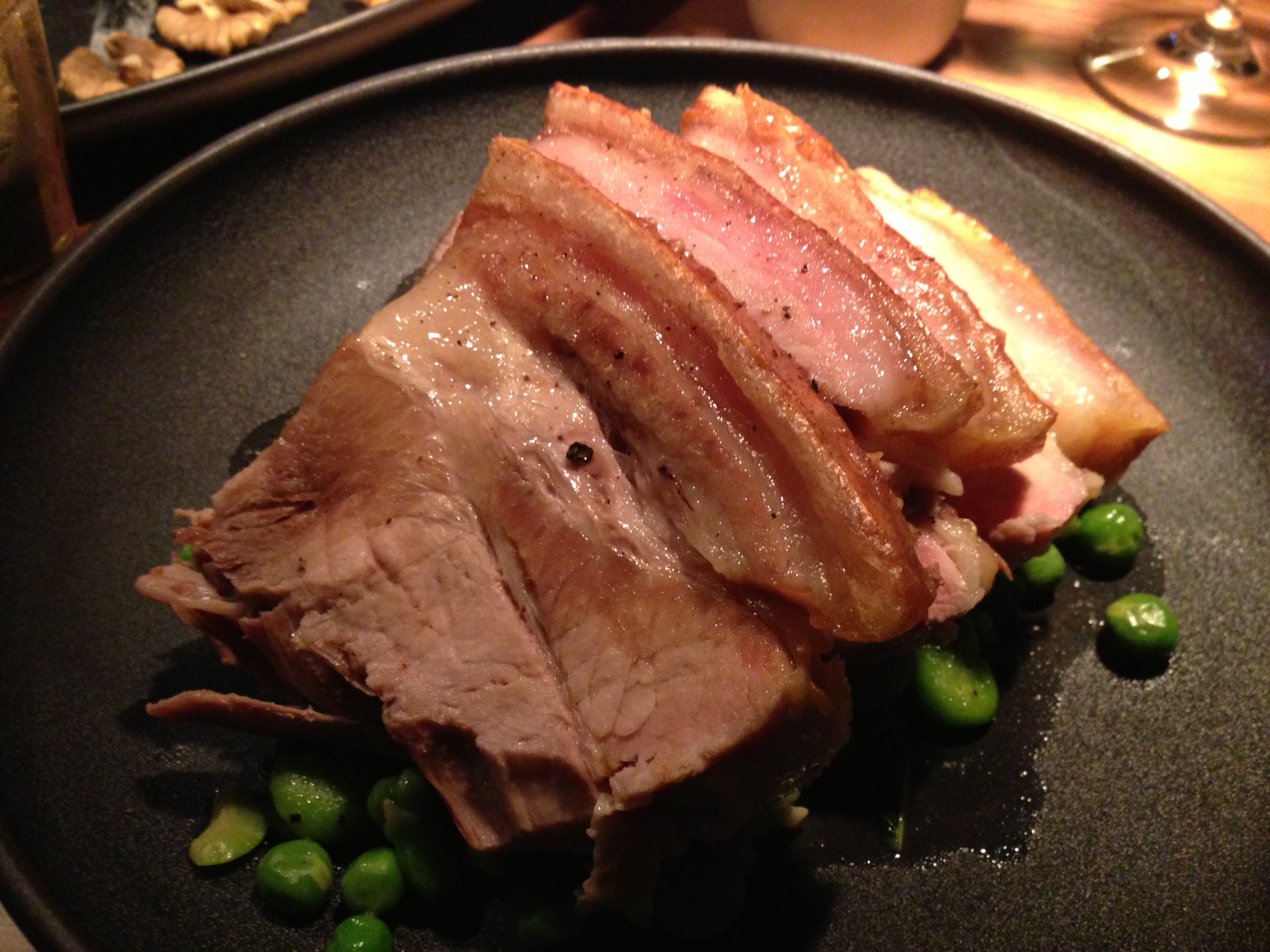 I ordered the roast (Serrano) pork neck as my main, and pecked at some of my neighbors’ sides (roasted carrots and squash gratin). My pork was well-cooked, with a layer of crackling and a little saucer of sweet mustard that went really well with the fatty meat. The carrots were also tasty, enhanced somewhat by a likely-generous application of sugar, while retaining a decent crunch.