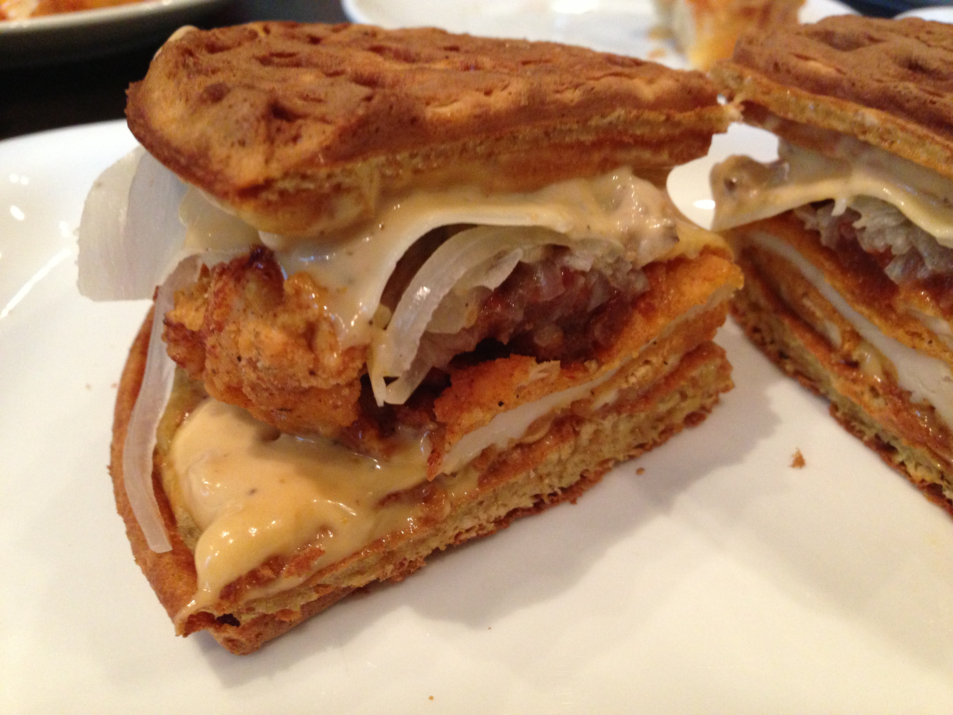 Either way, the country-fried wagyu steak (with chorizo gravy) and the chicken waffle sandwich were still available, so I ordered them: