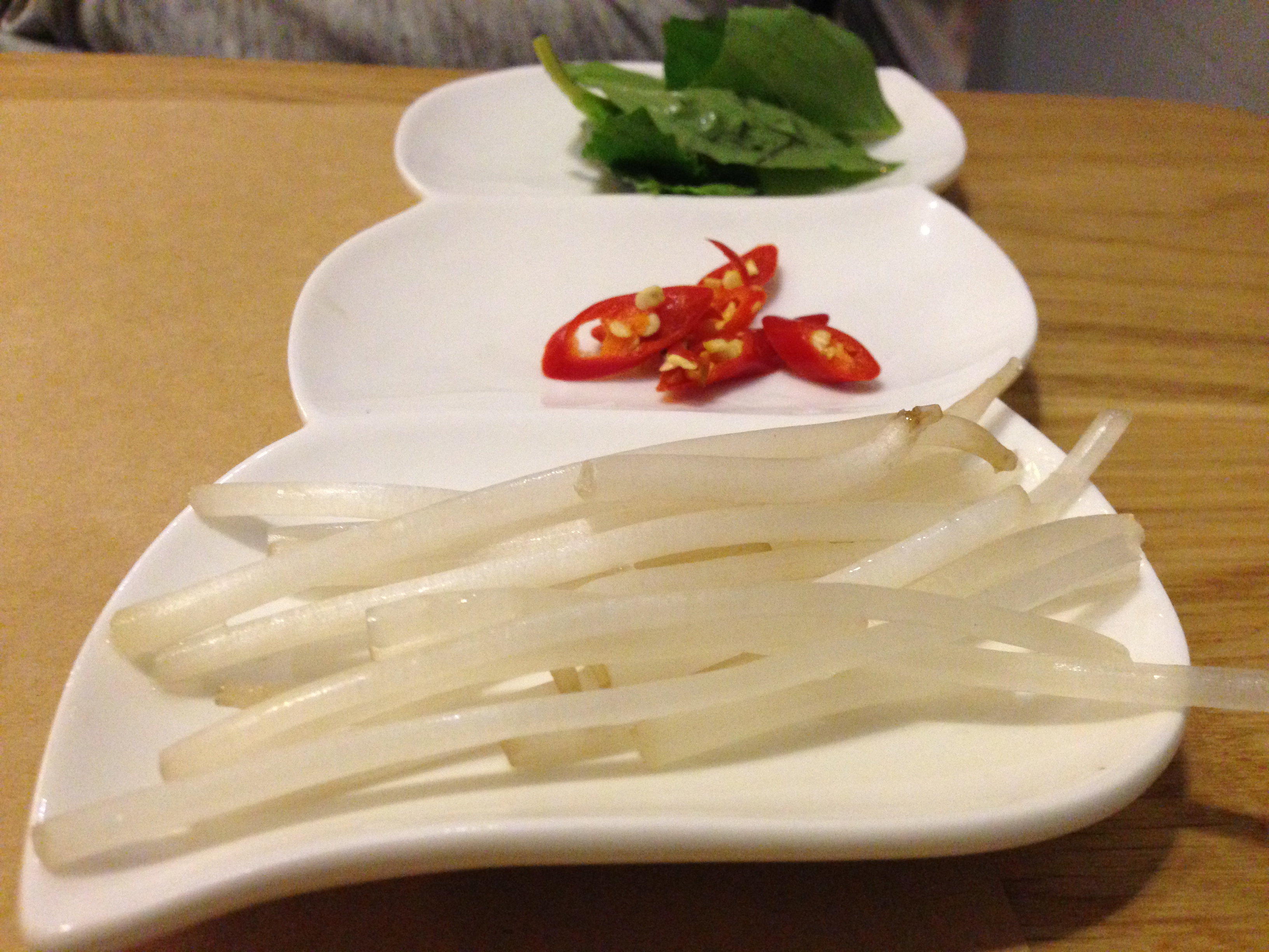 We ventured upstairs once but the staircase is a dauntingly steep and not worth the fuss if there are seats downstairs. As for the food, I suppose I’ll have a much better point of comparison in about two weeks when Myra and I head to Ho Chi Minh City, but I found the beef pho and the pork chop (the other thing I usually order, with either rice or bun noodles) to be pretty reliably tasty. The soup isn’t complex or unique, but a squeeze of lime and some peppers help you deal with it. The noodles are consistent, slightly salty, and the beef balls are potently savory in that fried garlic sort of way.