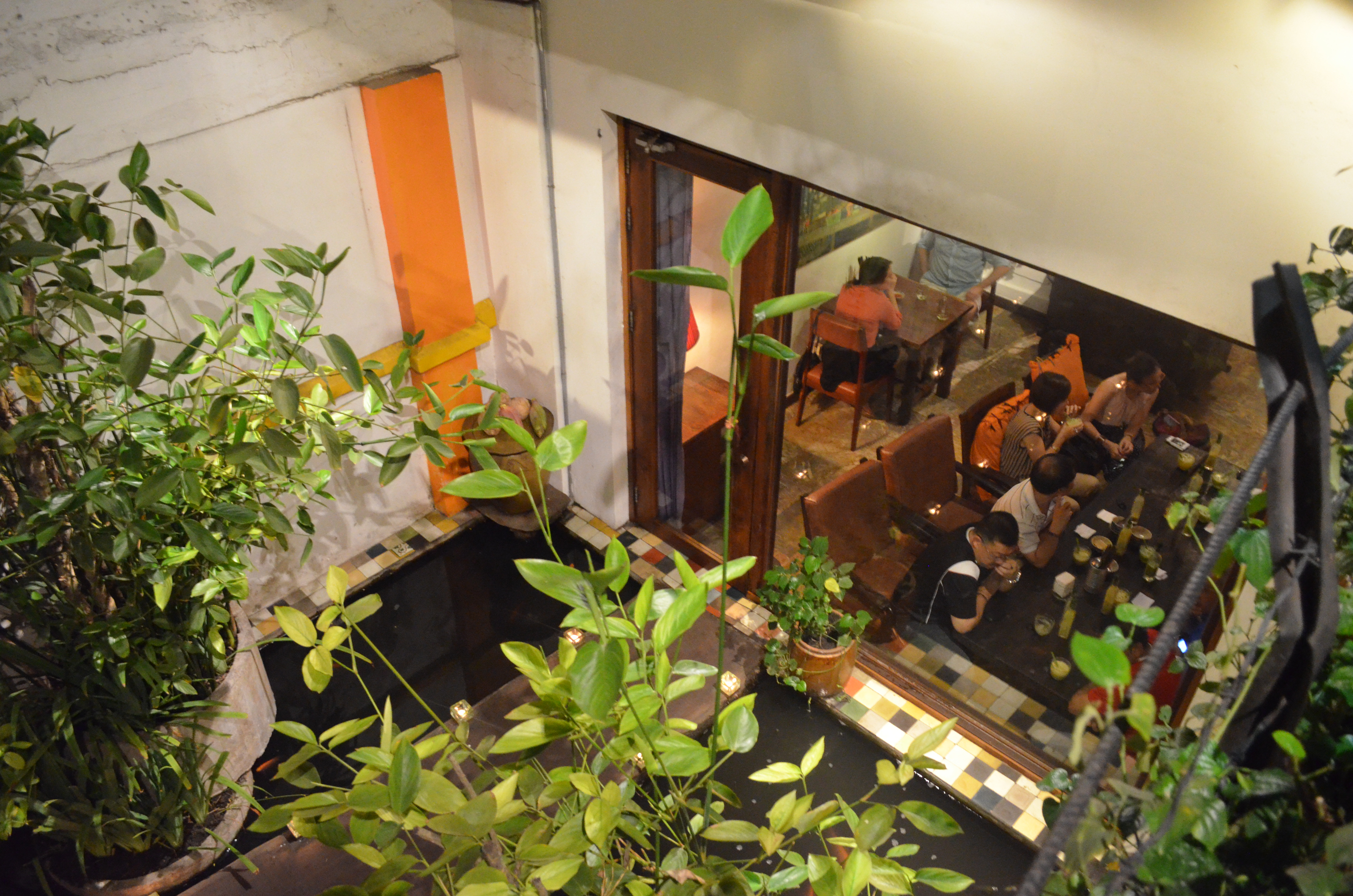 Because they didn’t have a table on the first floor, we climbed a steep wooden staircase (I don’t know why they built it over a floor-level aquarium, but whatever) to the second floor.