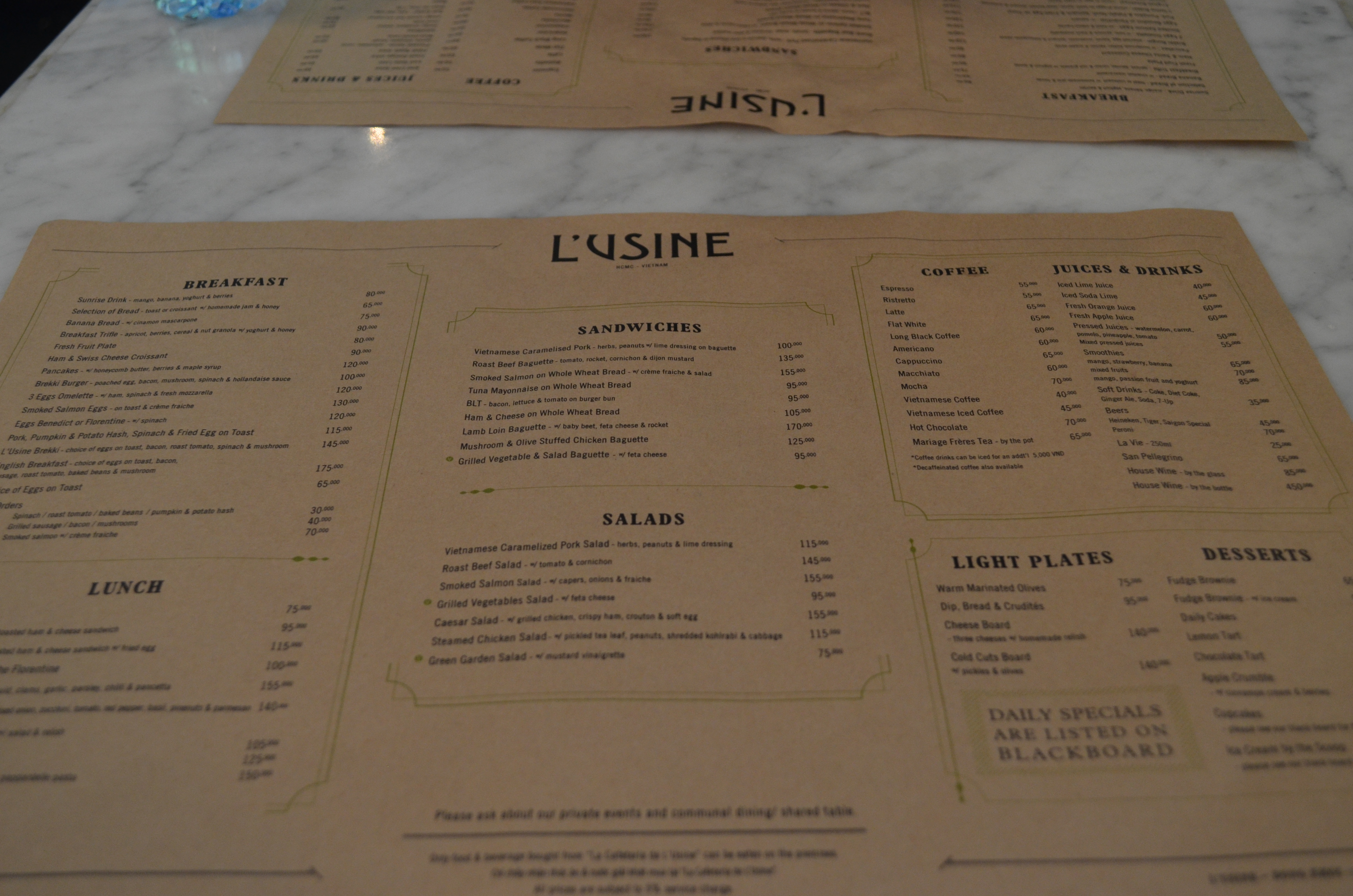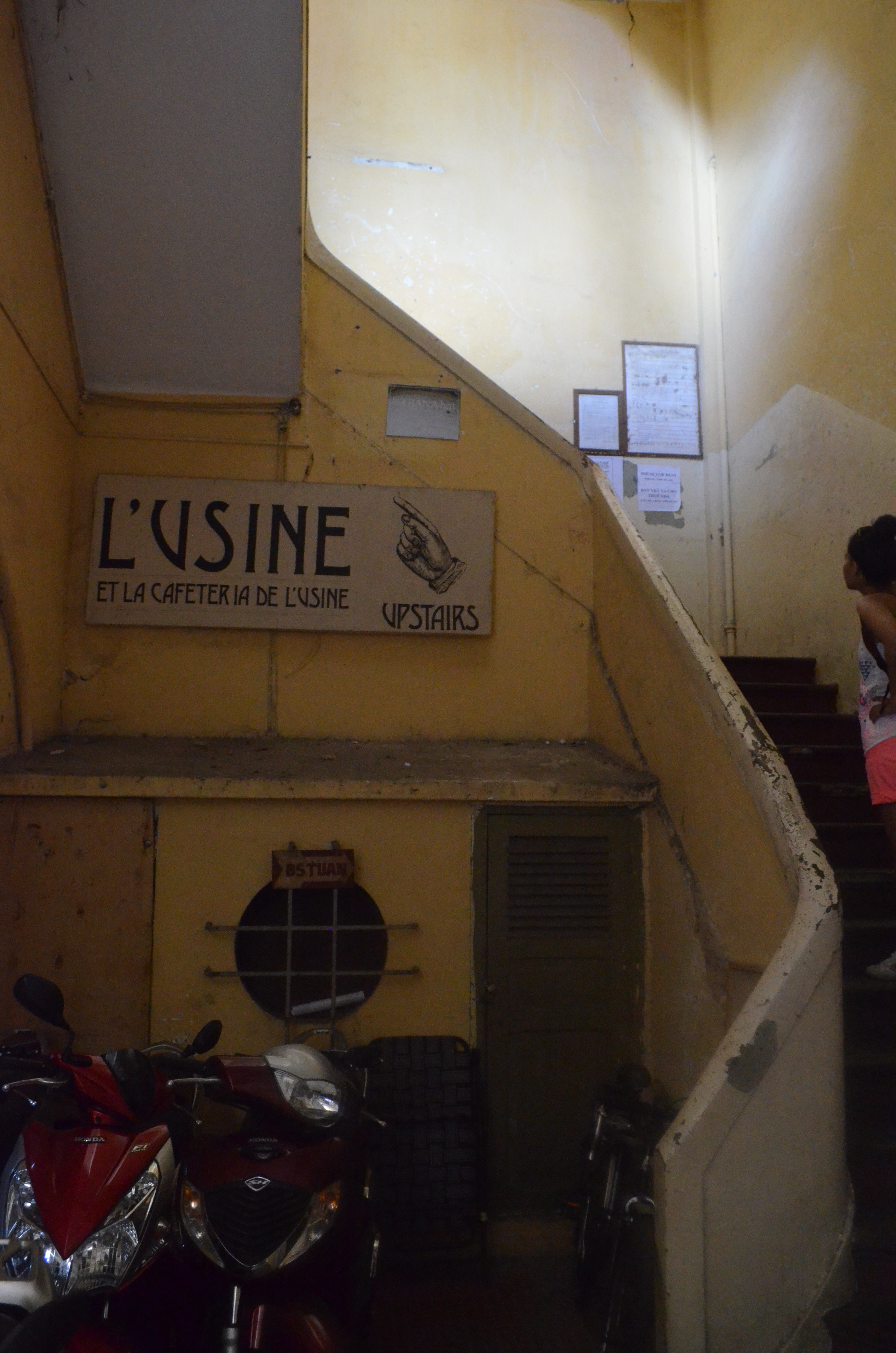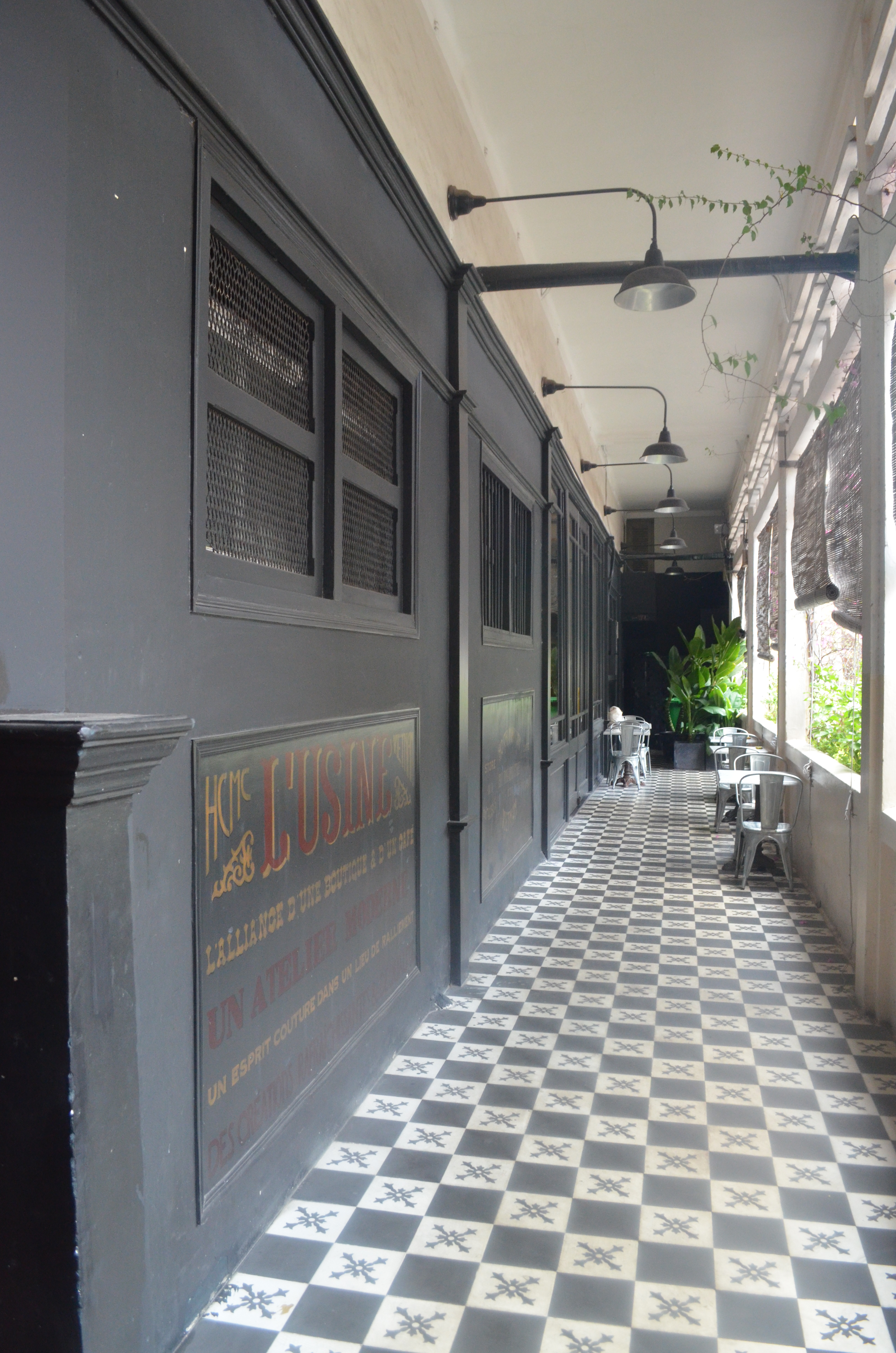 Another recommendation courtesy of our Shanghai friend Winston, L’Usine is a hip shop and restaurant/coffeeshop in District 1, tucked away in the second-floor of an otherwise unmemorable collection of galleries, boutiques, and scooter parking. Up a narrow turn of stairs is L’Usine’s corridor, its tiling, color scheme, and signage very reminiscent of a nostalgic French bistro.