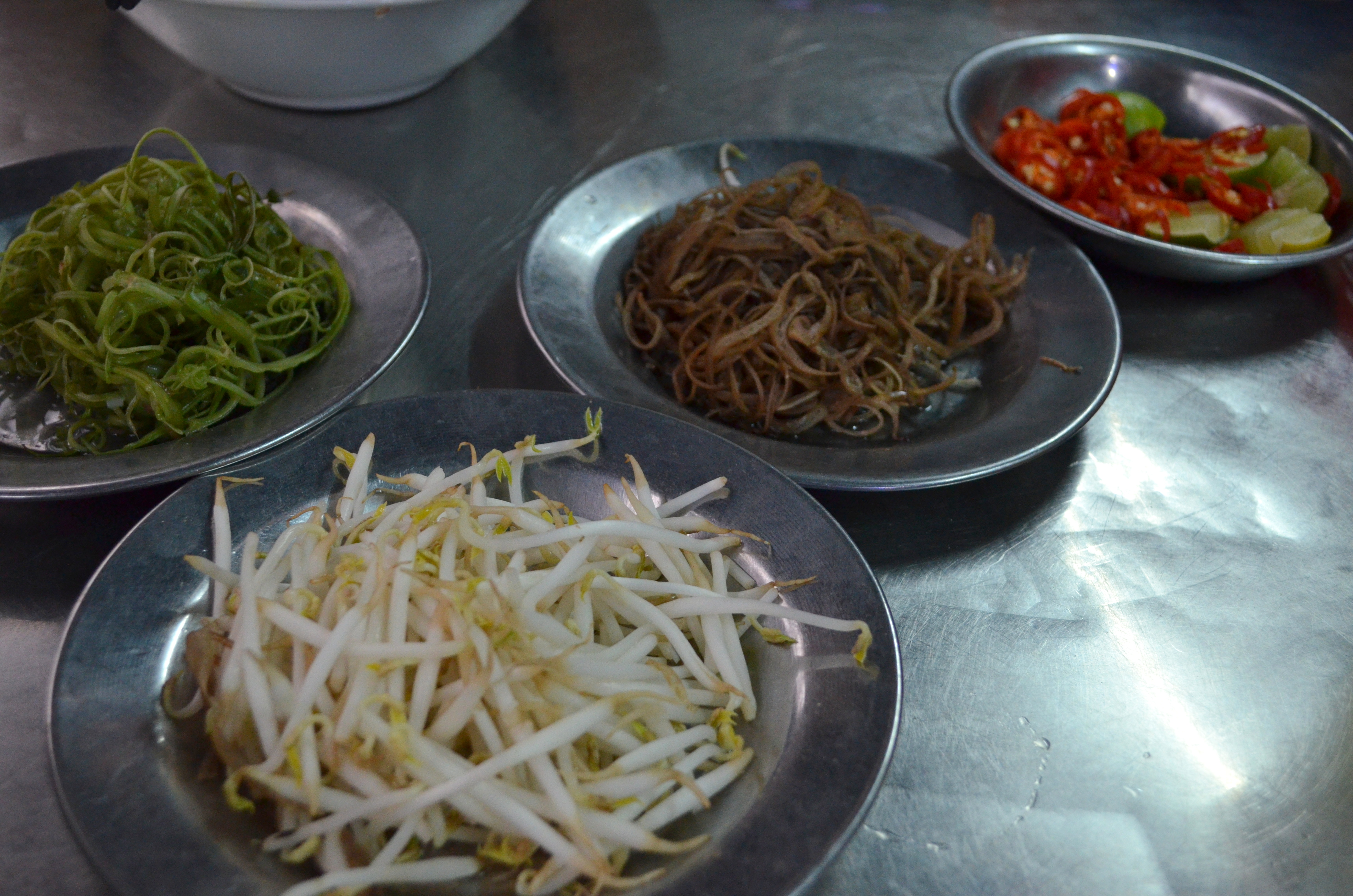 There’s a whole lot that I enjoyed about the food experiences in Vietnam, but one of the more fulfilling details was how simultaneously fresh and copious the garnishing dishes were: the bean sprouts, the basil & mint leaves, the chopped peppers, etc. It was such a departure from the careful, miserly arrangements that we’d seen in China and sometimes even in the States, as if a little celebration of the bountiful land.