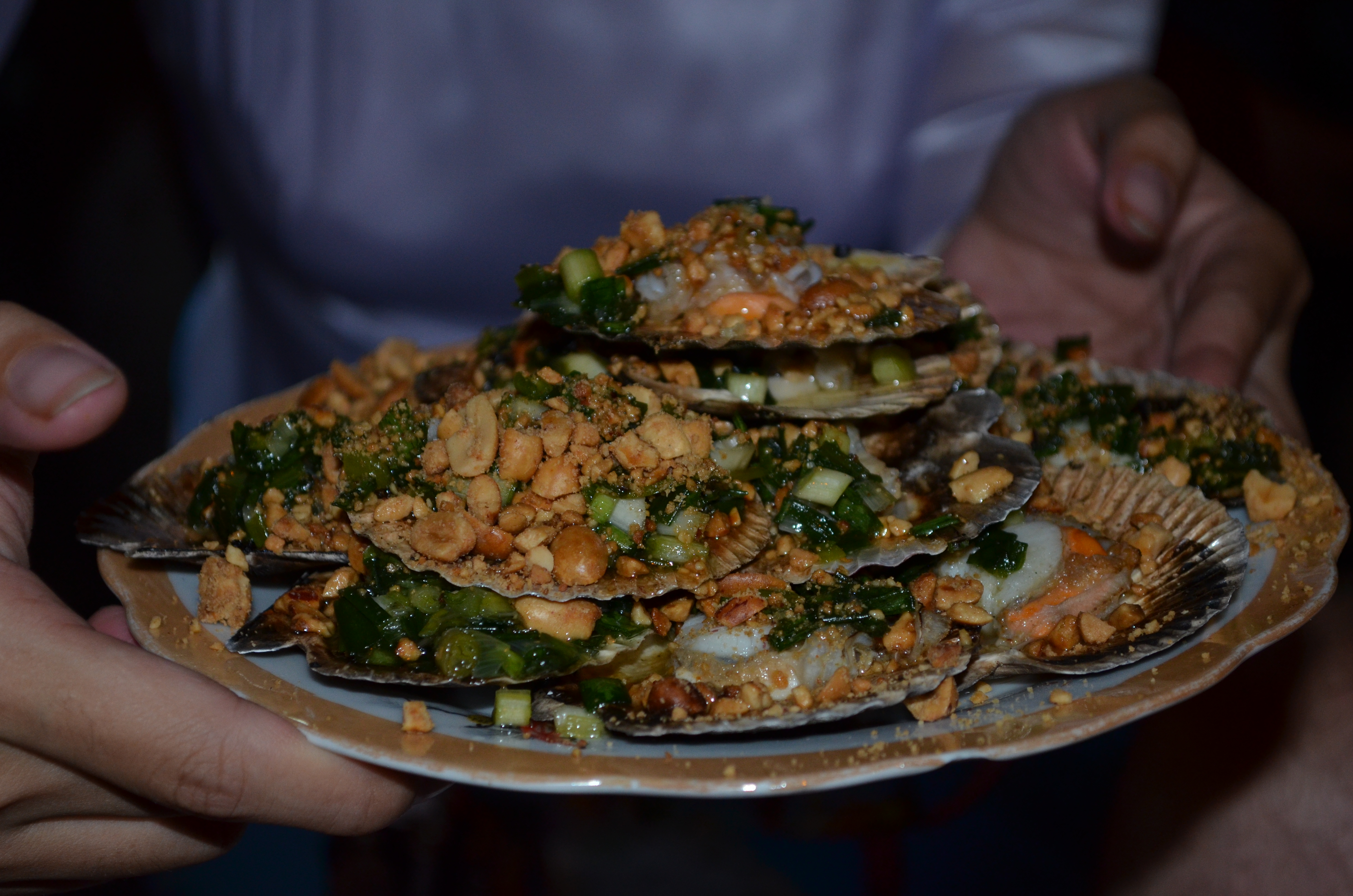 Our last stop was another street-side eatery, somewhat indistinguishable from the other places along the block. We were treated to more seafood and meat: grilled quail, a Vietnamese version of chili crab, scallops topped with pork-fat-fried scallions & peanuts, clams in a sweet citrus-y soup, all washed down with cold soy milk.
