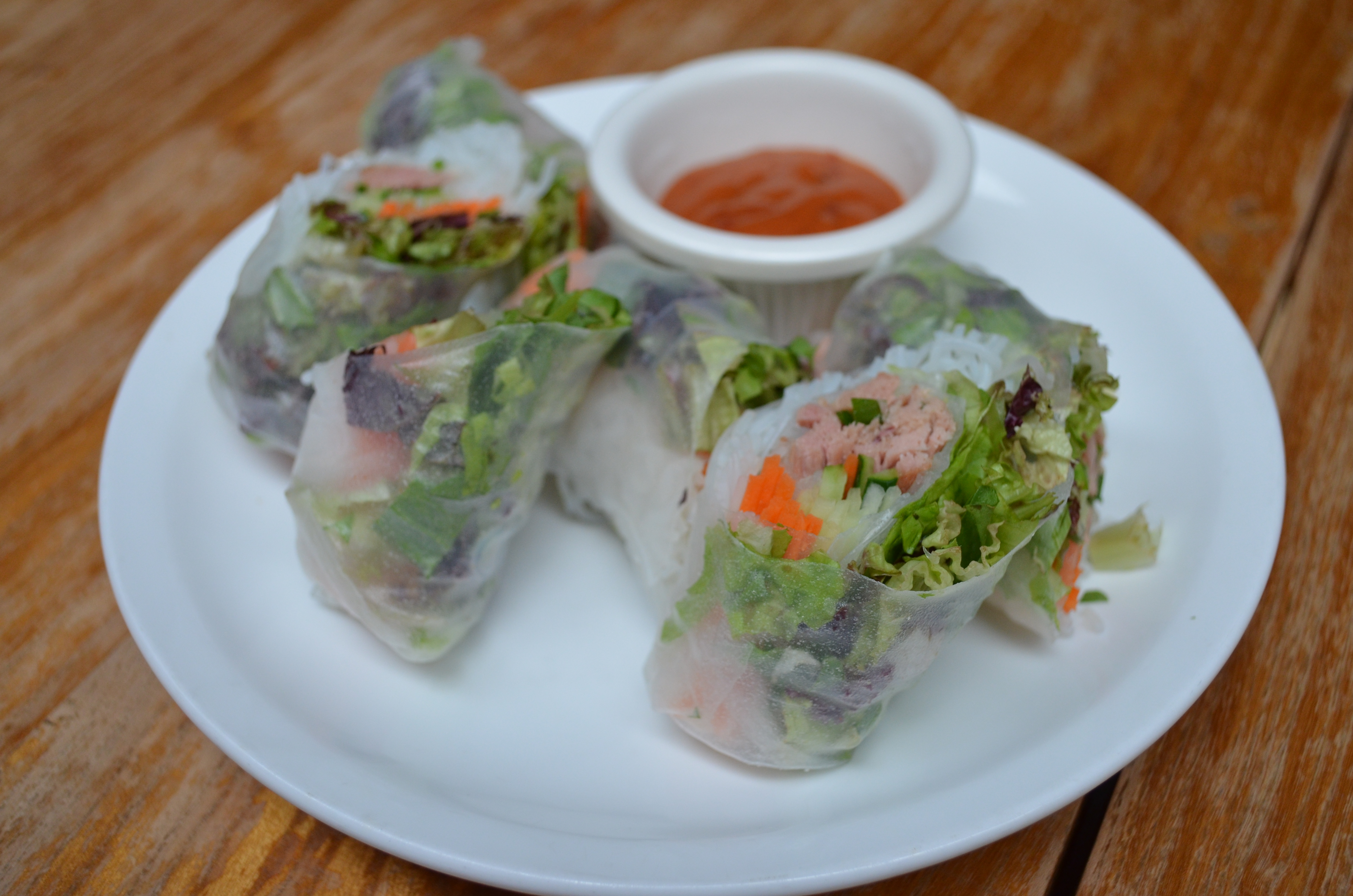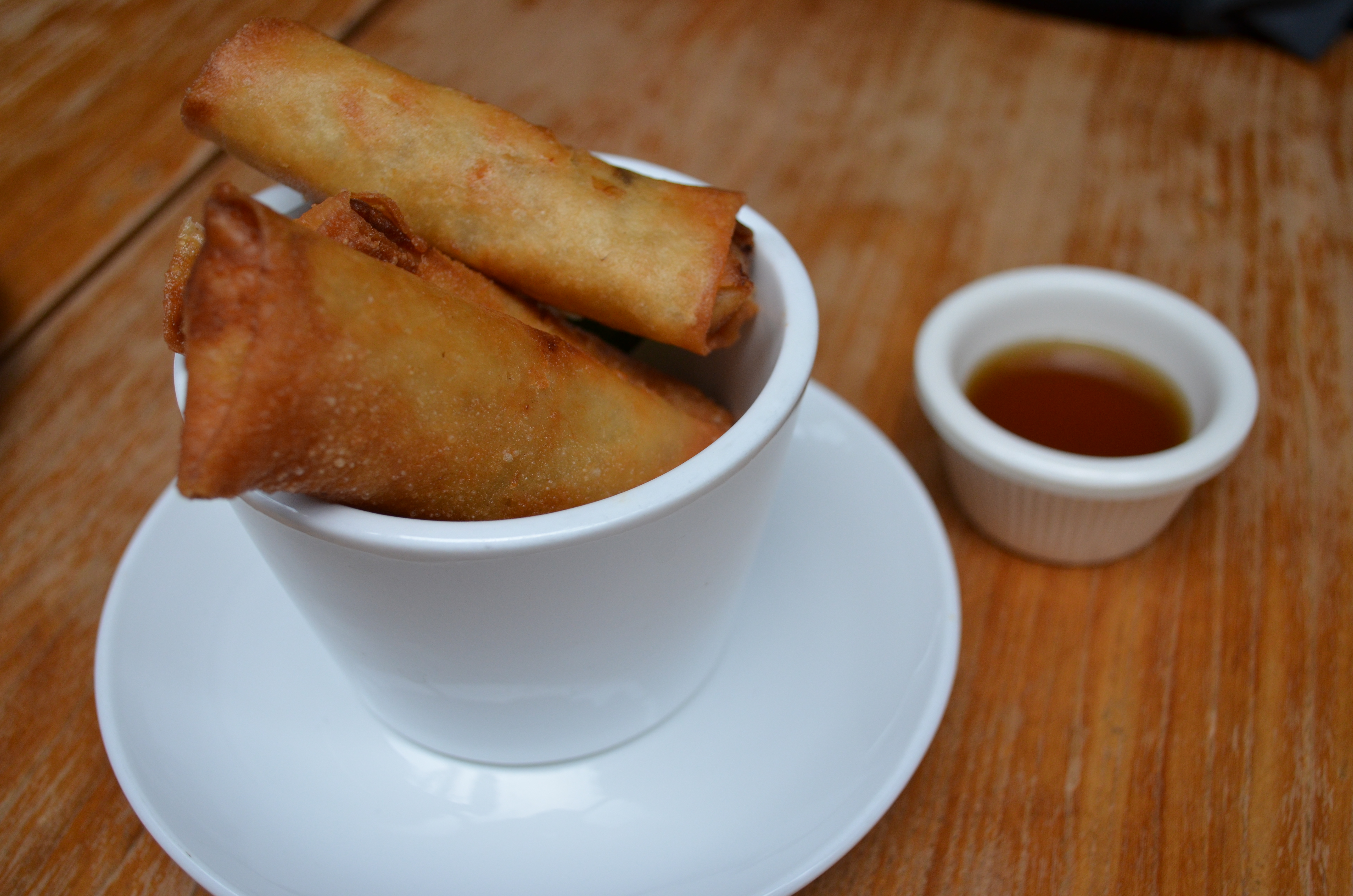 So we ordered the things that we missed very, very much. Green papaya salad with orange and watermelon, pulled pork summer rolls, and Shanghainese spring rolls.