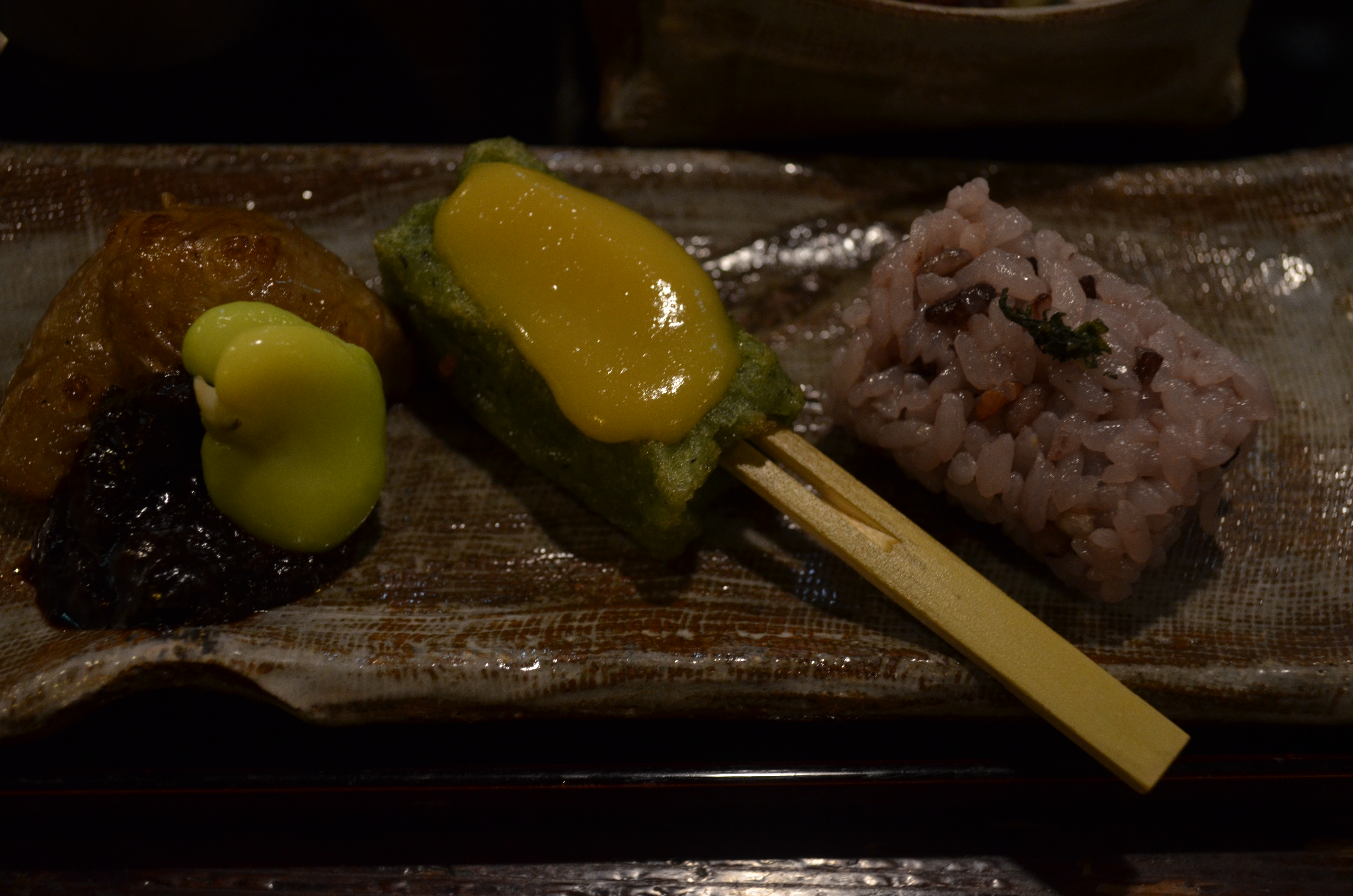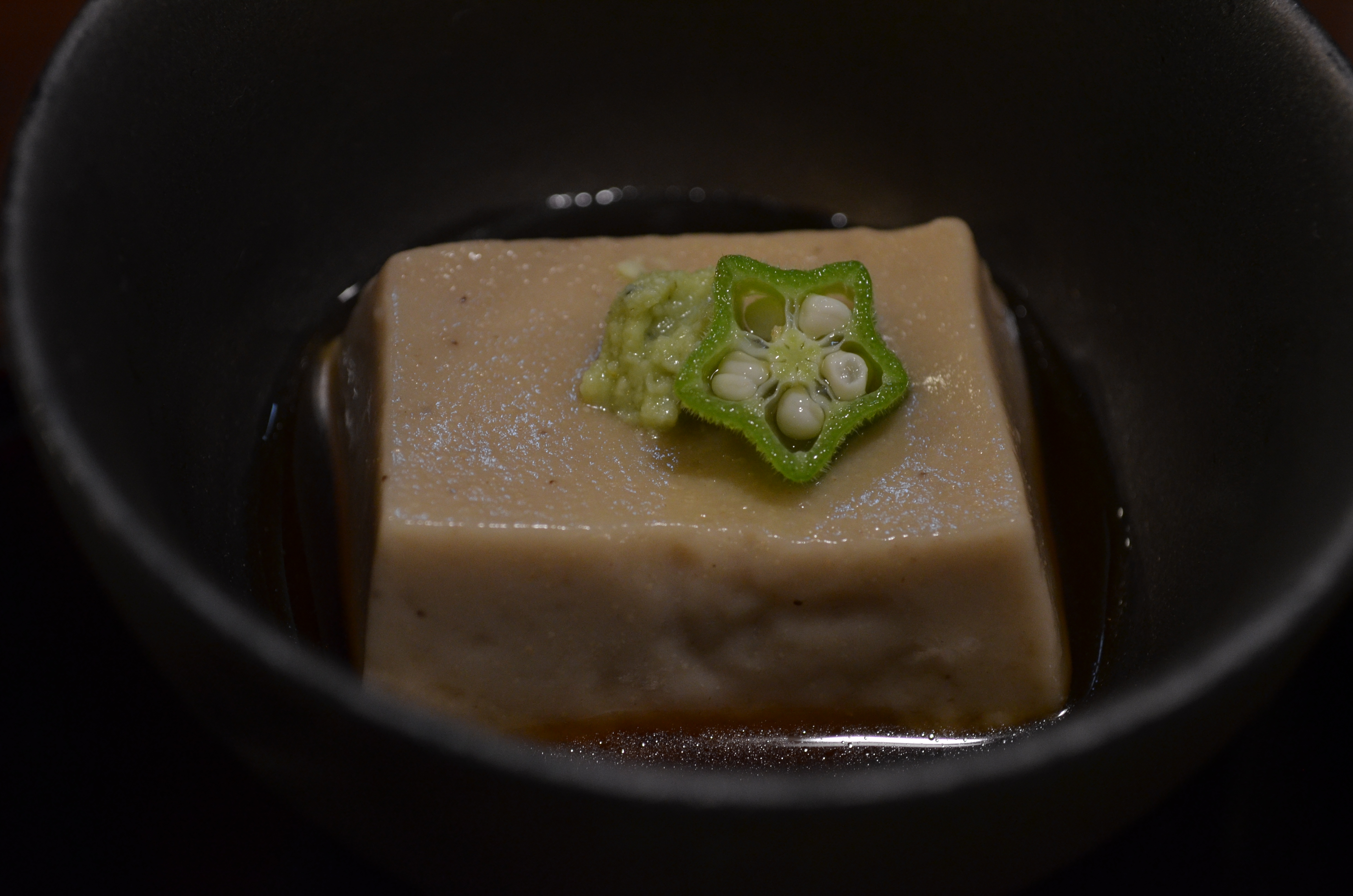I ordered the most abundant set menu, which came with an assortment of appetizers: sesame tofu, tofu sheet sashimi, deep-fried namafu & kikuimo (globe artichoke) with minced-meat miso, and a candy-sized piece of purple-tinted rice cooked with a confederacy of sixteen different grains. The sesame tofu was a revelation of smooth, intense sesame flavor (if only all tofu packed that much flavor), while the nama-fu, just as gummy as the oden version served up at Hokkoriya, was a burst of miso and umami.