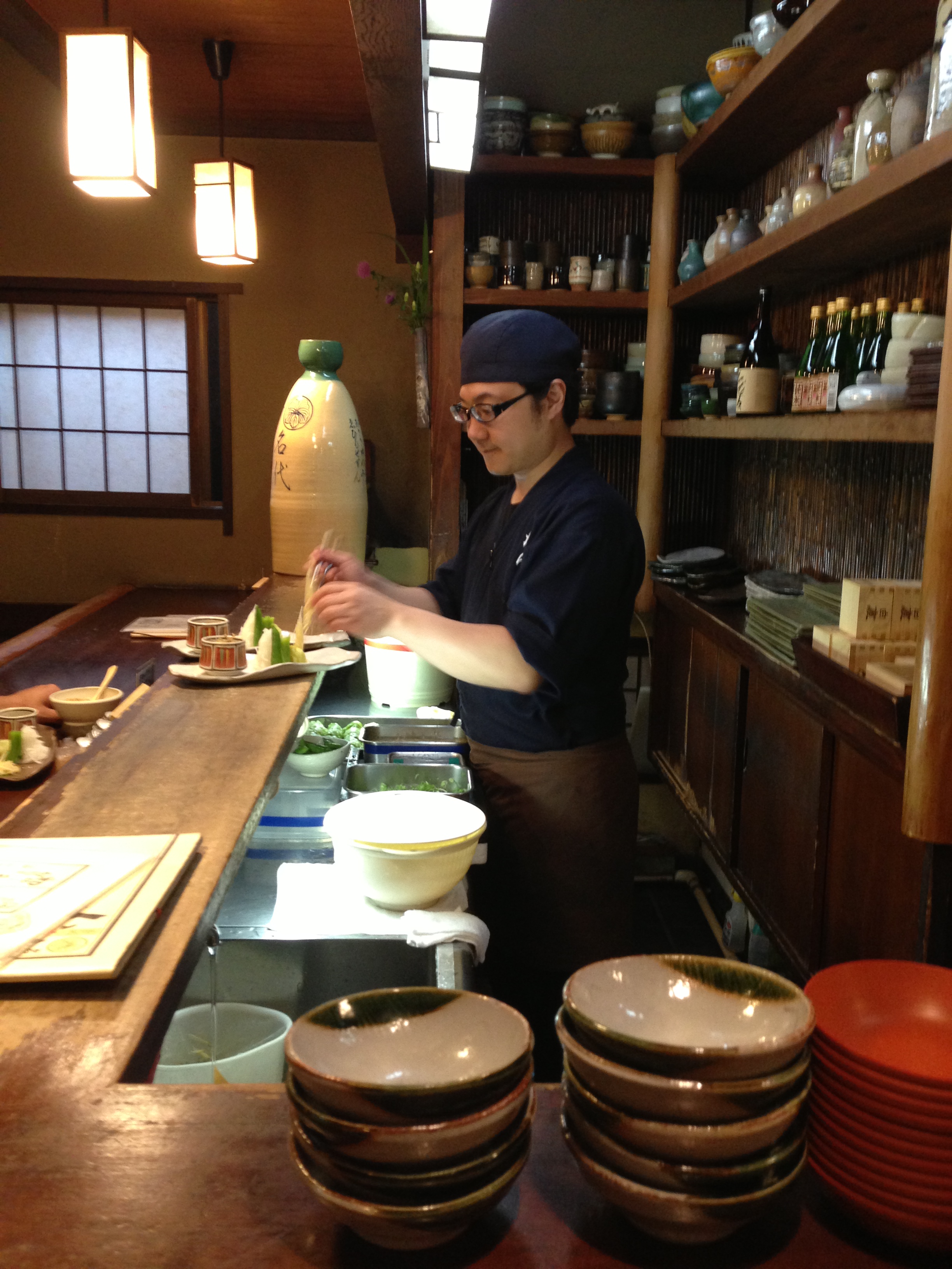 The shelves behind the bar are stacked with funky bottles and bowls of all sorts – sake, sauces, soups, tea – and as soon as you (or anybody) orders udon, the barman sets about plating the mixing vegetables.