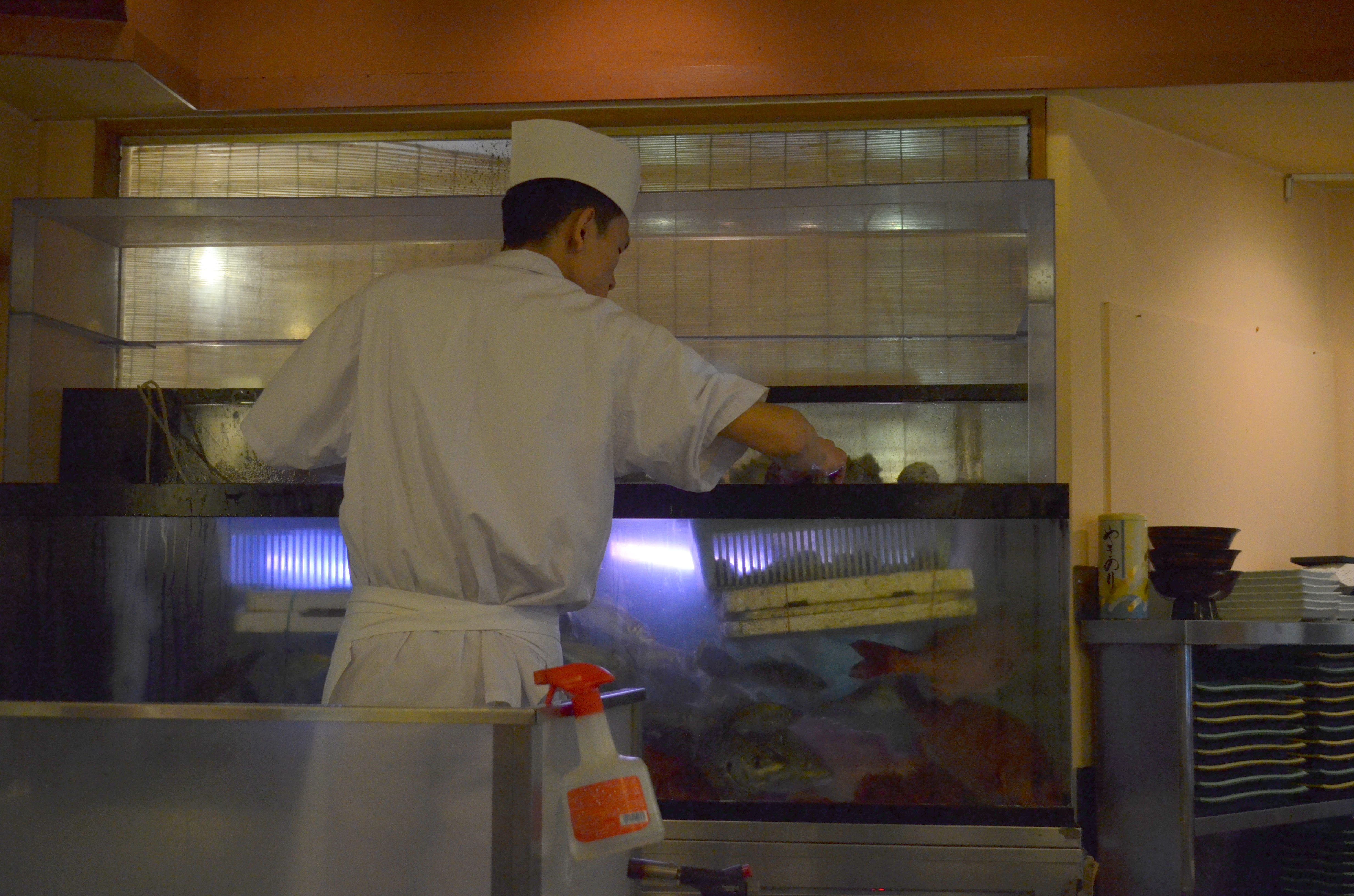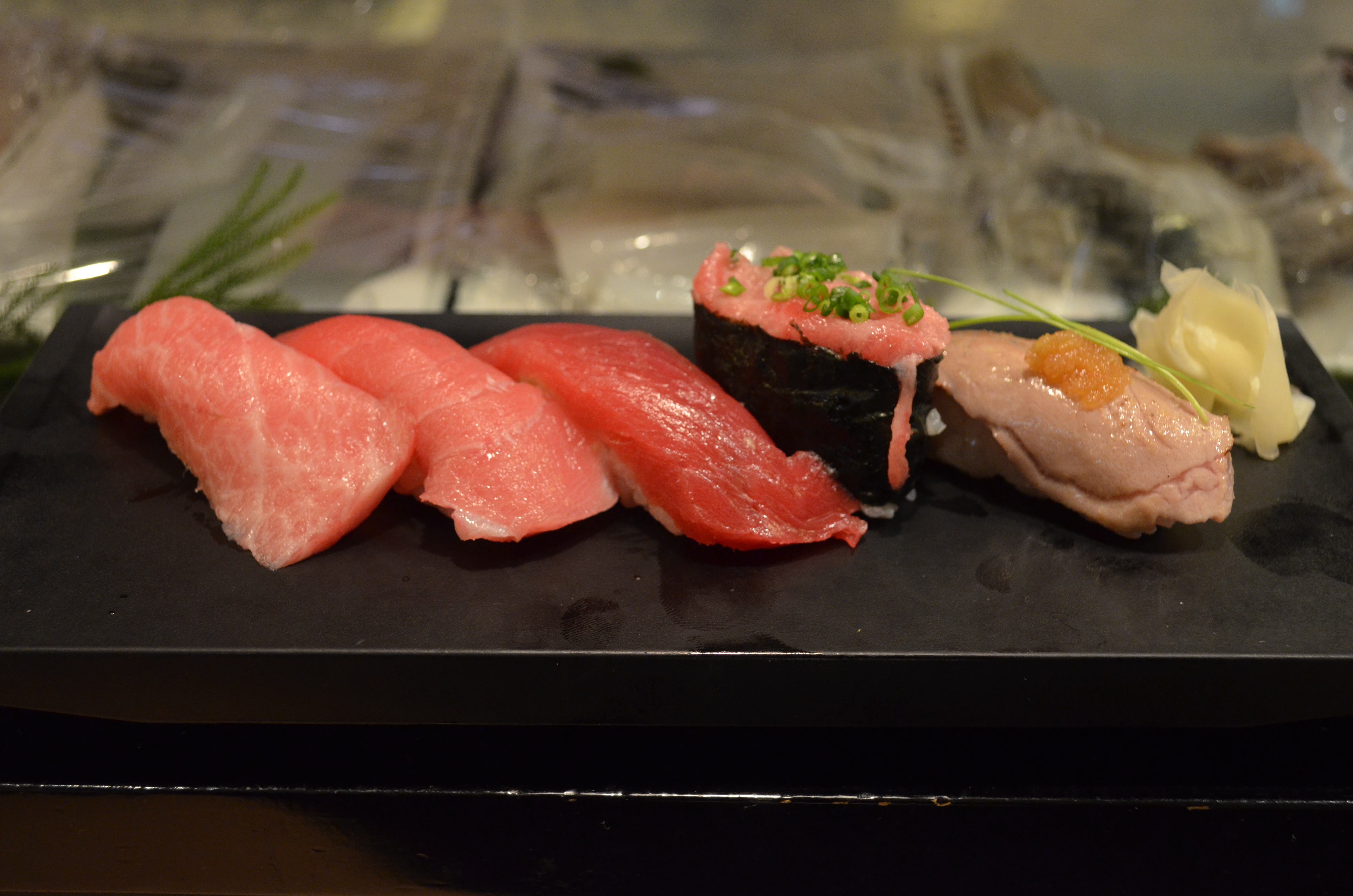 After taking one of the last Shinkansen trains from Kyoto, then crashing first on a lobby hotel in the glamorous Imperial Hotel (and then for a few hours on the floor of a swanky room in the Imperial Hotel), oversleeping the tuna auction, I shuffled groggily out to join my friend Kavita, who was serendipitously in Tokyo on a business school trip, and some of her classmates for some breakfast sushi at Tsukiji Market.