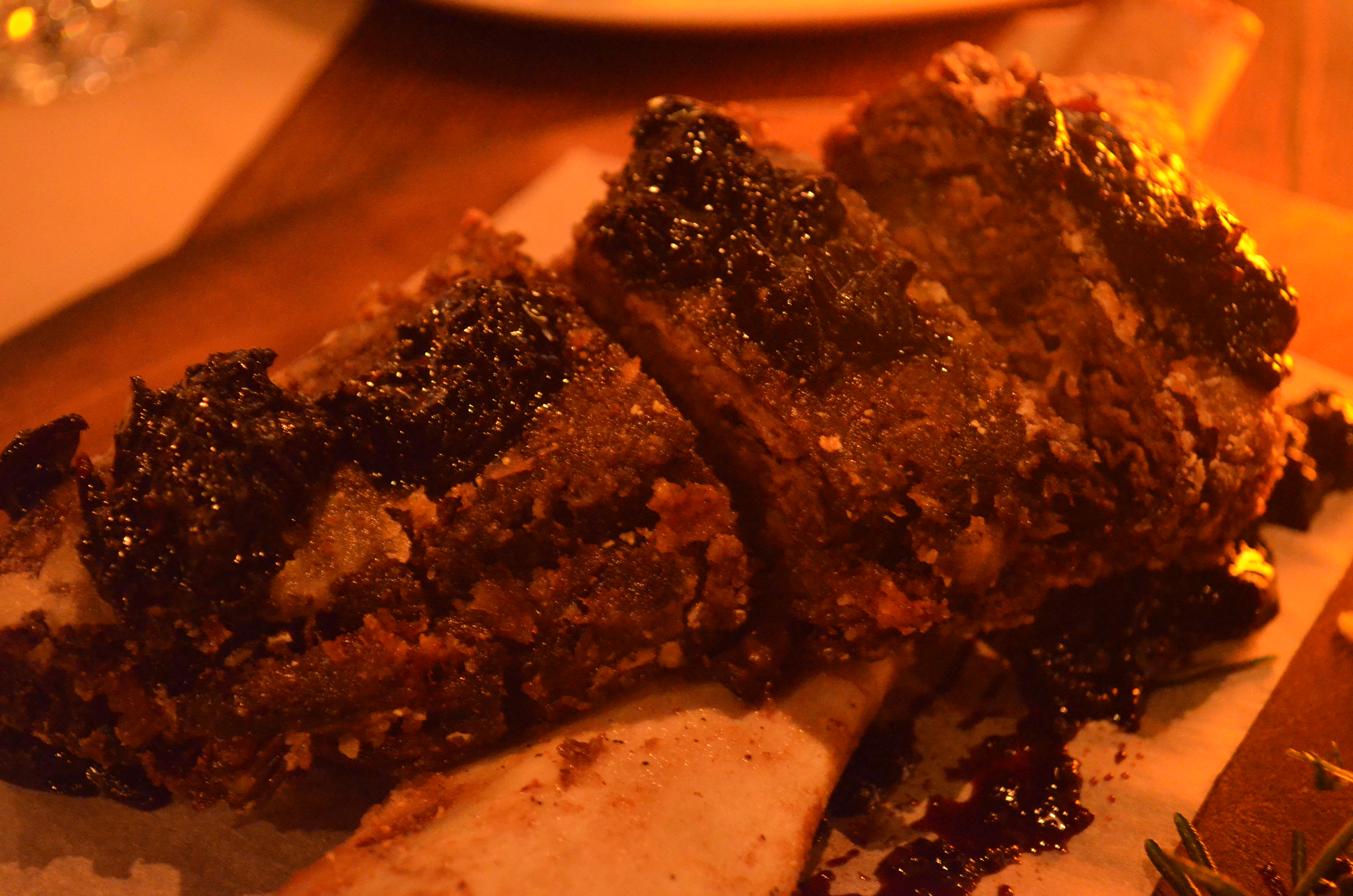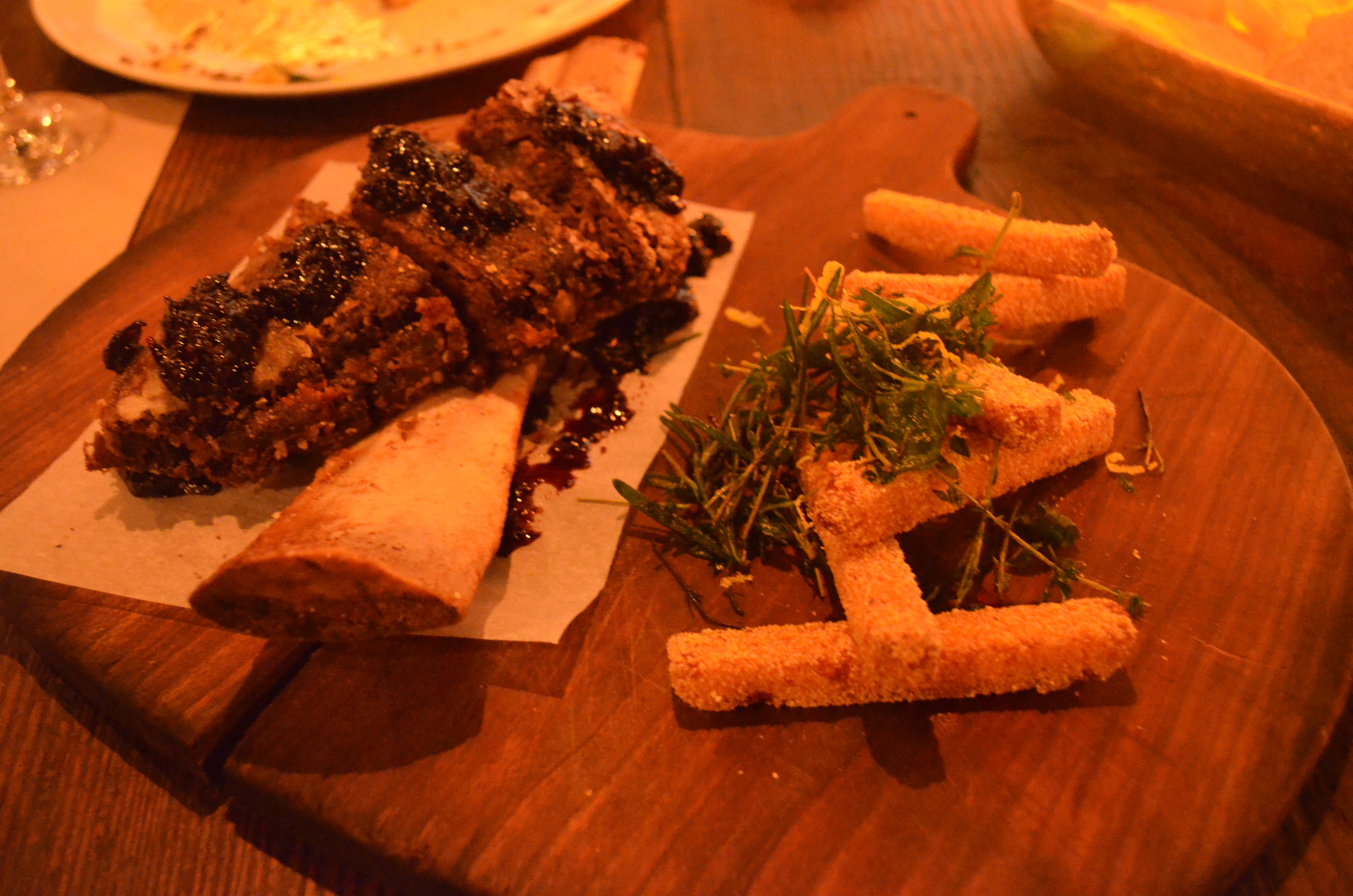For our main, we shared a crispy beef short rib with polenta fries. The combination of chili glaze and beef was unique, a mild, lingering spiciness, almost endlessly crunchy where I would otherwise have expected fatty and tender (too many beef ribs at BBQ joints). I would’ve welcomed more softness in the meat, both for a break from the crunch and a bit more fat to balance out the sharp, tangy glaze. But flavors were good and the polenta fries a well-chosen accompaniment.