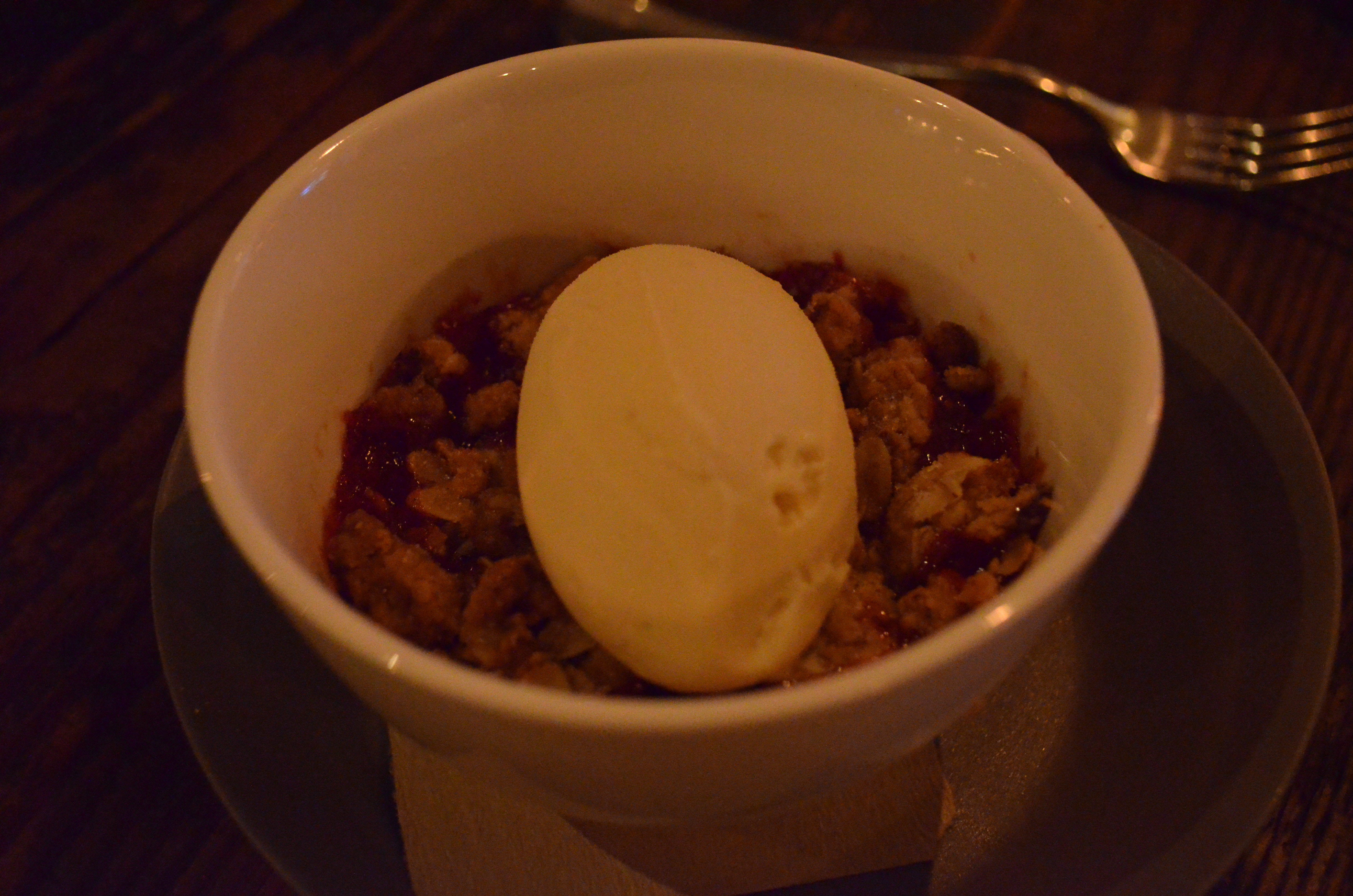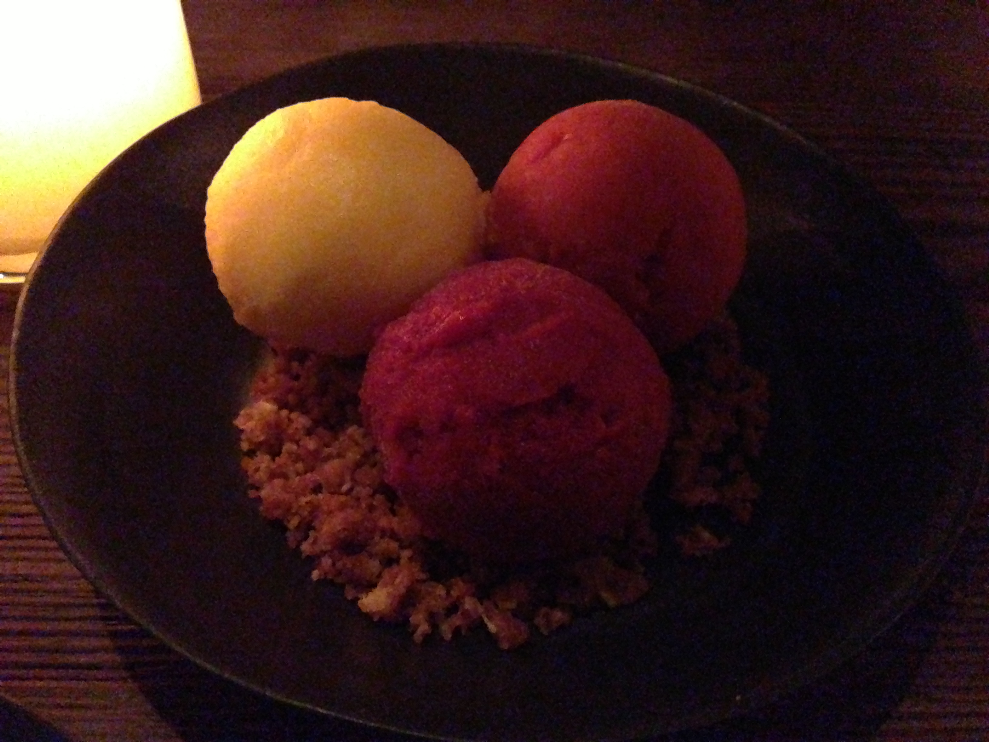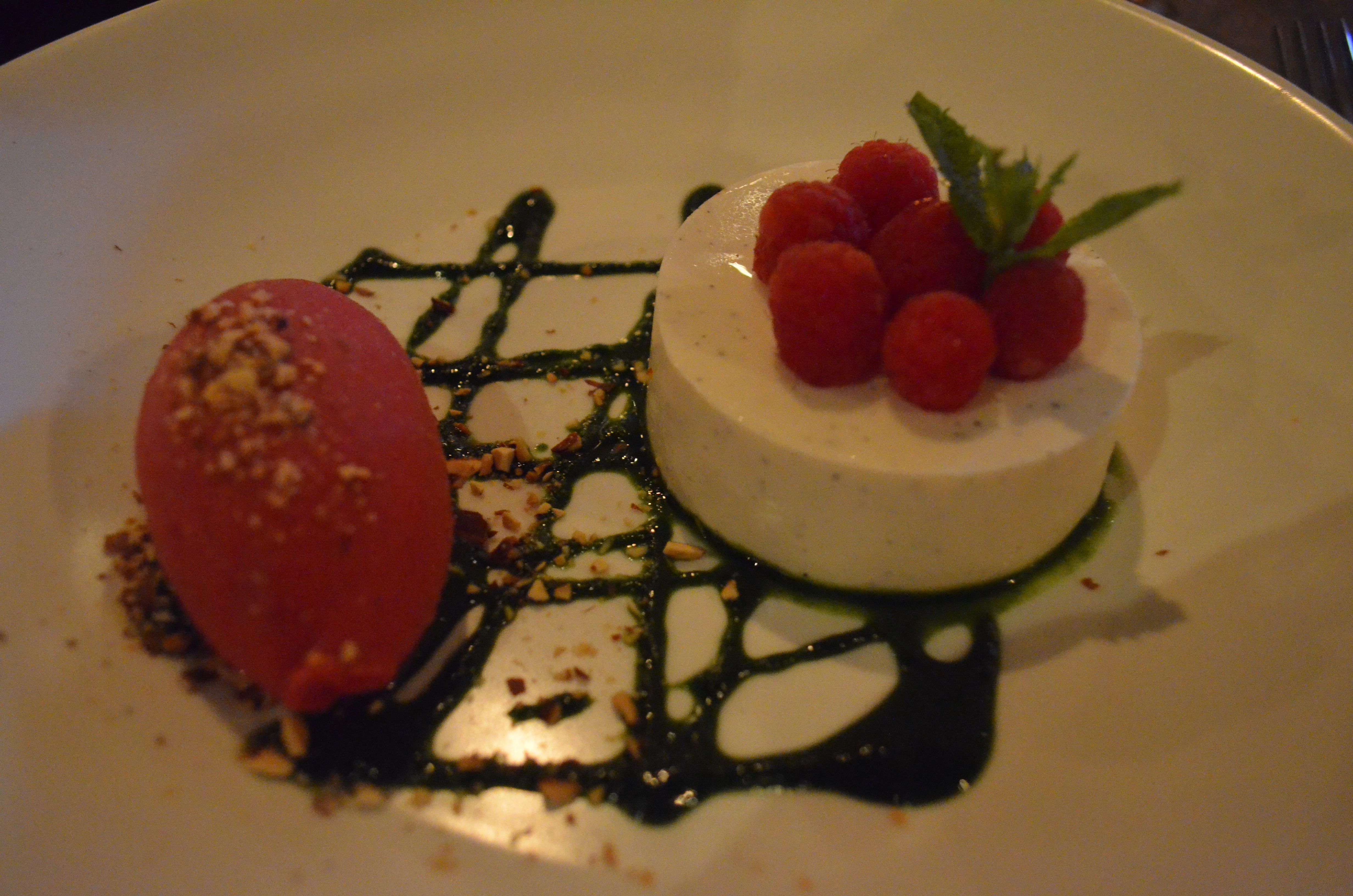 For dessert, strawberry-rhubarb crisp with zabaglione gelato and buttermilk panna cotta with mint syrup and raspberry sorbet. Execution wasn’t an issue, but the flavor combinations weren’t very noteworthy. The housemade gelati and sorbetti, which we got on previous trips here, would’ve been a better choice, especially some citrus-y flavors to cut the fried goodness from the main course.