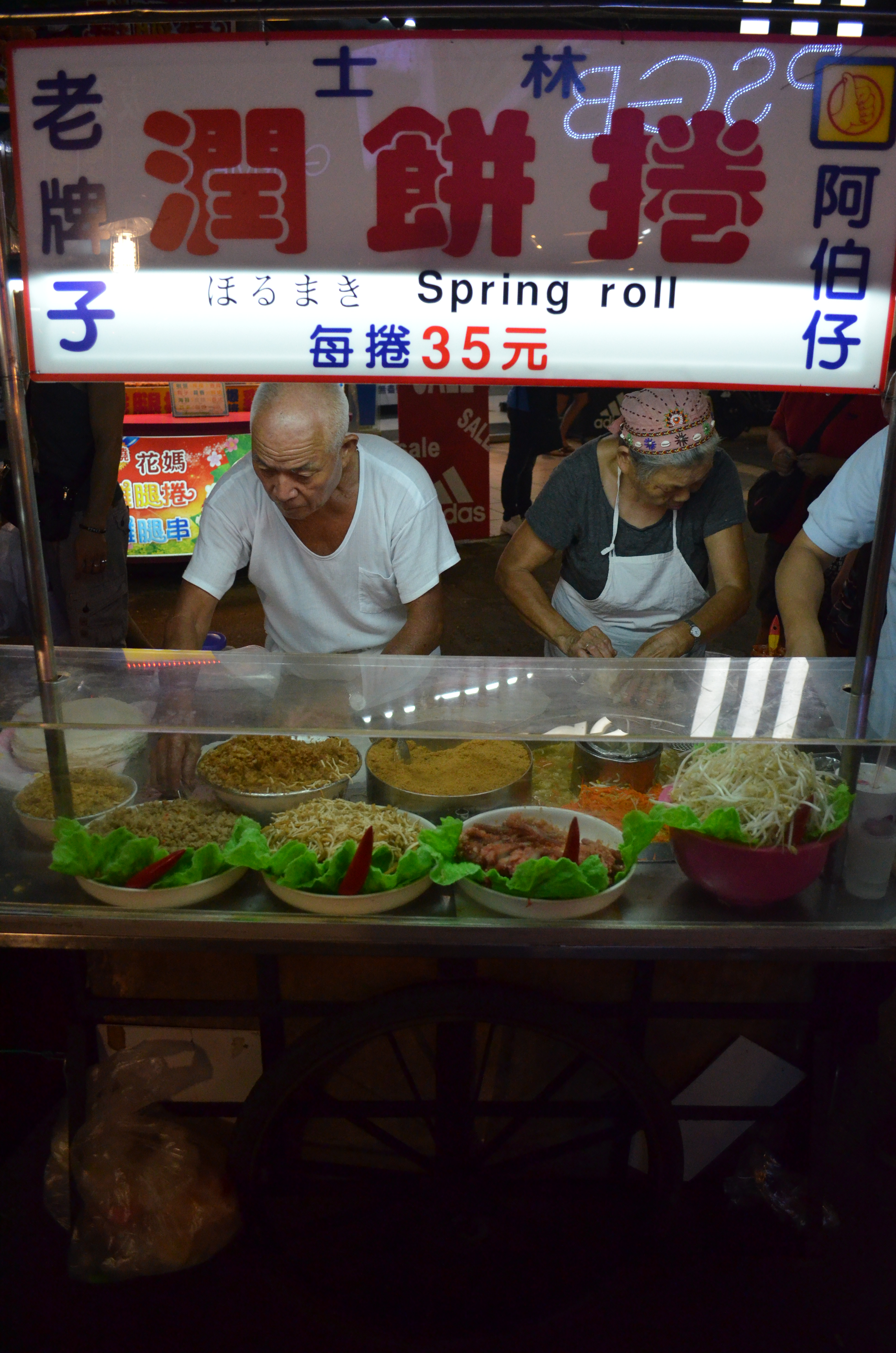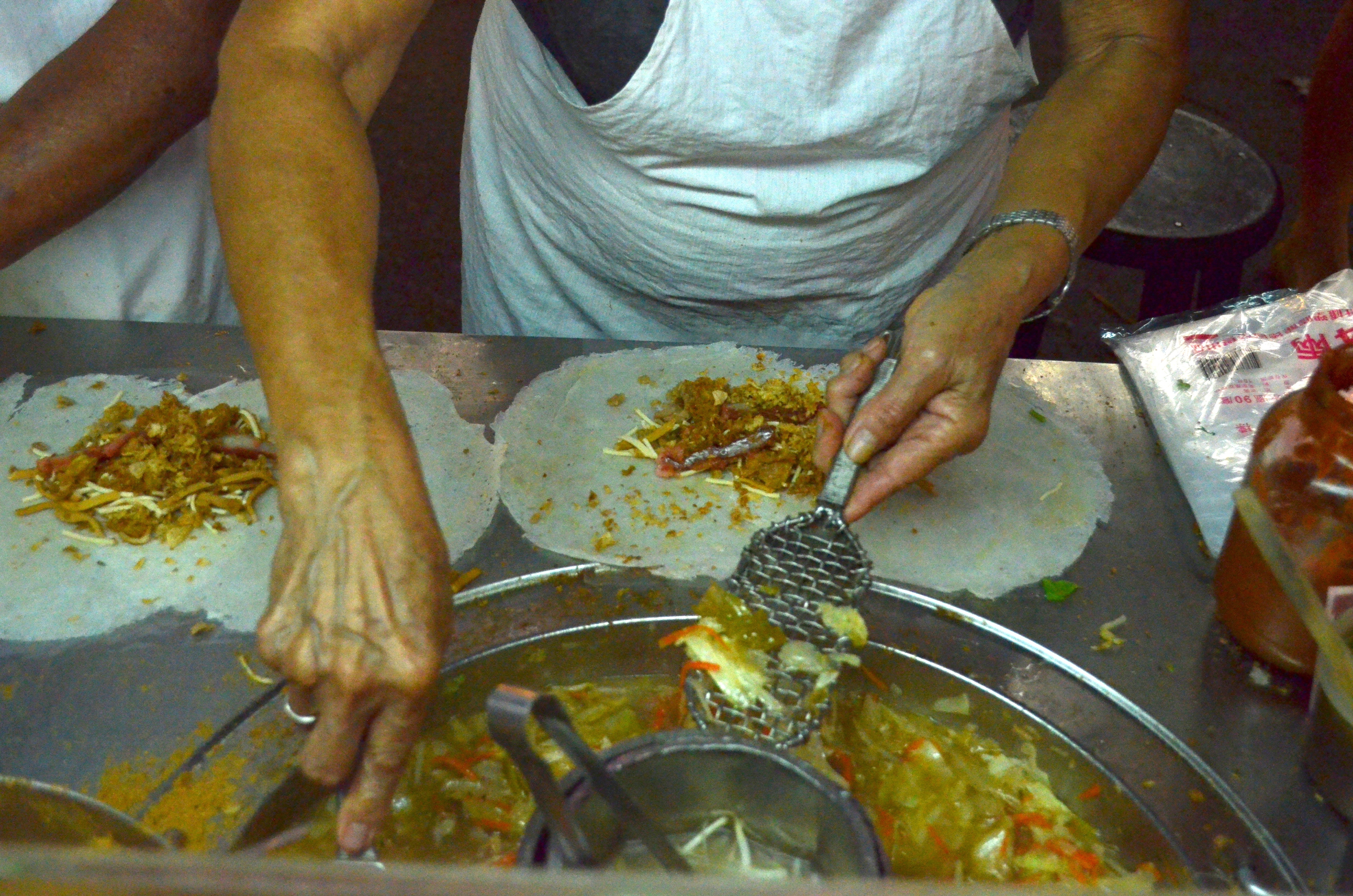 This old couple was making fresh (non-fried) spring rolls, which have a bit more texture and variety in the filling, with raw bean sprouts, chili sauce, crushed peanuts, pickled and stir-fried veggies, etc. I was mostly drawn to the stand by the proprietors, who hardly looked up from their work and hardly spoke to each other but worked in perfect unison.