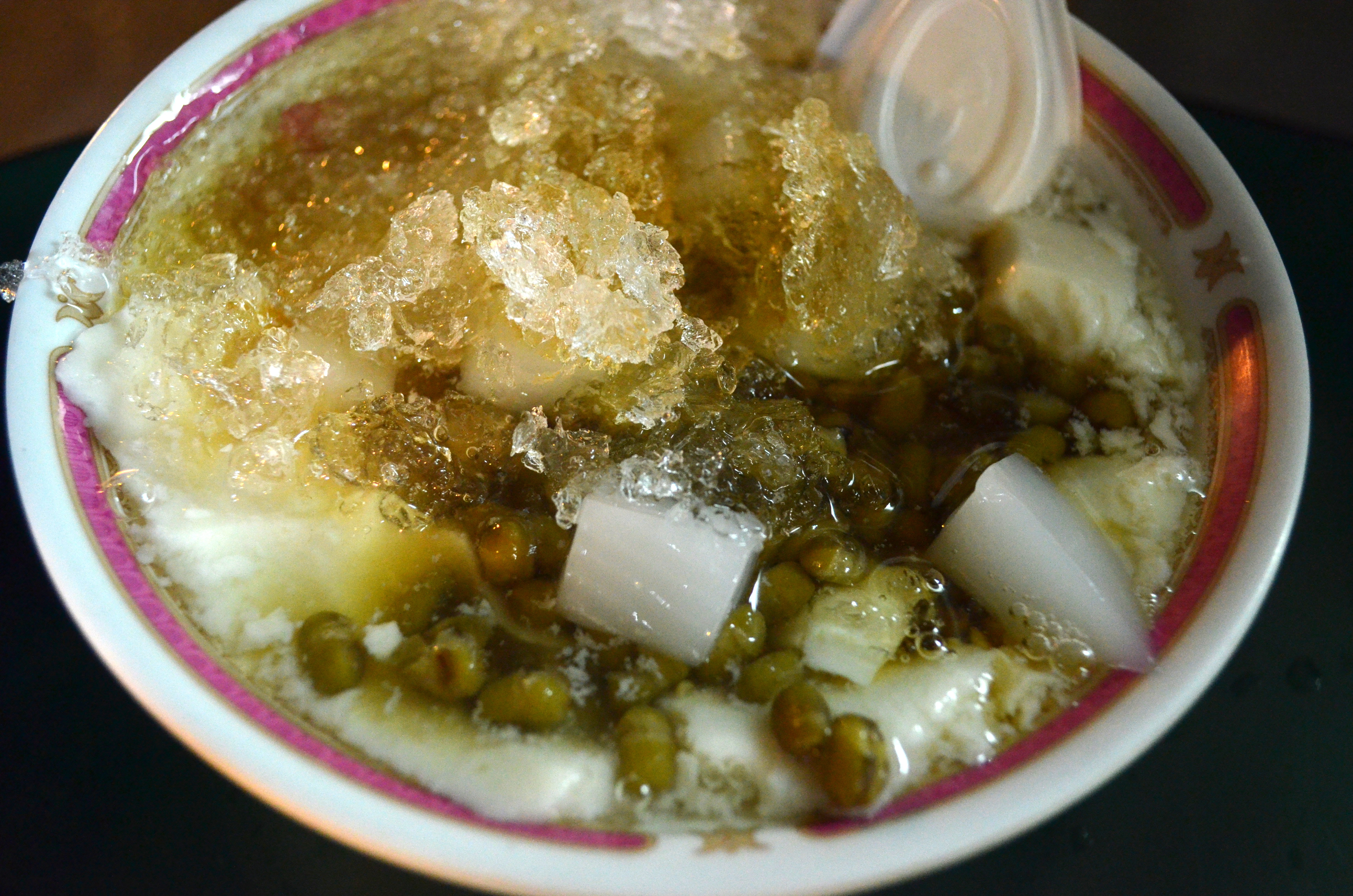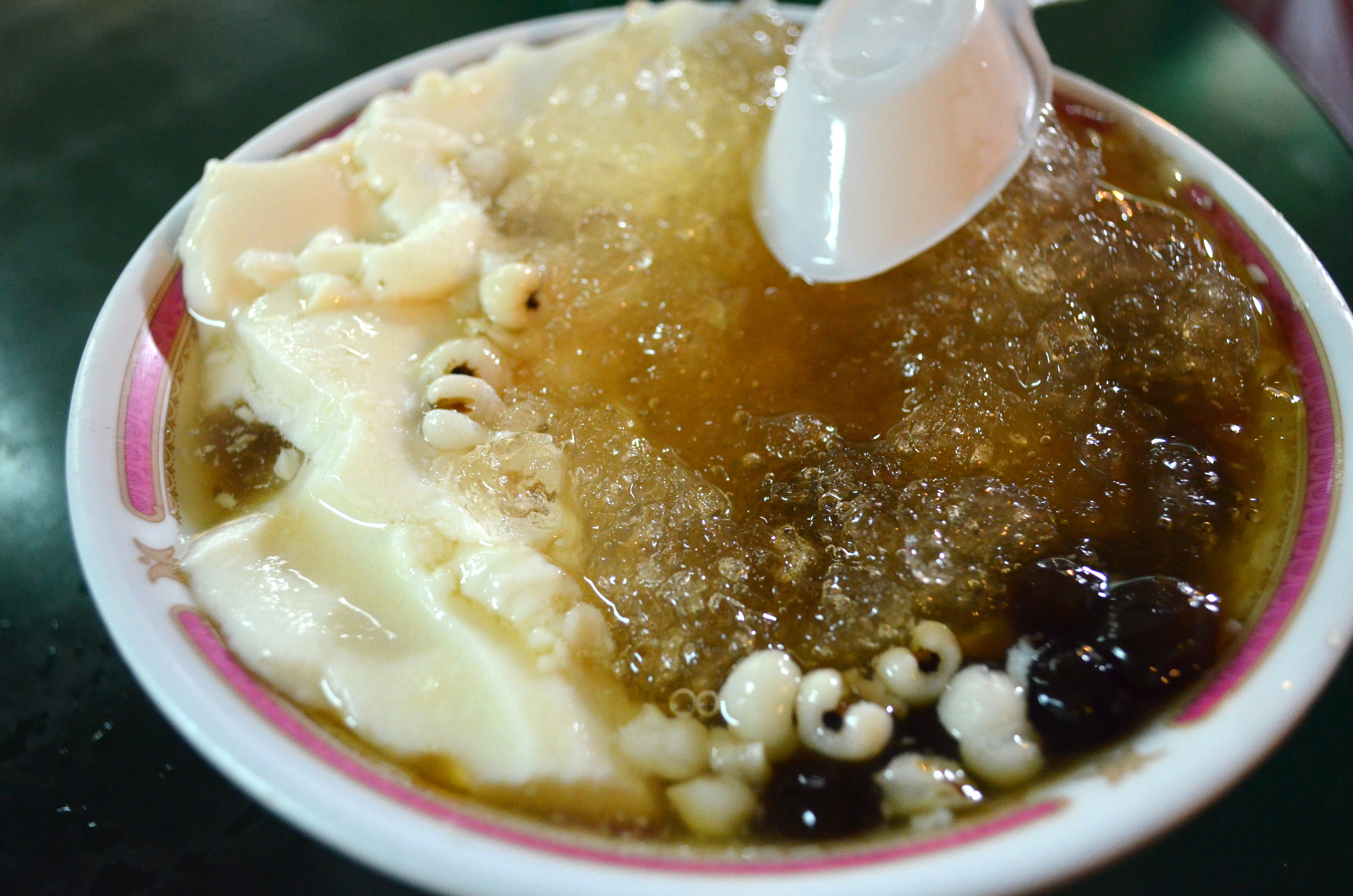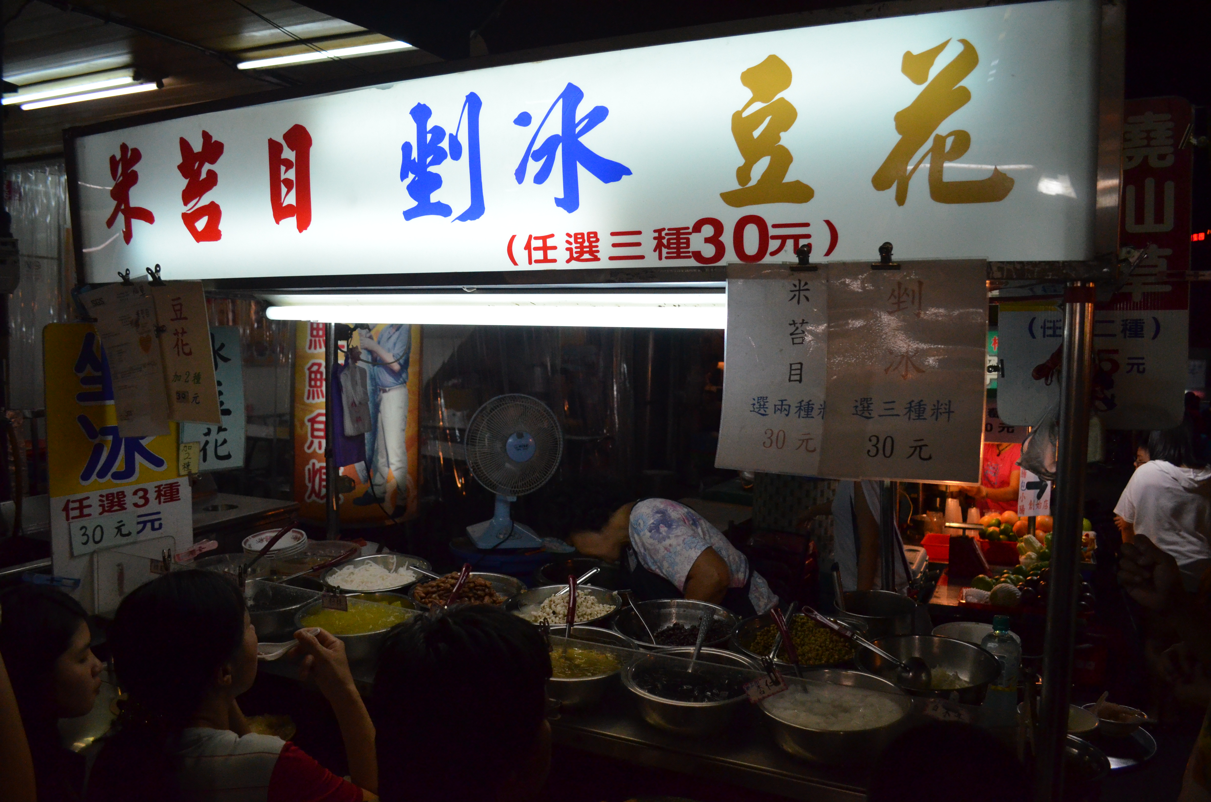 For our last stop, we got two bowls of iced silken tofu (豆花) with a selection of toppings, most of which are exceedingly healthy (e.g., barley, lentils, almond jelly). The owner, a soft-spoken older woman with a kind voice, typically shows up at noon and stays until the market closes, except when it rains.