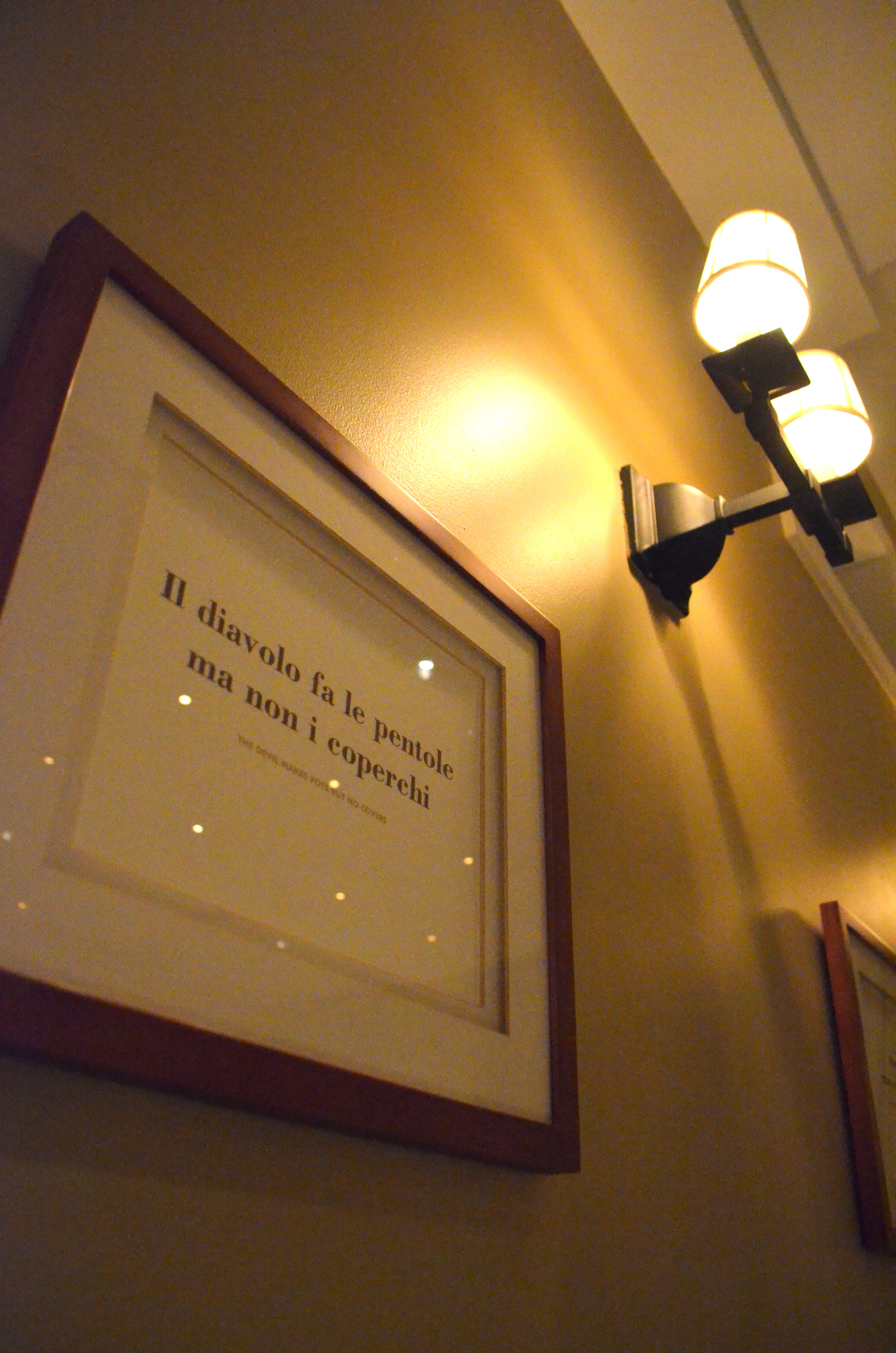 In the transition between our mains and the start of dessert, we noticed the Italian sayings hung along the walls. The devil makes the pot but not the lid. I had to look that one up.