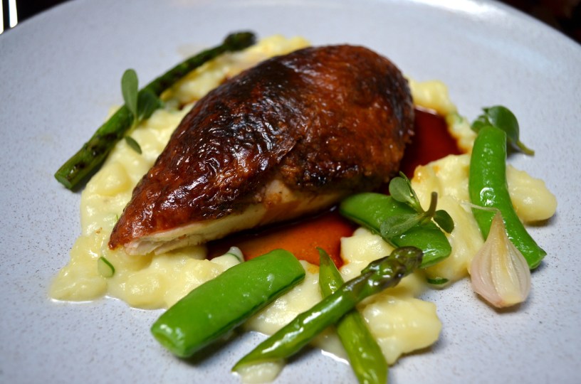 When the chicken came back out, there were two presentations. In one, the breast had been neatly sliced and plated atop mashed potatoes and seasonal greens, with some vinegary halved shallots.