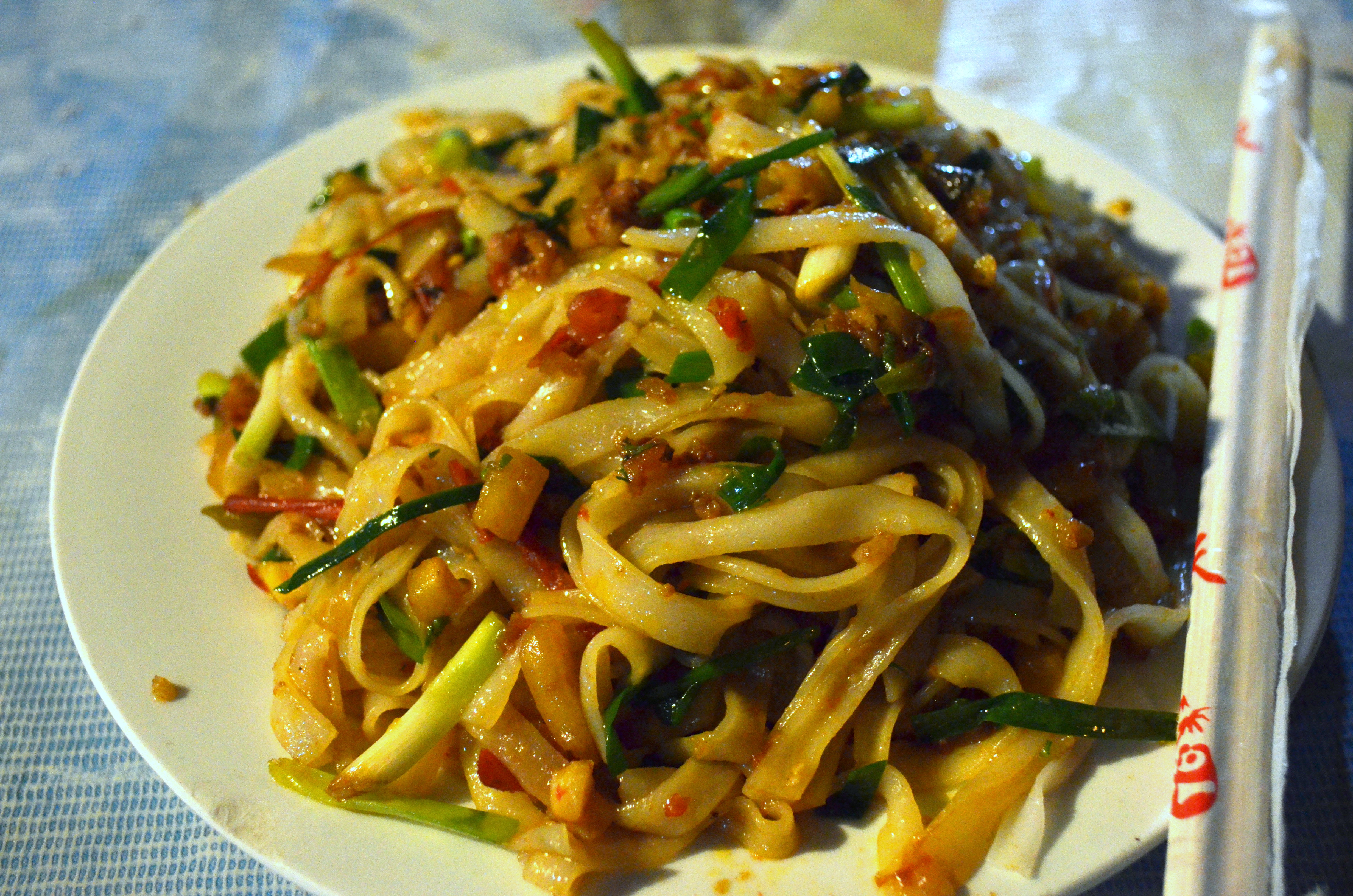 The restaurant didn’t inspire the utmost confidence, but there were a few occupied tables of twos and threes happily munching away, and the spread looked pretty fresh, so I ordered a small batch of things. I went to the convenience store next door to buy a drink, and sat back down for some grilled squid, tofu, and shrimp, along with a plate of Jinghong-style stir-fried rice noodles (like pad thai, but with lemon juice vinegar and ginger and dollops of backfat instead of sweeter citrus).
